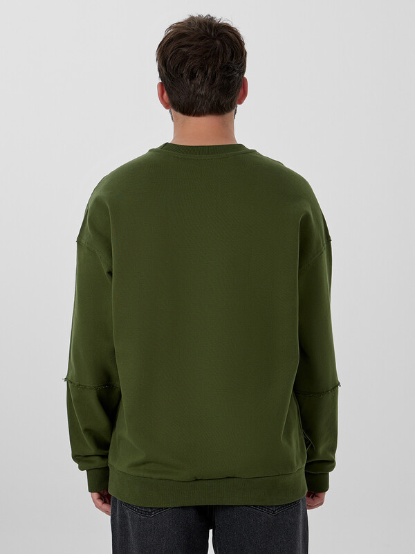 Свободный крой со спущенным плечом и длинные рукава с манжетами из рибаны обеспечивают комфорт. Круглая горловина и пояс по низу дополнены эластичной отделкой для сохранения формы. Швы с эффектом необработанного среза могут незначительно осыпаться — это придает изделию современный винтажный вид.
