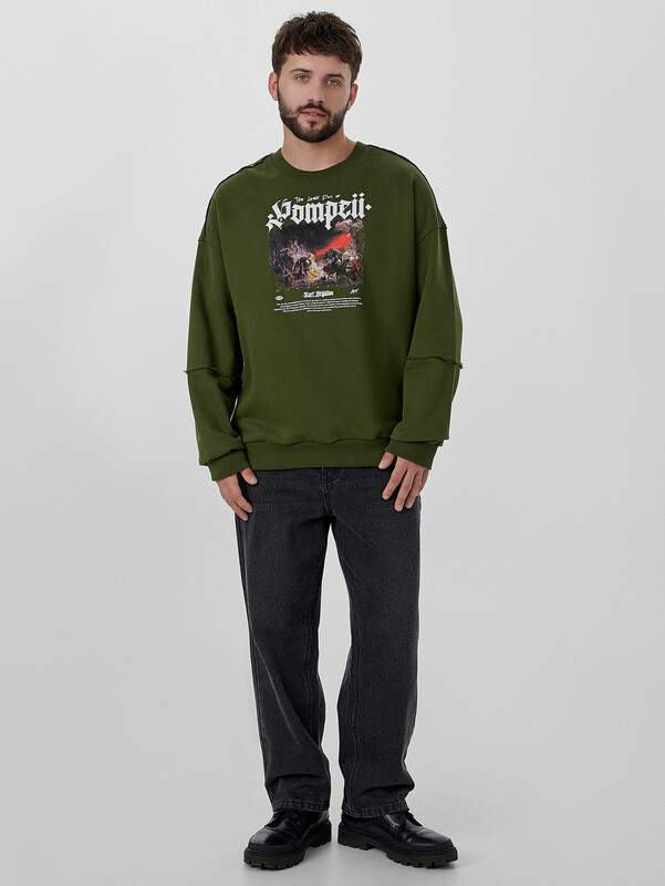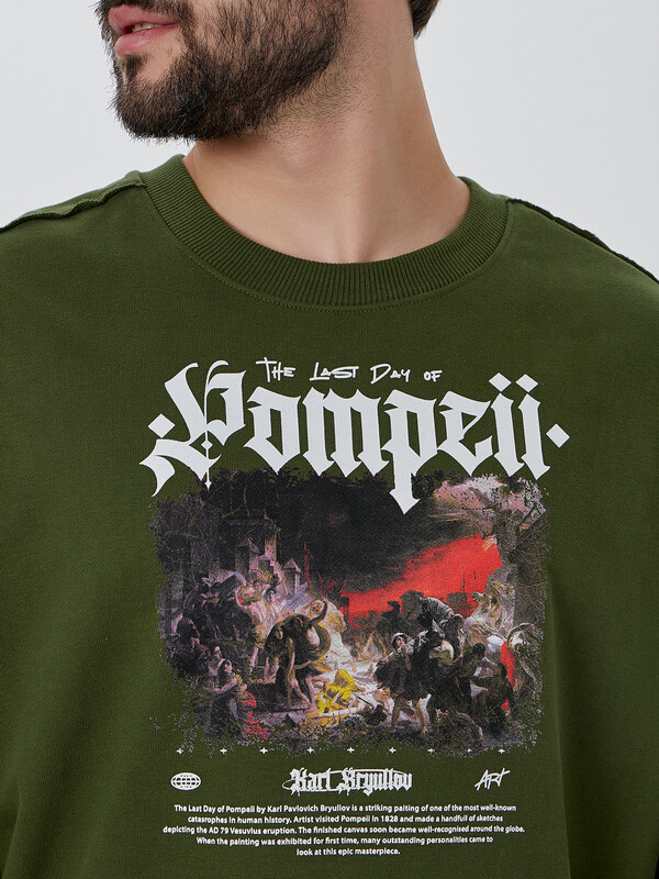 Зеленый мужской свитшот с художественной печатью — для ценителей искусства и стиля. На груди изображена картина «Последний день Помпеи» с надписью на английском языке «The Last Day of Pompeii». Под изображением размещена краткая история создания шедевра.