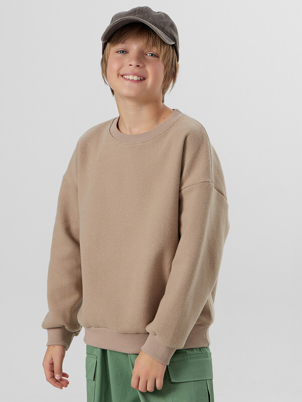Свитшот свободного силуэта. Рукава длинные, втачные. Линия плеча спущена. Перед и спинка цельнокроенные. Горловина круглой формы обработана обтачкой из рибаны. По низу рукавов и джемпера притачены манжеты и пояс из рибаны.