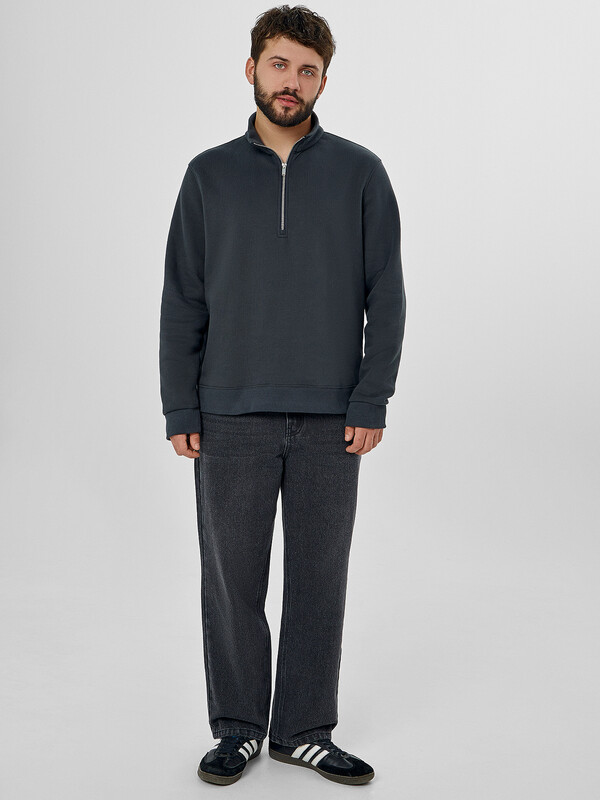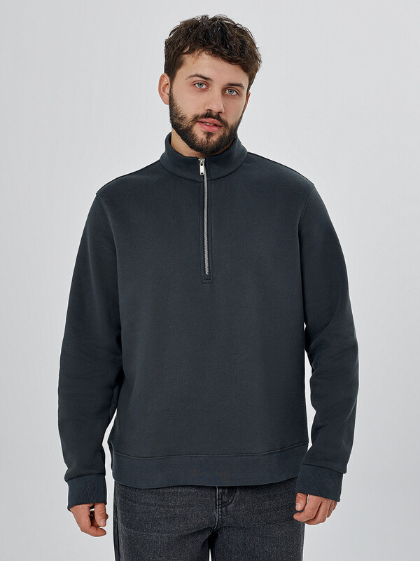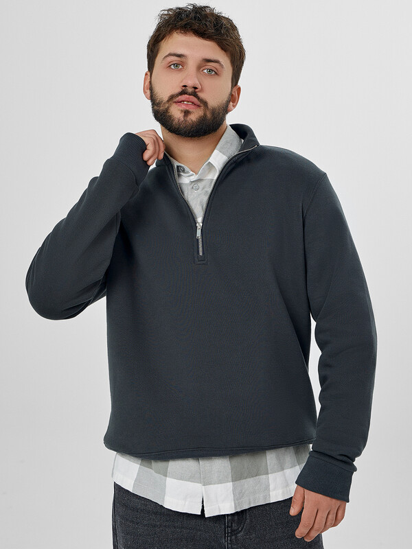 Серый мужской свитшот с застежкой-молнией сочетает удобство классической модели и функциональность толстовки. Свободный прямой крой со слегка спущенной линией плеча обеспечивает комфортную посадку, не стесняющую движений.