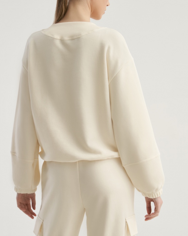Свитшот с отрезной линией по переду и по рукаву. Втачной рукав. Фигурная горловина из рибаны. Низ свитшота на кулиске с фиксаторами для резинки. По низу рукава резинка.