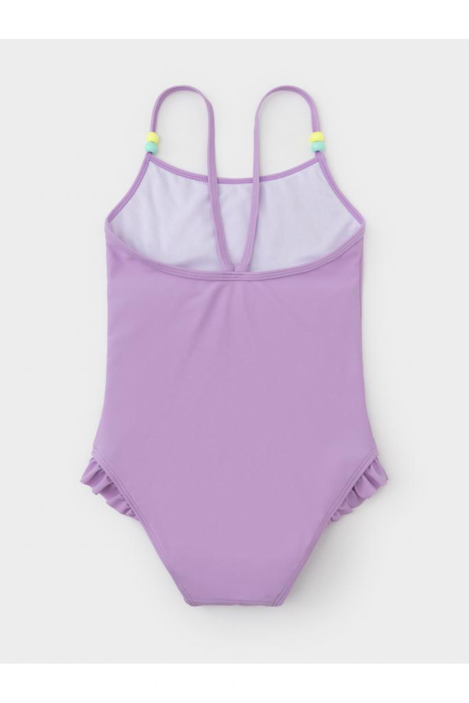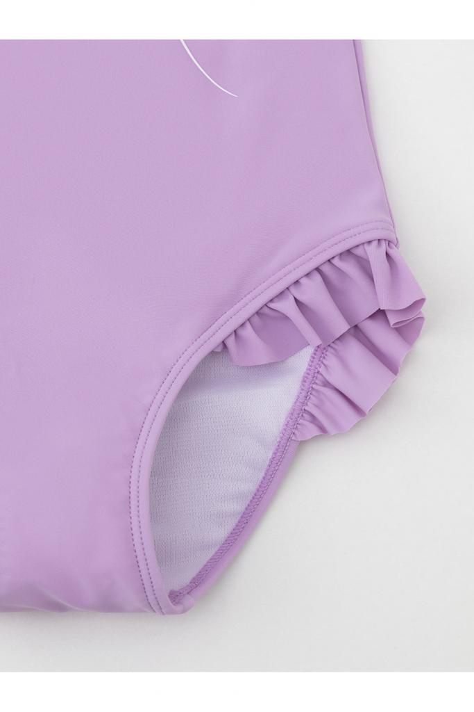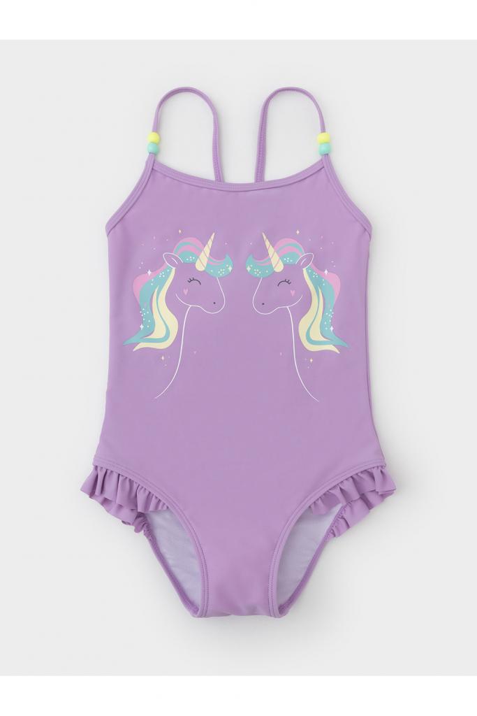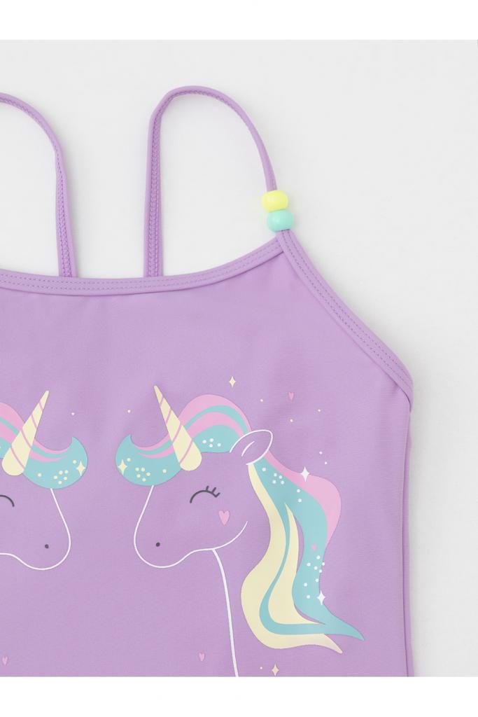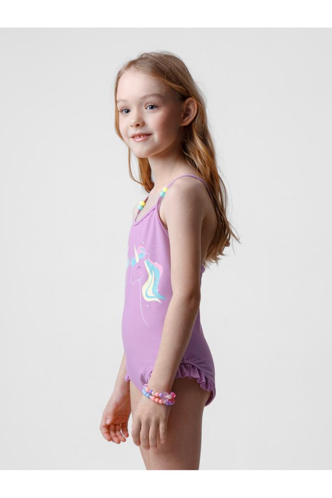 Слитный купальник на бретелях для девочки. Украшен оборками, цветными бусинками и принтом. Внутри подклад. Оригинальный принт выполнен из стойких гипоаллергенных красителей.