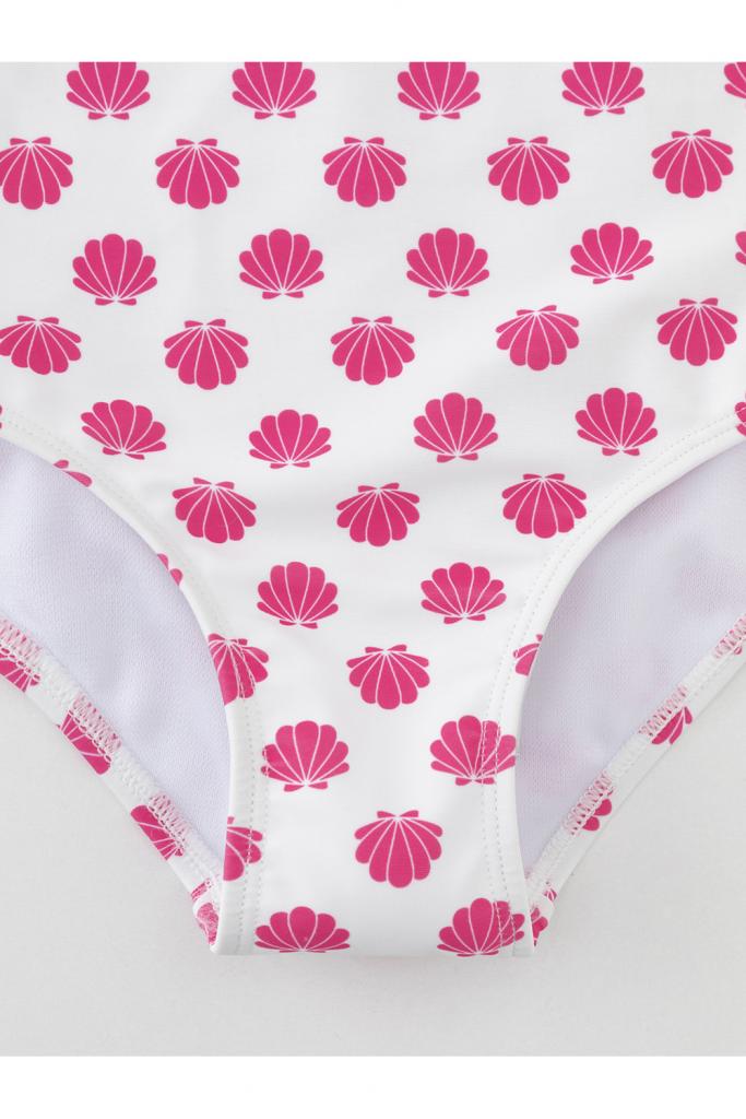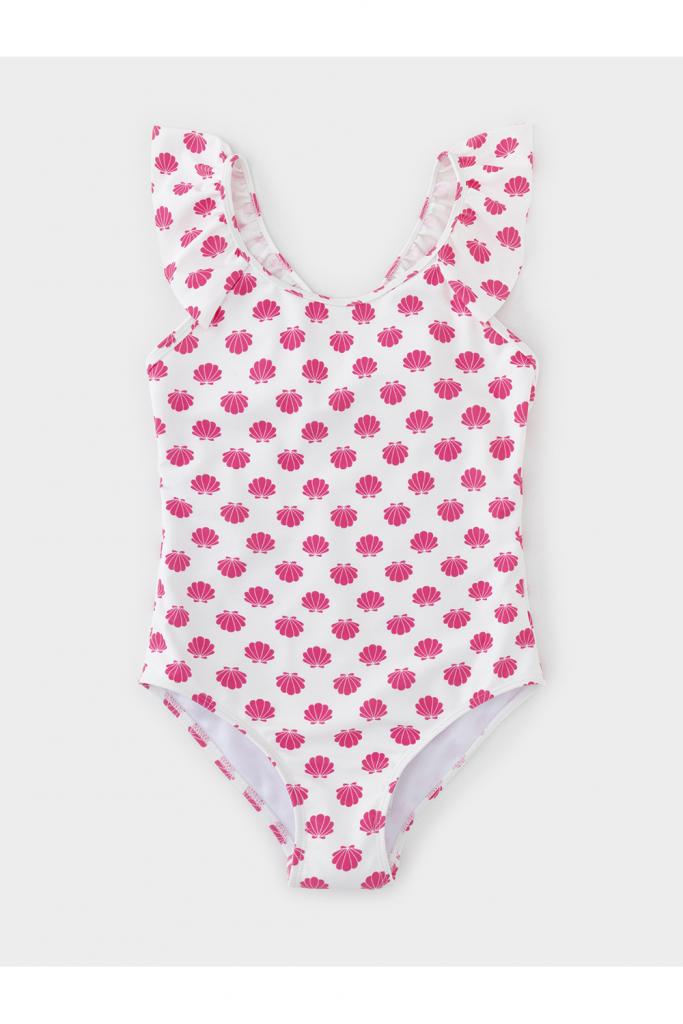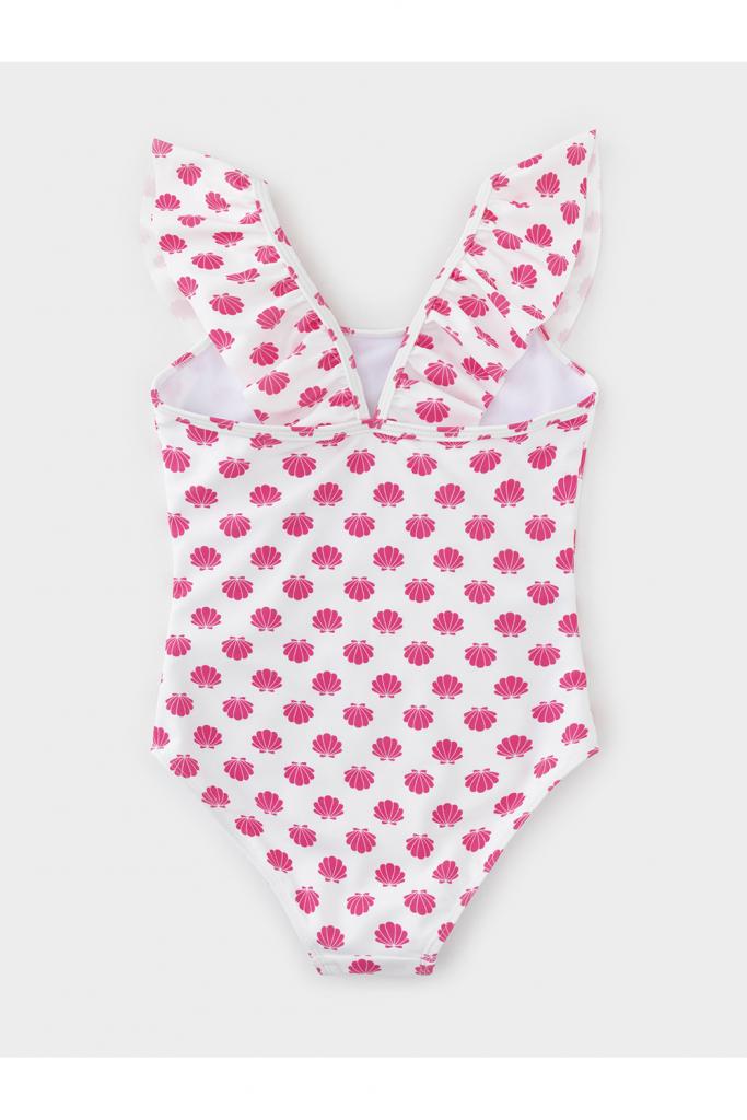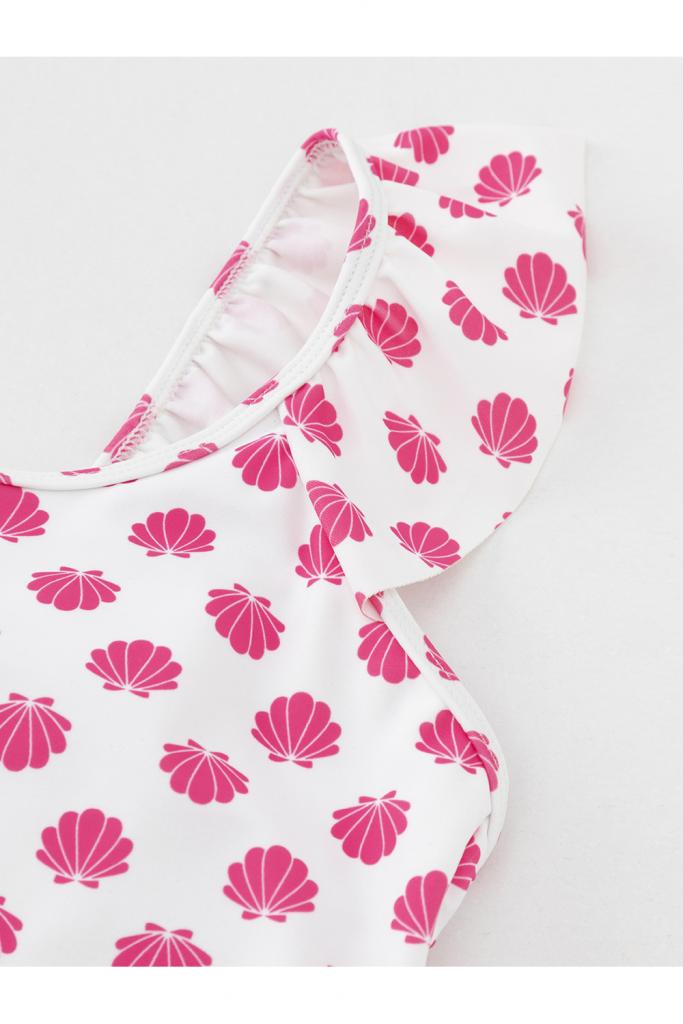Слитный купальник на бретелях для девочки. Украшен оборками. Внутри подклад. Оригинальная набивка выполнена из стойких гипоаллергенных красителей.