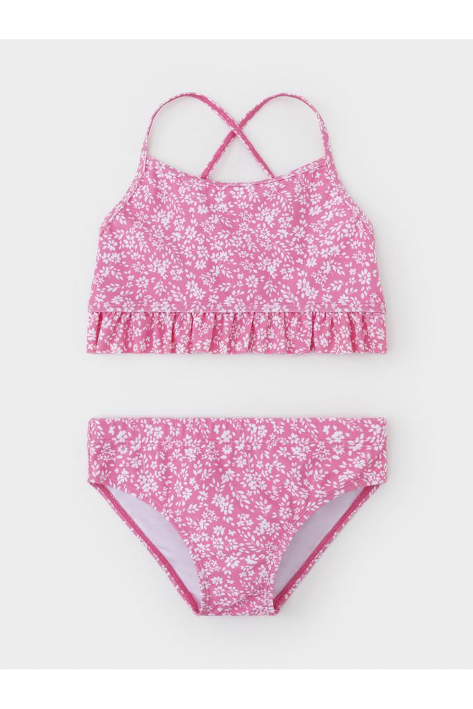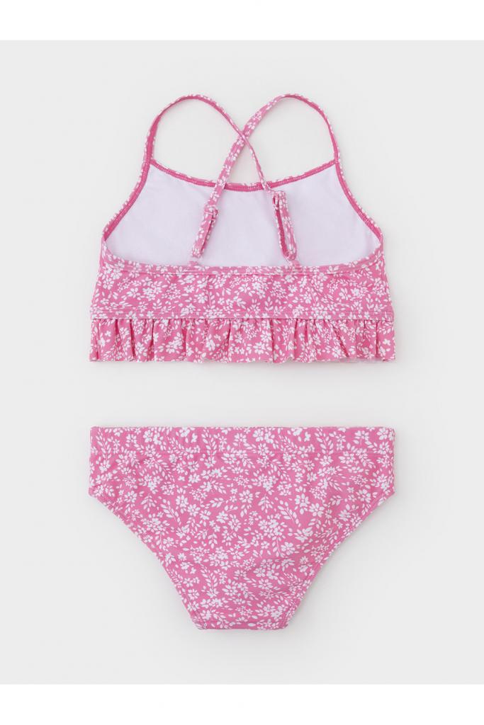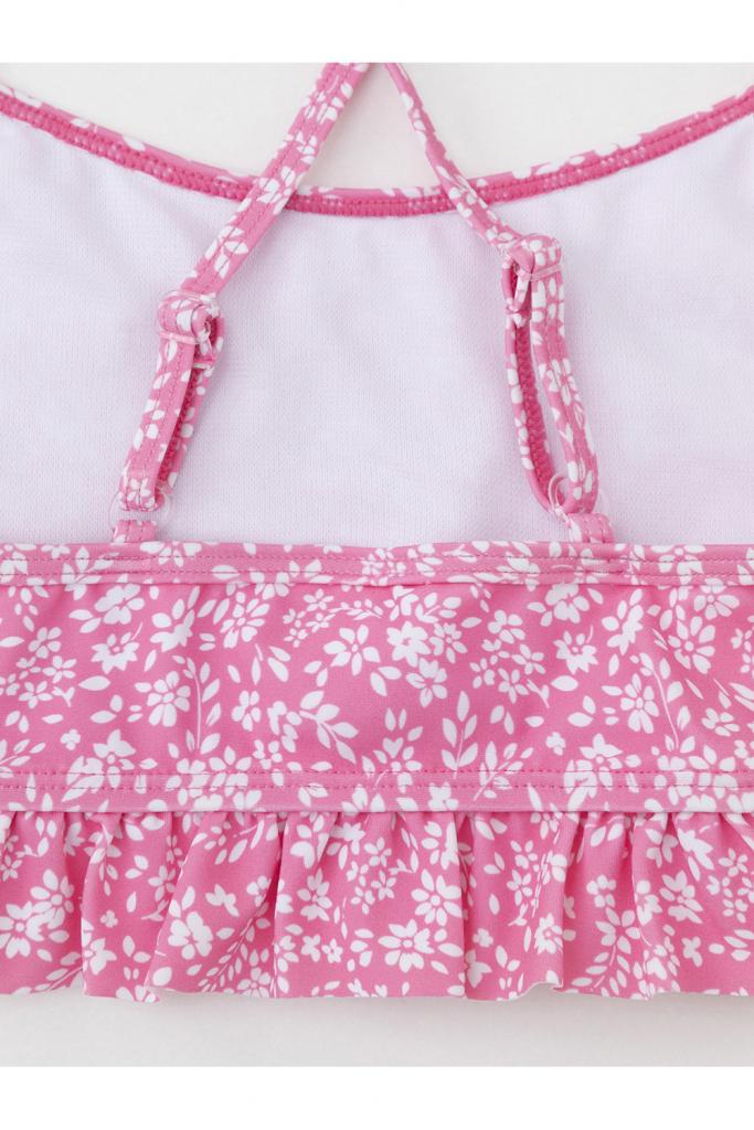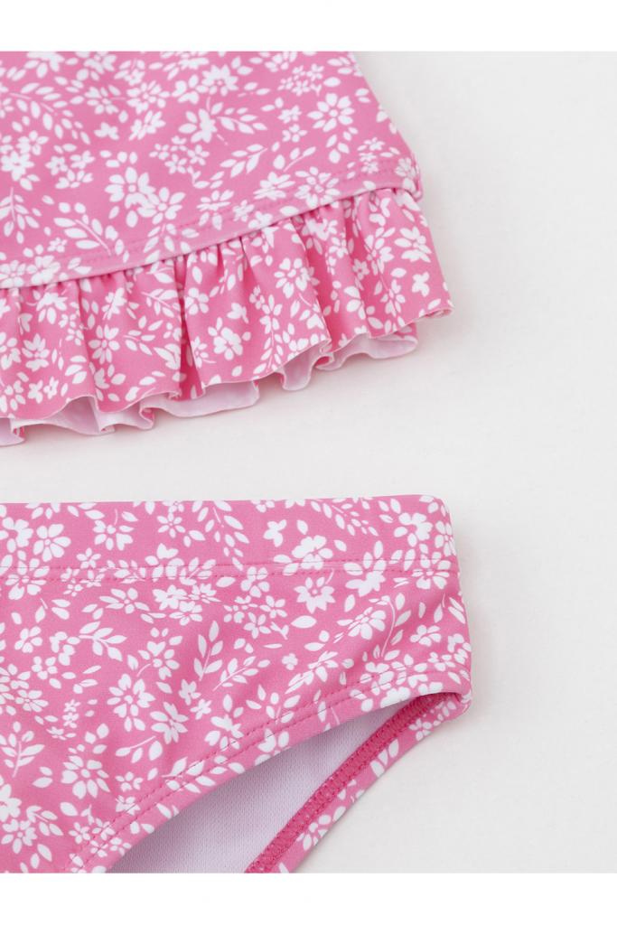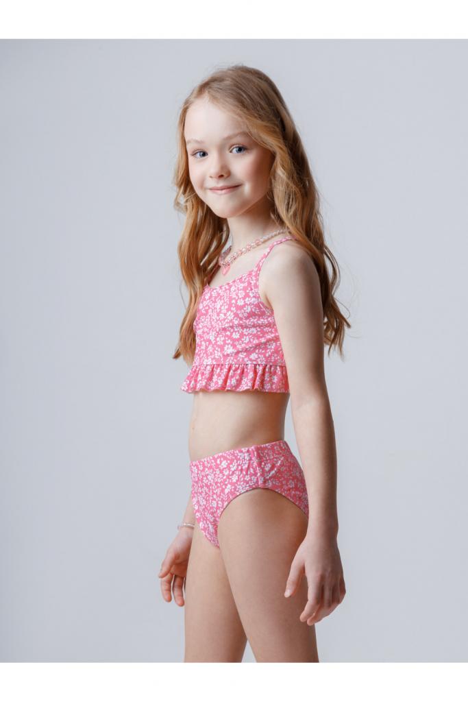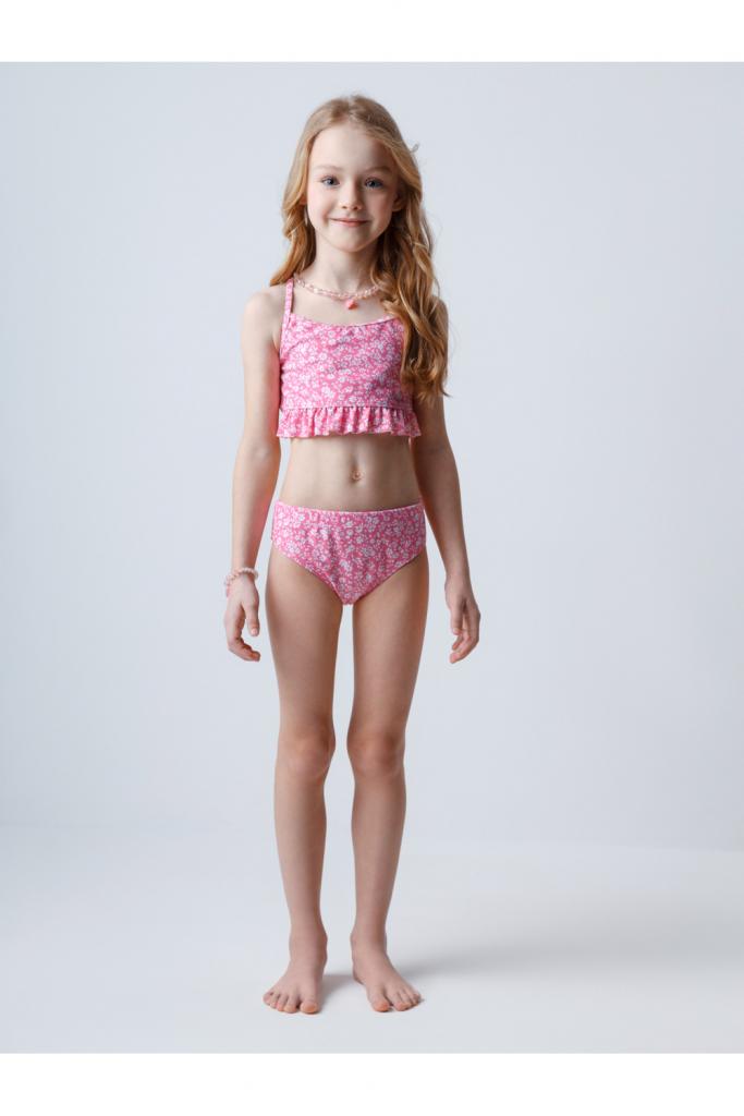 Раздельный купальник для девочки. Топ на регулируемых бретелях и плавки на эластичной резинке. Украшен оборками. Оригинальная набивка выполнена из стойких гипоаллергенных красителей.