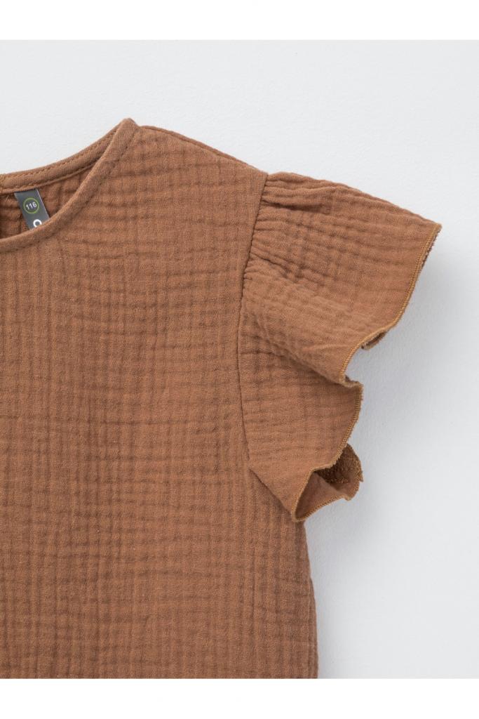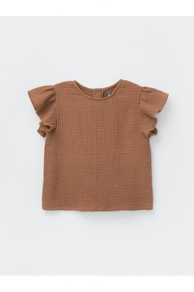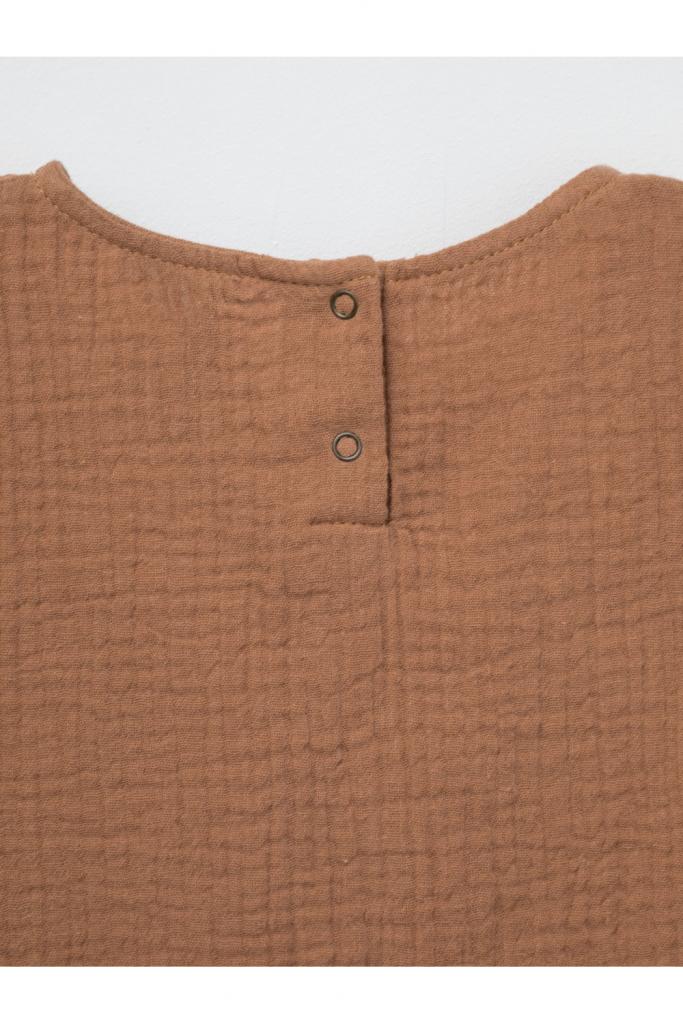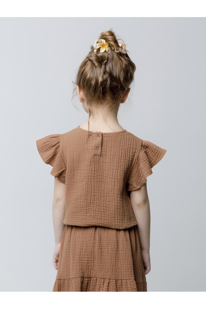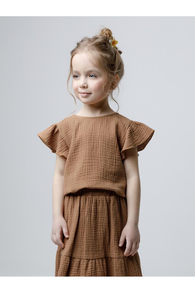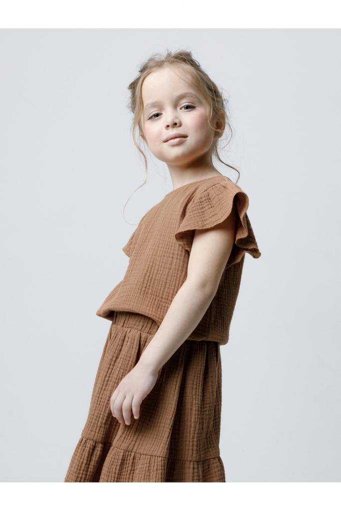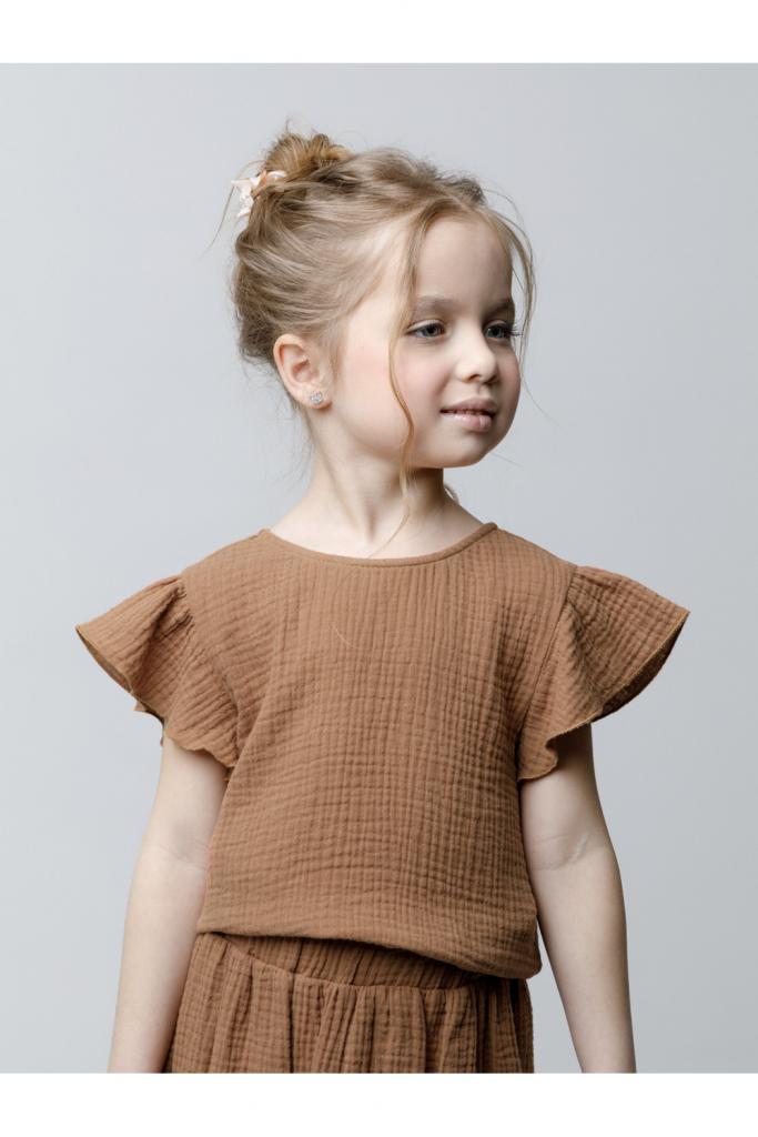 Укороченный топ для девочки из мягкого хлопокового муслина. По спинке застежка на кнопки. Изделие сохраняет цвет, форму и фактуру жатости после многократных стирок.