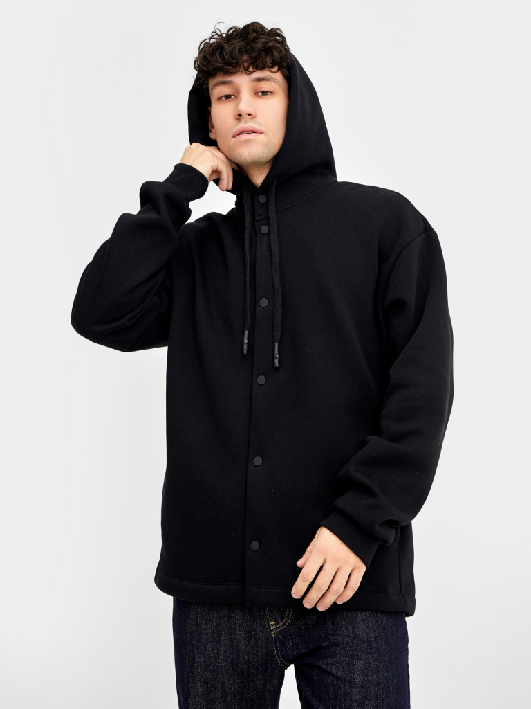 Стильный и уютный жакет мужской из трикотажного полотна футера. Модель толстовки прямая свободная, оверсайз. Рукава втачные длинные, с отрезными манжетами из рибаны. Плечо спущено. Горловина округлой формы с капюшоном. Капюшон цельнокроеный с подкладкой. На внешней стороне пробиты петли и втянут шнур с застроченными концами. Спереди выполнена центральная застежка на кнопки, верхняя кнопка располагается на капюшоне. В боковых швах есть карманы. Комфортная модель для создания лаконичных городских образов. Рекомендуем дополнить низом в тон из линейки базовой одежды для мужчин. Ваш лучший вариант на зиму, осень и демисезон!