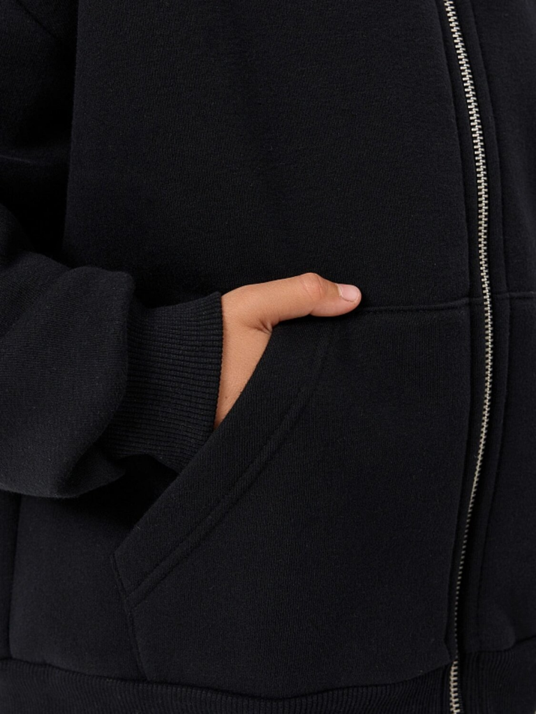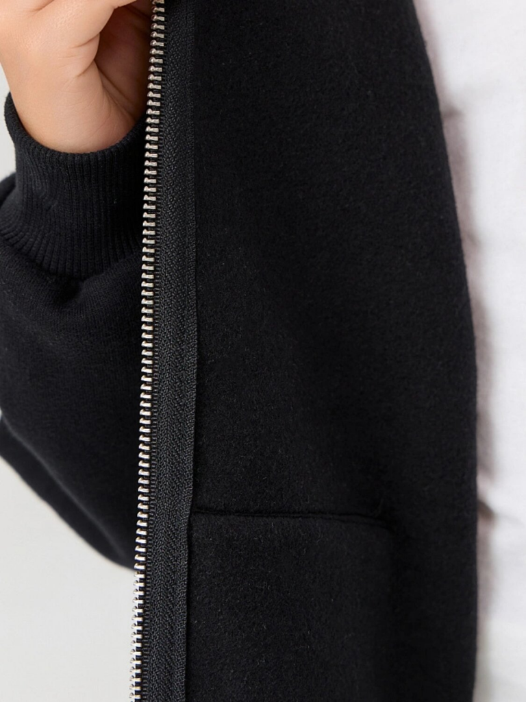 Рукава втачные длинные, плечо спущено. По низу рукава отрезная манжета из рибаны. Центральная застежка на тесьму молнию. По переду накладные карманы кенгуру.