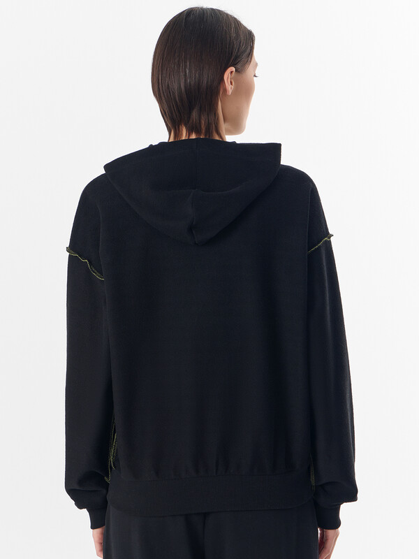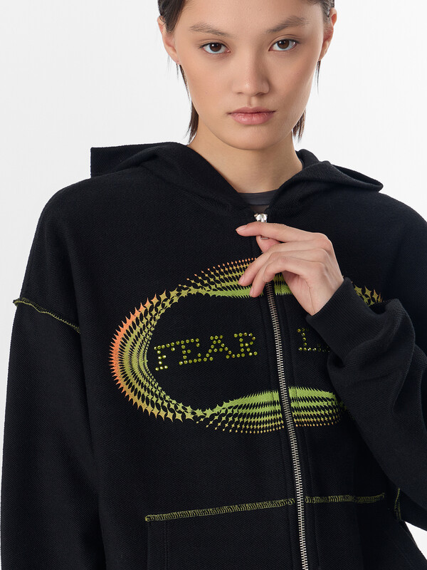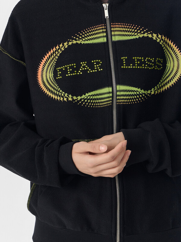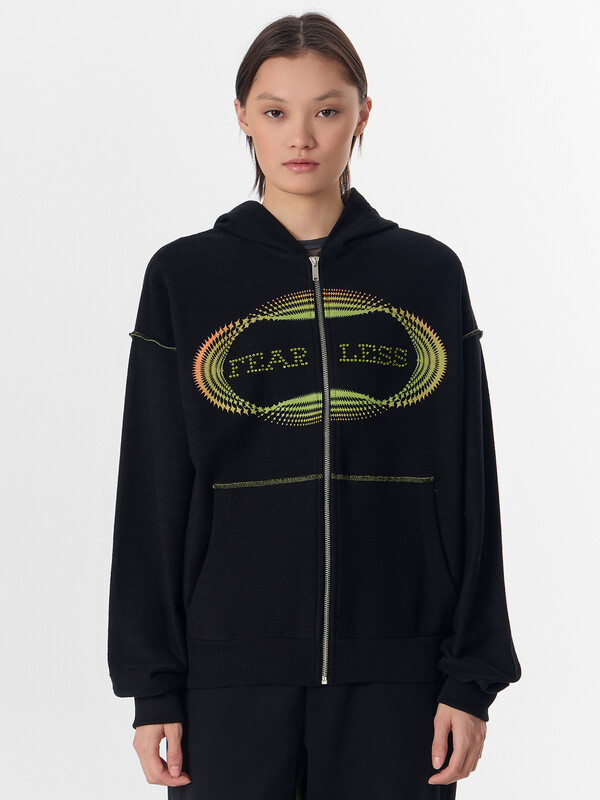 Черная толстовка с надписью «Бойся меньше» из коллекции Gentle Touch сочетает в себе продуманный дизайн и повседневный комфорт. Модель выполнена из мягкого футера с пич-эффектом, который создает приятную бархатистую текстуру и обеспечивает тактильное удовольствие при носке.