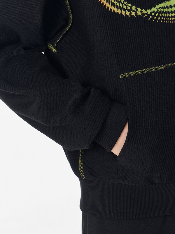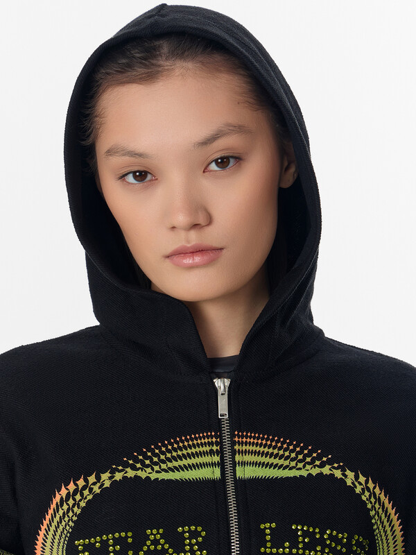 Свободный крой со спущенным плечом и цельнокроеными деталями обеспечивает полную свободу движений. Практичные элементы — эластичные манжеты и пояс из рибаны, удобная центральная молния и вместительные карманы — делают толстовку функциональной для активного дня.