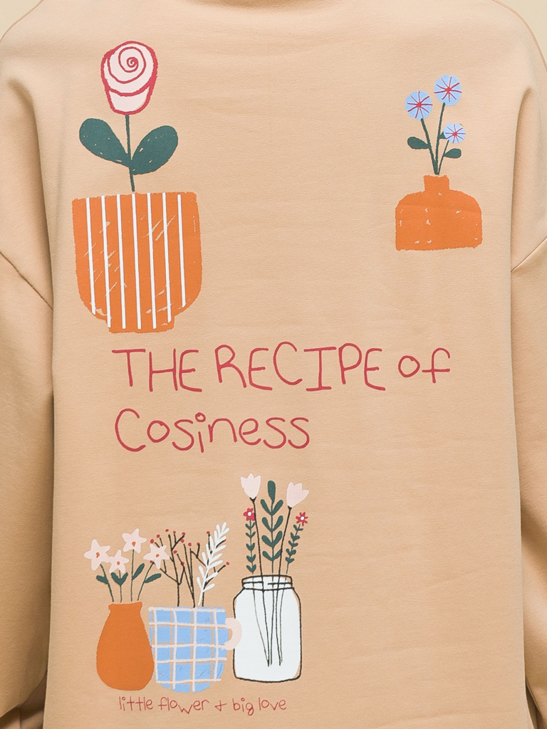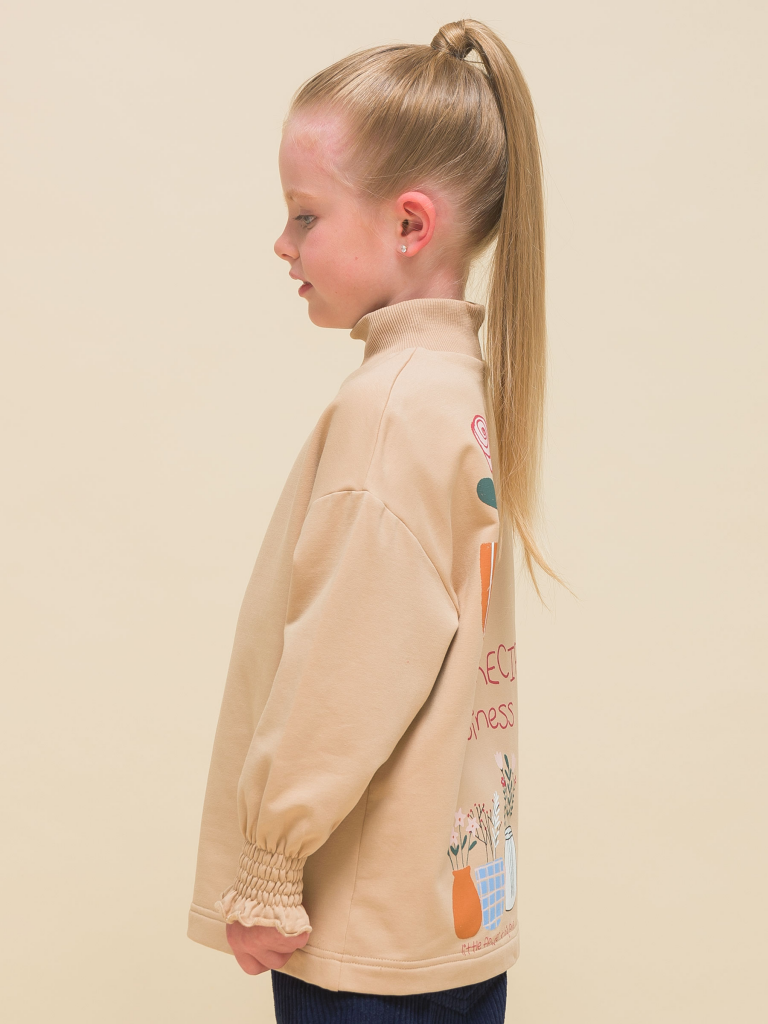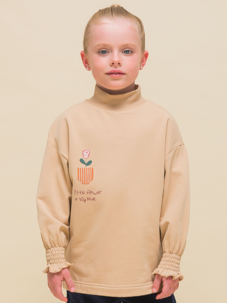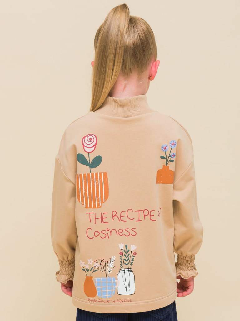 Детский свитшот для девочки из футера с начесом. Толстовка трендового свободного кроя со спущенным плечом подарит ребёнку комфорт и свободу движений. Оверсайз-свитшот дополнен воротником-стойкой, который обеспечивает дополнительную защиту шеи от холода и ветра. Воротник выполнен из эластичной рибаны (ткань в рубчик) — он прекрасно тянется, ребёнку удобно надевать и снимать свитшот, при этом воротник отлично сохраняет форму. Низ рукавов собран на тонкую резинку в несколько рядов, что придаёт изделию элегантности и женственности. Джемпер неприхотлив в уходе. В составе ткани преобладает высококачественный хлопок — свитшот мягкий и великолепно пропускает воздух — кожа ребёнка дышит. Благодаря эластану изделие сохраняет первоначальную форму в течение долгого времени. Свитшот с принтом по переду и спинке. Милый принт с уютным настроением изображает вазочки с цветами, надпись переводится: «рецепт уюта: маленькие цветочки + большая любовь». Принты эластичные и прочные — без проблем переносят многочисленные стирки. Джемпер выполнен в нежном бежевом цвете, его просто комбинировать с любыми брюками, легинсами, джинсами. Размерная линейка: 2 (92): 3 (98): 4 (104): 5 (110): 6 (116): 7 (122): 8 (128): 9 (134): 10 (140): 11 (146). Свитшот с начёсом подходит девочкам дошкольного возраста, младшим школьницам и девочкам-подросткам. Его можно носить в детский сад, на прогулки, во время отдыха, а также дома. Свитшот детский идеален для круглогодичного применения: летом, осенью, зимой, весной и демисезон. Это стильный и практичный подарок дочери, внучке или сестре на Новый год и любой другой праздник.