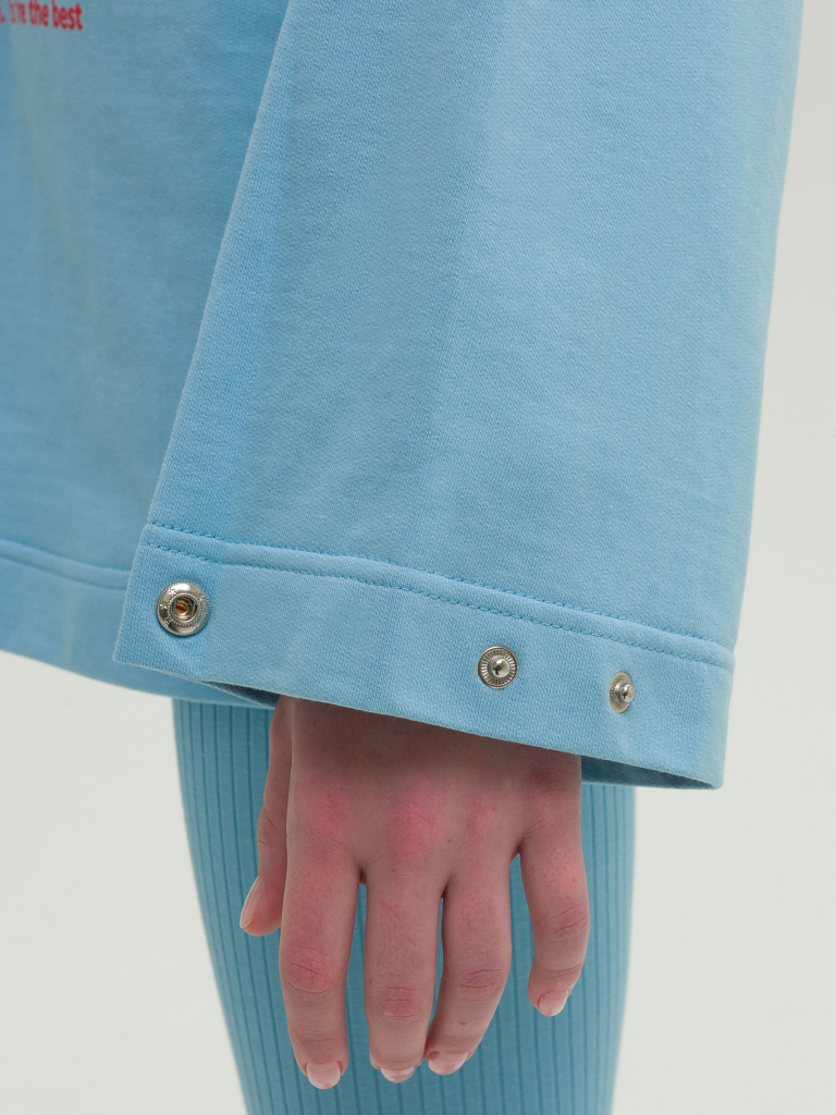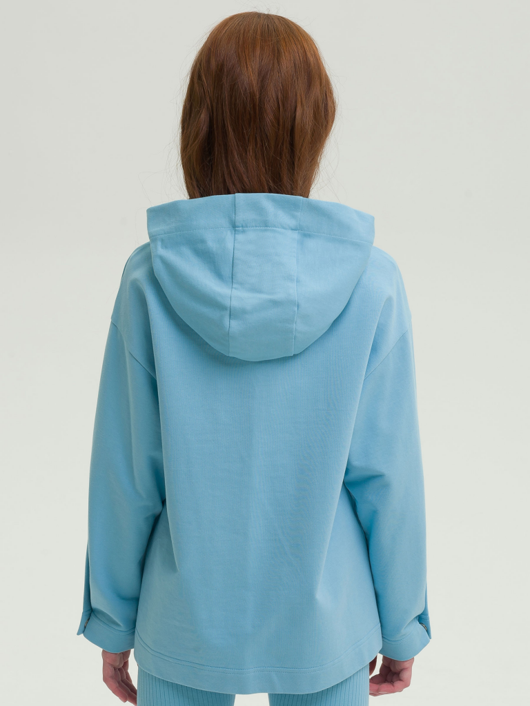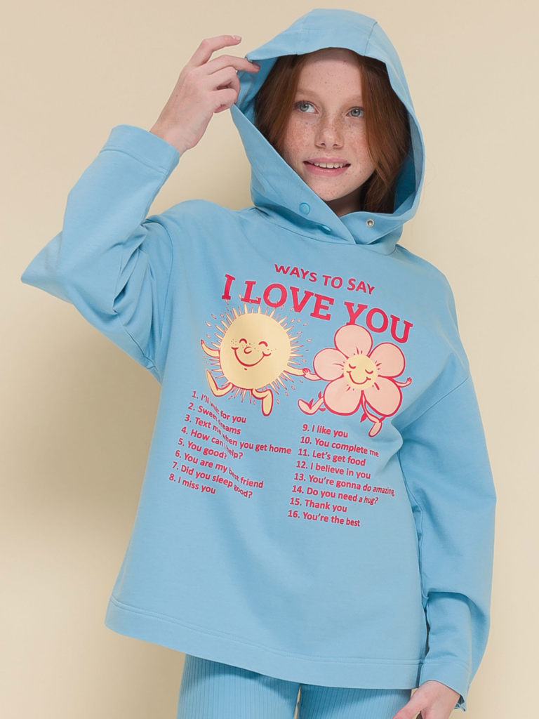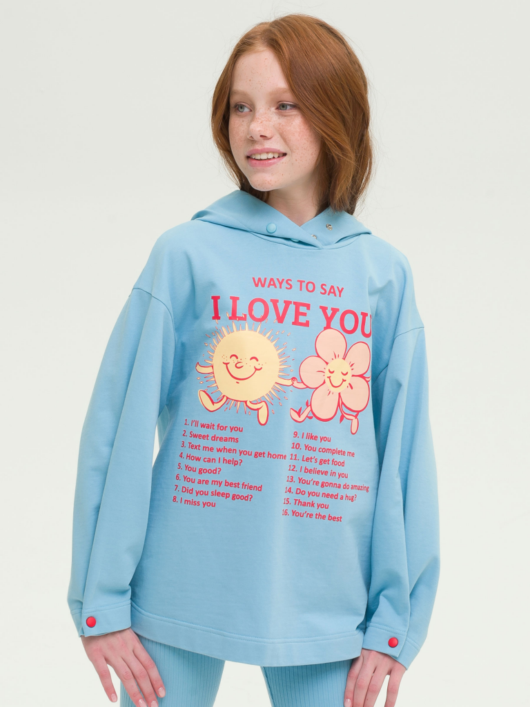 Худи оверсайз из футера для девочки. 100% хлопок в составе – ткань мягкая, дышащая, приятная на ощупь. Прямые широкие рукава, спущенное плечо и свободный крой – настоящий трендовый оверсайз. Теплый и удобный капюшон – застегивается на горловине на одну или две кнопки на выбор. Объем рукава регулируется кнопками – легко и просто менять одним движением. Яркий цветной принт спереди для позитивного настроения. Худи составляет гармоничный дуэт с джоггерами или велосипедками. Идеально для активного детства – на каждый день, для учебы и занятия спортом.