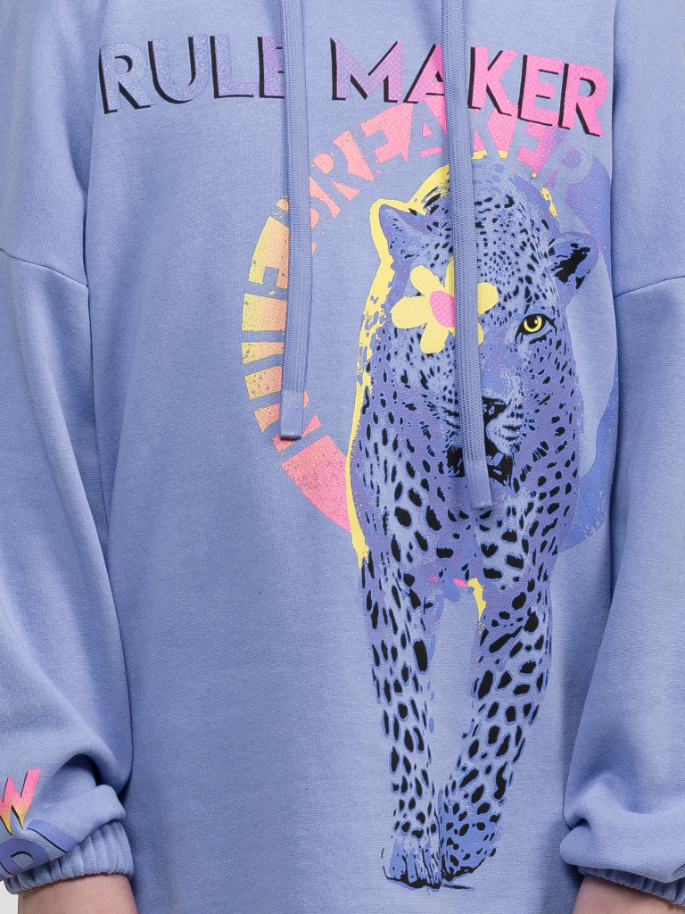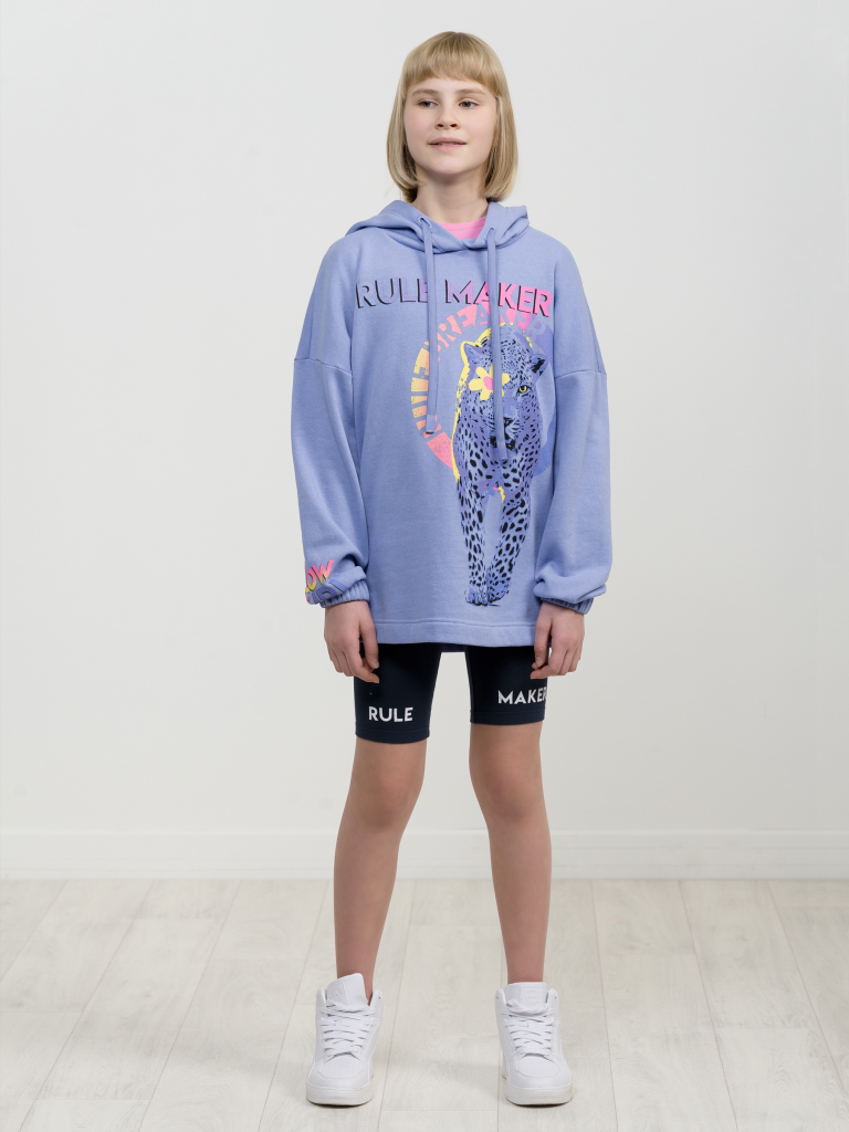 Свободное удлиненное худи оверсайз силуэта из футера с начесом. Сильно спущенное плечо, широкий рукав на манжете с внутренней широкой резинкой. Капюшон двухшовный с люверсами и утяжкой в виде шнурка с новой обработкой концов. Стойкий эластичный неоновый принт с блестками. Перевод Тот, кто создает правила. Тот, кто нарушает правила. На правом рукаве неоновый принт. Перевод Светящаяся девочка.