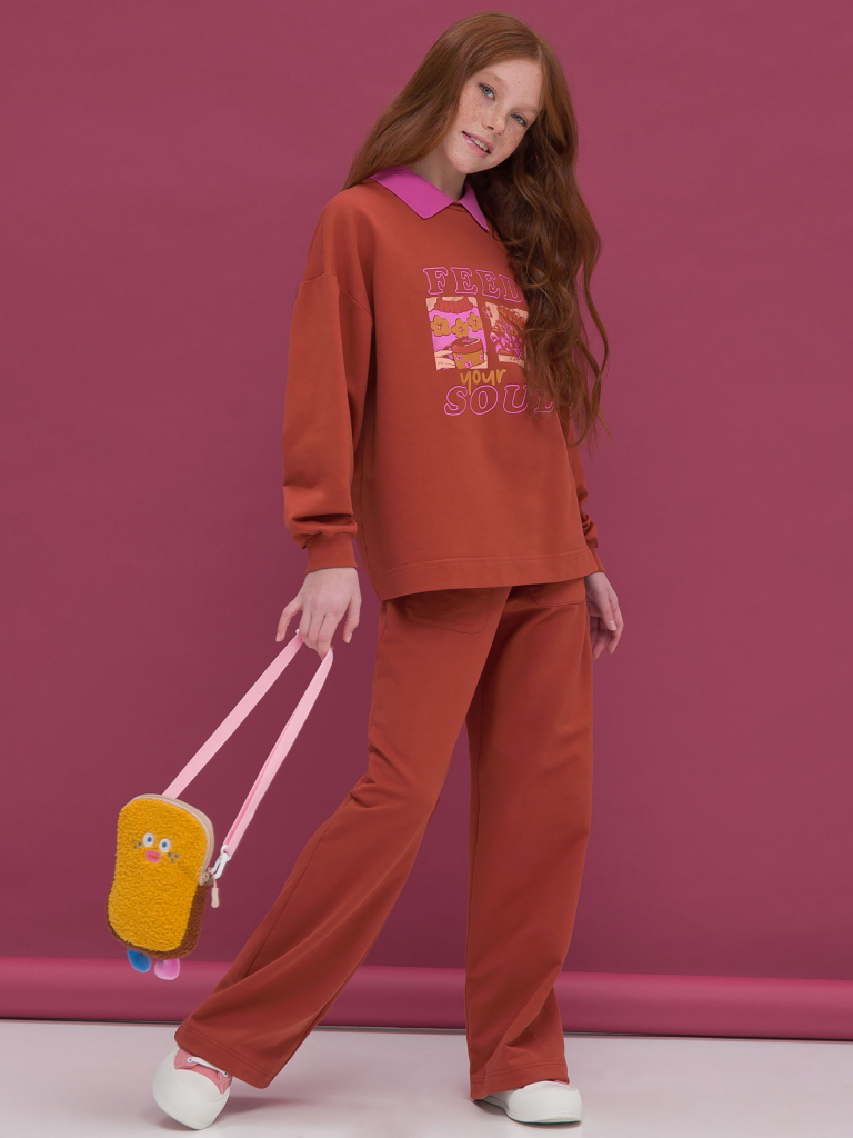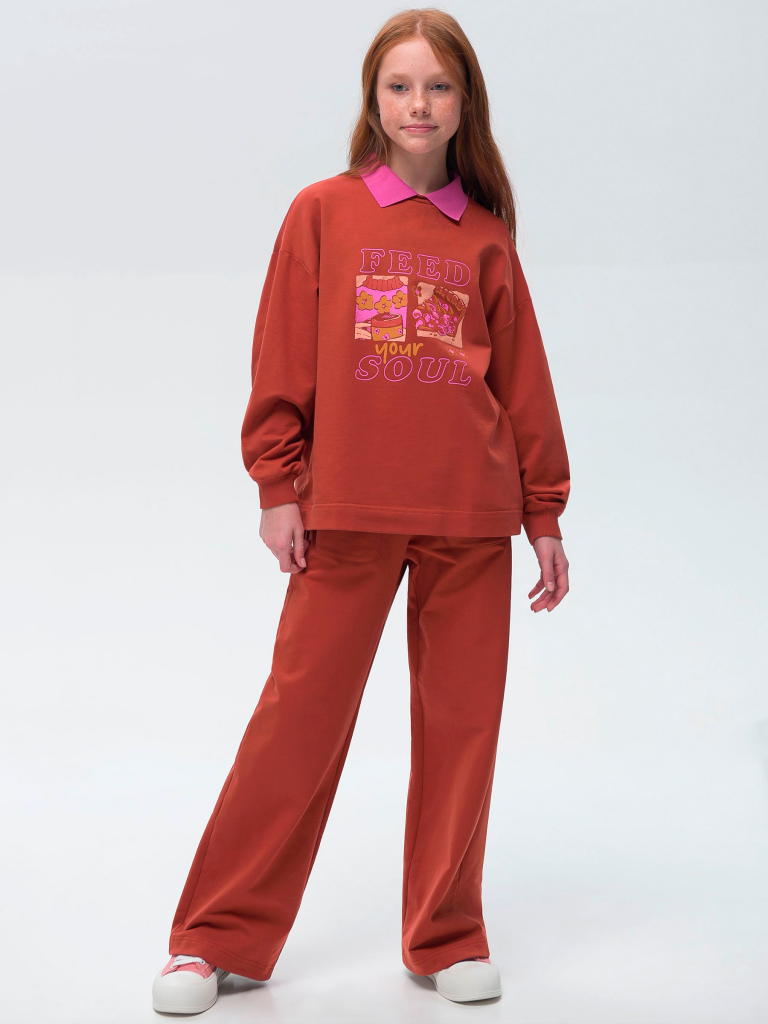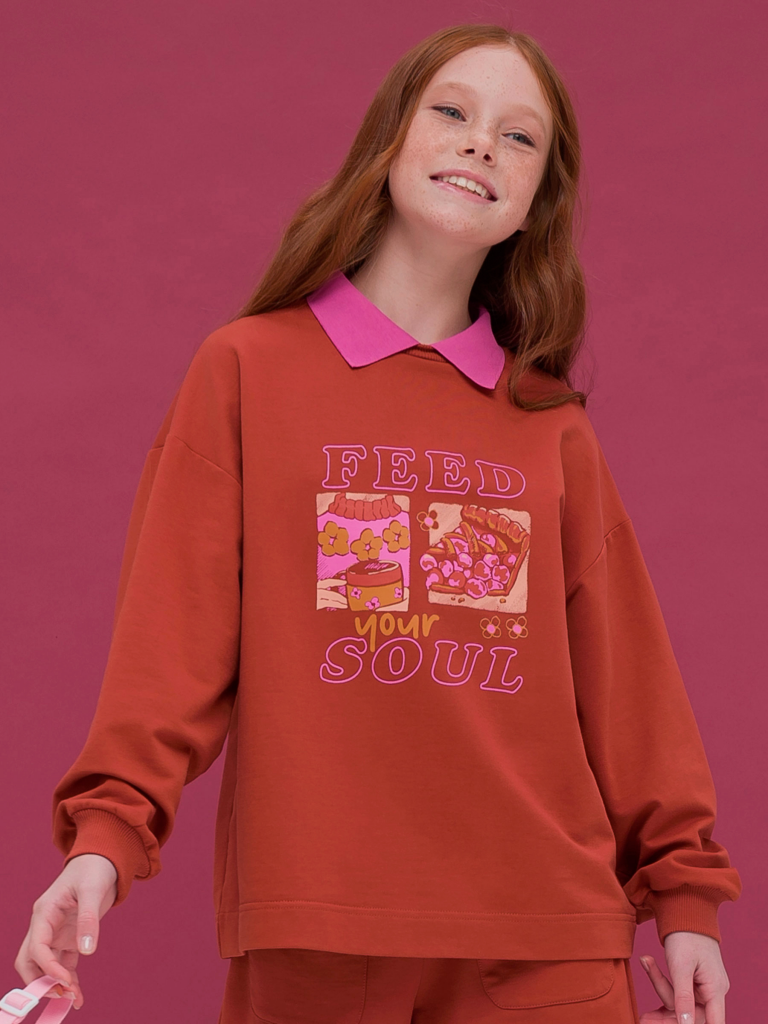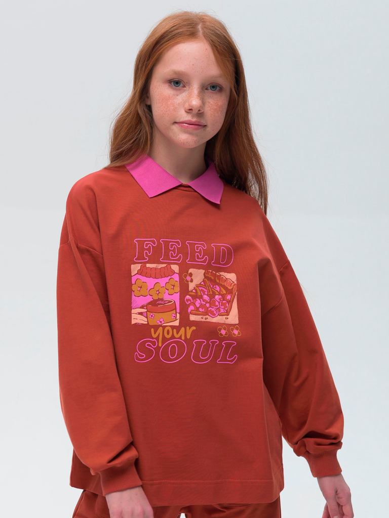 Свитшот из футера для девочки. Теплая, мягкая, приятная на ощупь ткань с 95% хлопка в составе – почти не мнется, сохраняет форму даже после частых стирок. Воротник из рибаны – плотно прилегает и не давит, отлично тянется. Свободной крой и спущенное плечо – комфортный и модный оверсайз. Яркий позитивный принт для улыбки и настроения на целый день. Отлично сочетается с брюками-палаццо, джоггерами. Подходит на каждый день, для учебы и активного образа жизни.