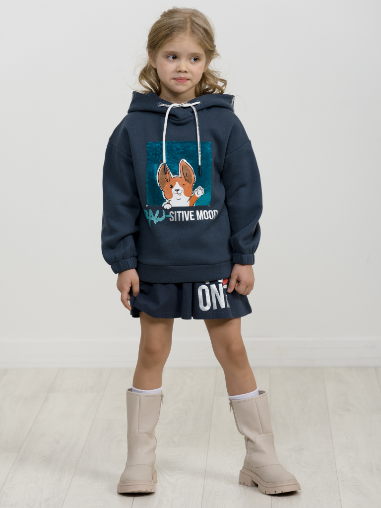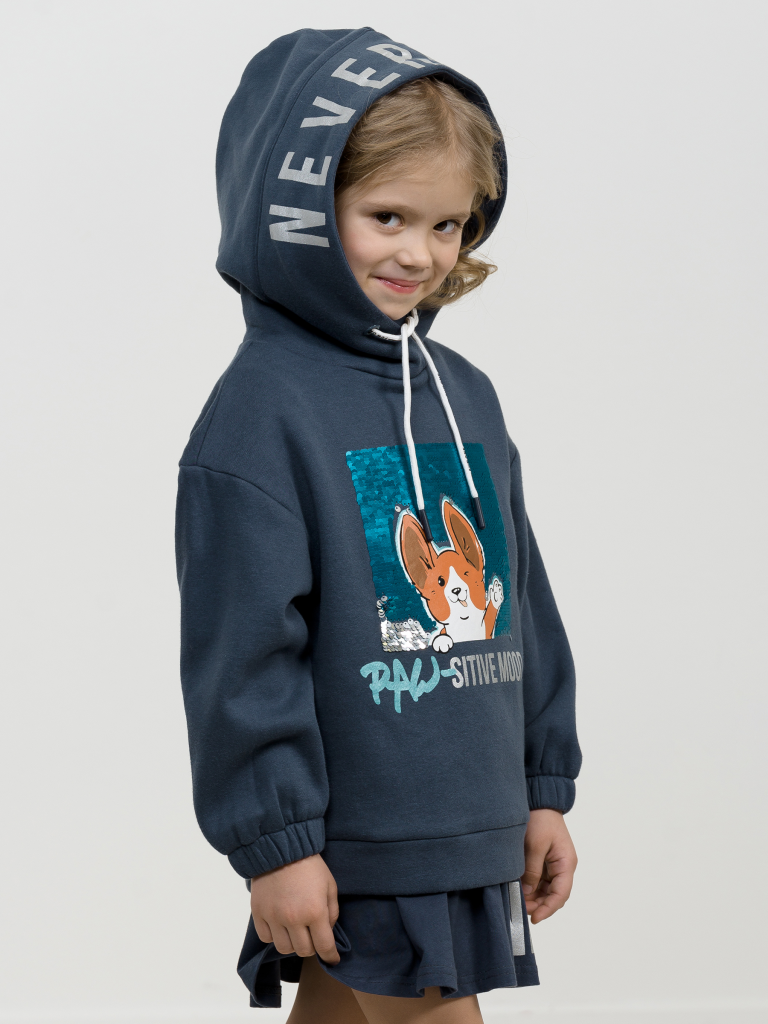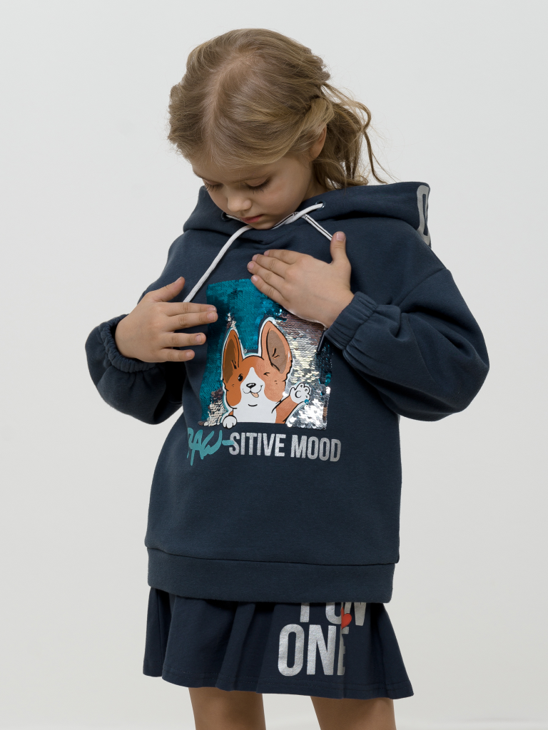 Худи из футера с начесом. Оригинальный капюшон с запахом, объем регулируется принтованными шнурками с пластиковыми наконечниками. По краю капюшона широкая обтачка с текстовым принтом из серебряного металлика. Перевод Не важно. Центральный принт в виде нашивки из двусторонних пайеток, серебряного и бирюзового металликов. Перевод игра слов PAW лапа и POSITIVE позитивное настроение.