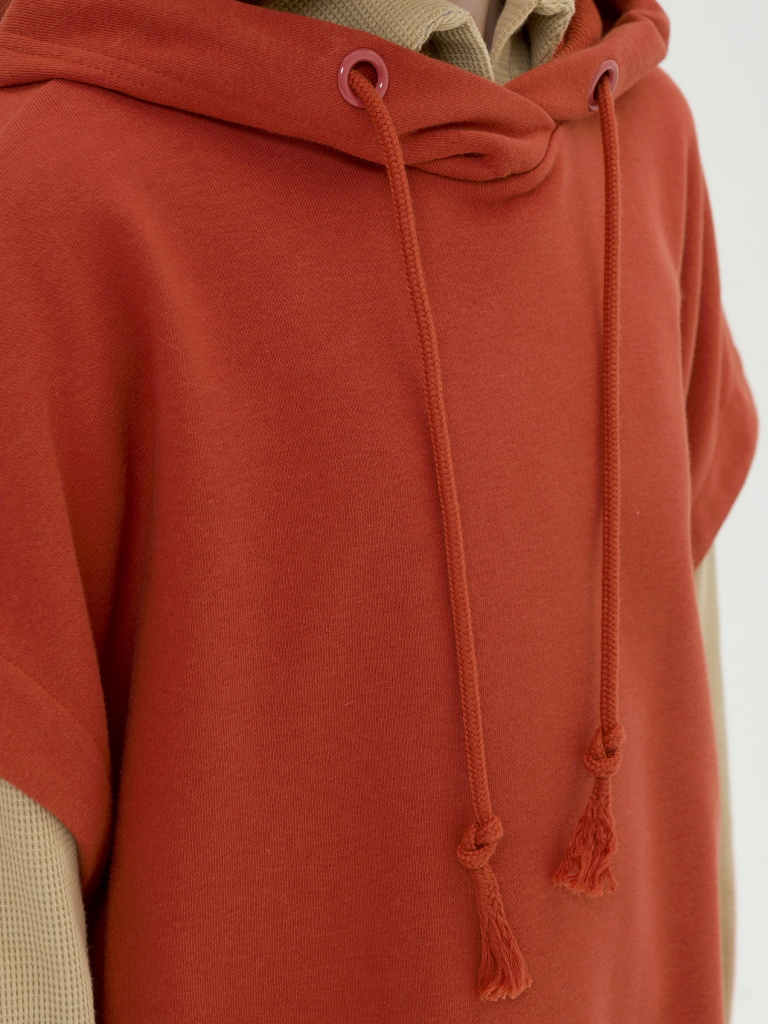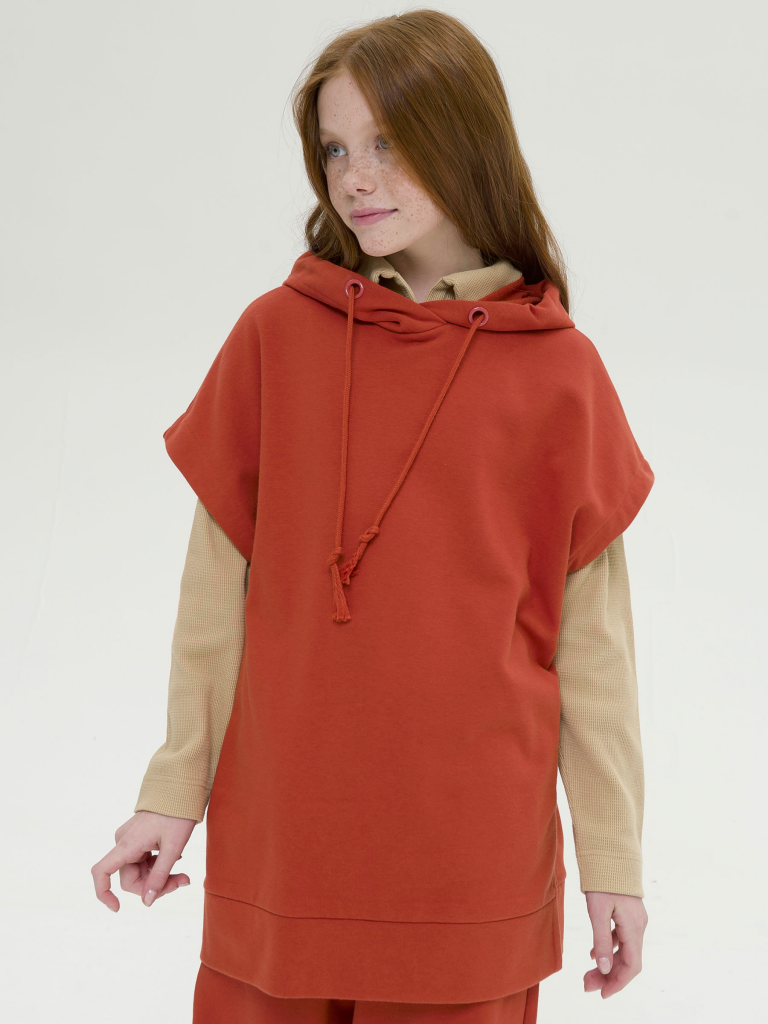 Жилет из футера для девочки. Ткань мягкая, дышащая, приятная на ощупь, с большим содержанием хлопка. Свободный крой, спущенное плечо – настоящий трендовый оверсайз. Теплый и удобный капюшон – объем регулируется плетеным шнуром с декоративными кисточками. Большая пройма – комфортно носить на футболку и объемное худи. Боковые разрезы, широкая подгибка проймы и низа основной тканью – изделие не растягивается и не деформируется при активной носке и частых стирках. Идеален для создания многослойных образов. Жилетка комбинируется с джоггерами, слоучами. Подходит для повседневного стиля, учебы и активного отдыха.