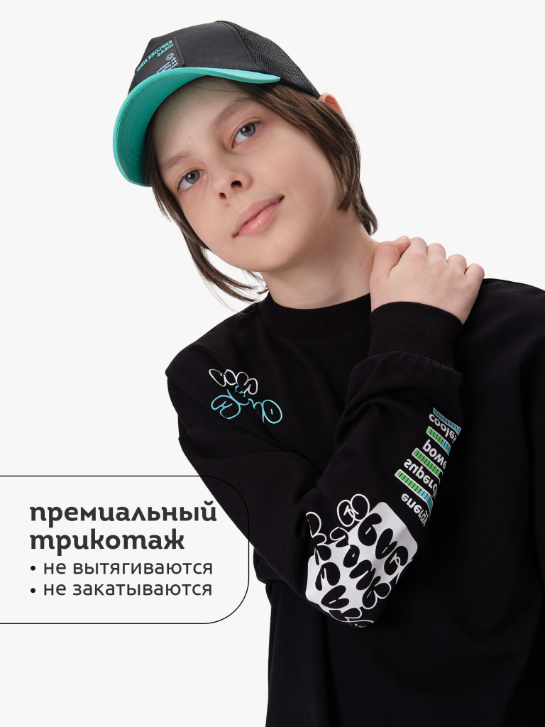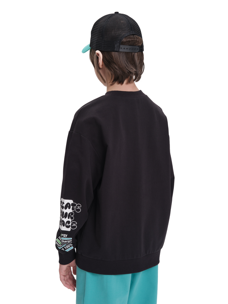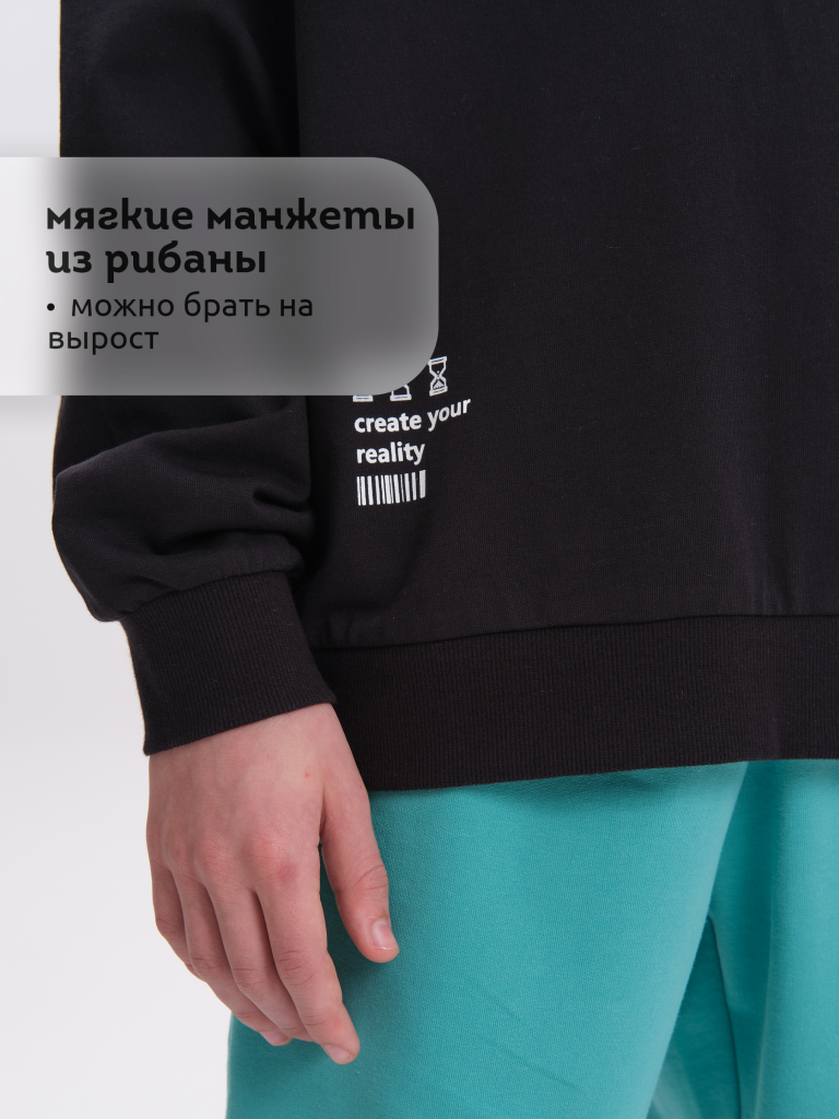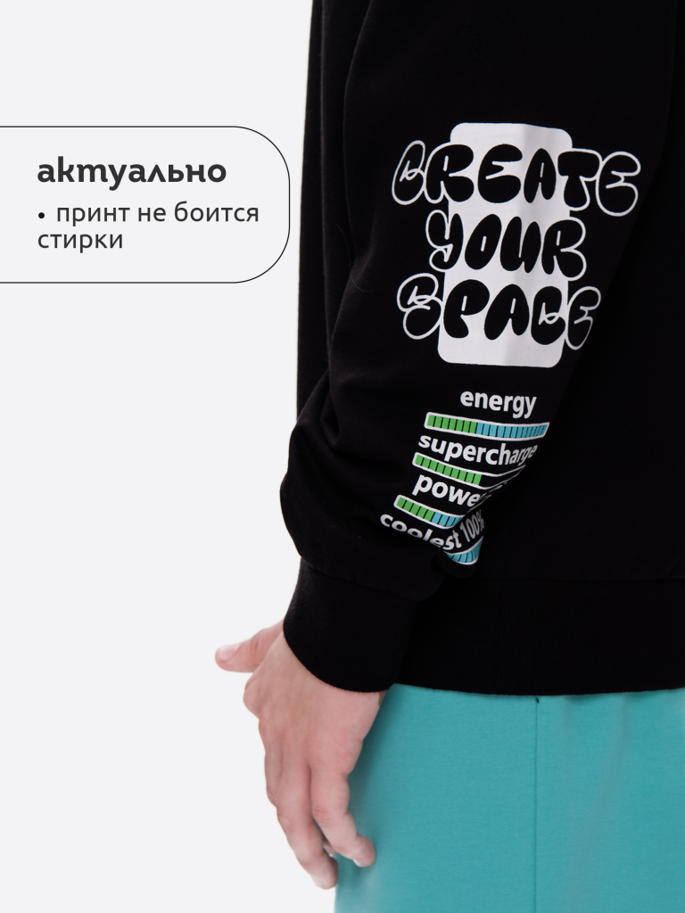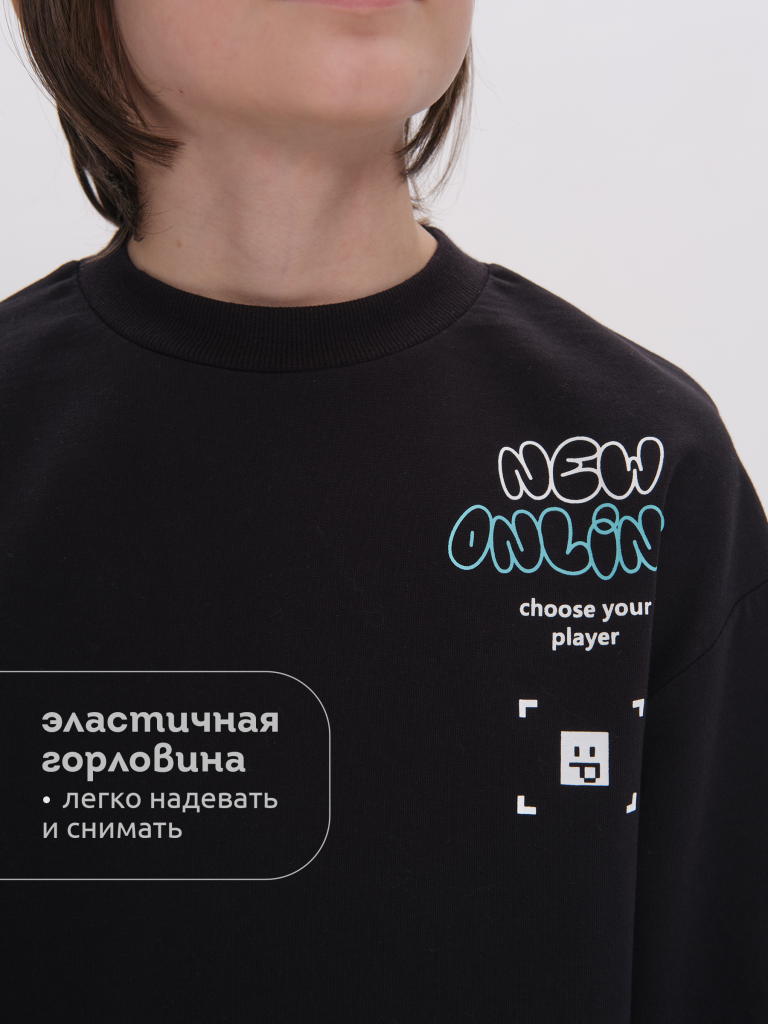 Свитшот без начеса из материала футер-петля. Манжеты и низ изделия из рибаны. По переду принт в виде смайлика, а также текстовый принт. Перевод надписи: "new online" - новый онлайн, "choose your player" - выбери своего игрока, "create your reality" - создай свою реальность. Рукав также украшен принтом с надписью. Перевод надписи "create your space" - создавай свое пространство, "energy, power-ups, coolest-100%" - энергия, бонусы, крутость - 100%. В составе ткани преобладает высококачественый хлопок — спортивная кофта приятна на ощупь и прекрасно пропускает воздух. Тонкую весеннюю кофту можно носить круглый год. Подходит для любителей корейской и японской моды, стиля аниме. Широкая размерная сетка подойдет как для малыша так и для подростка.