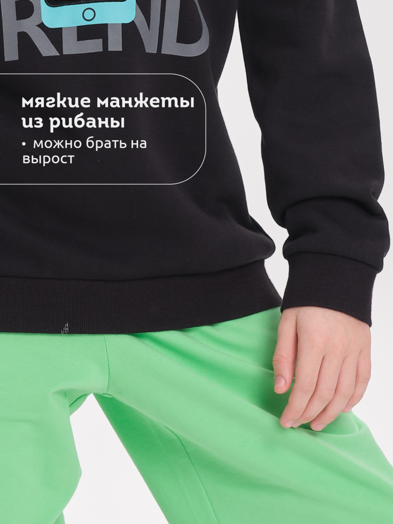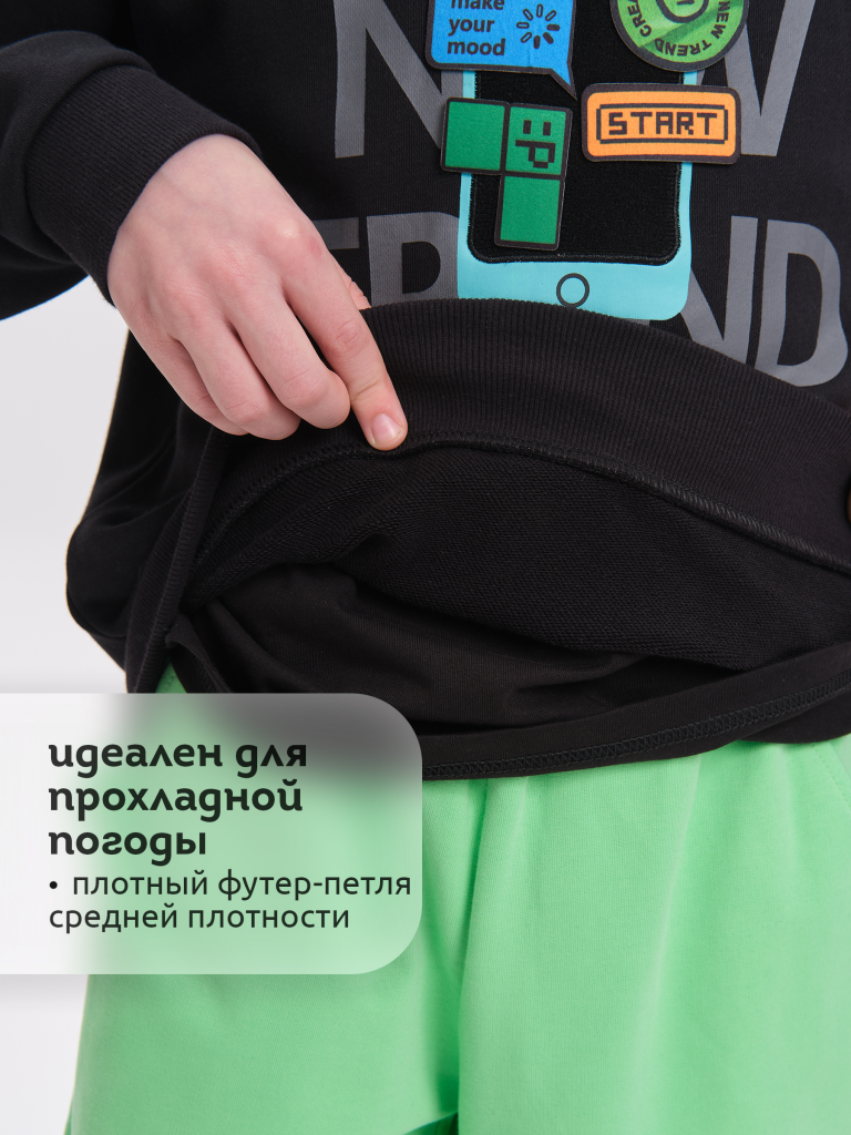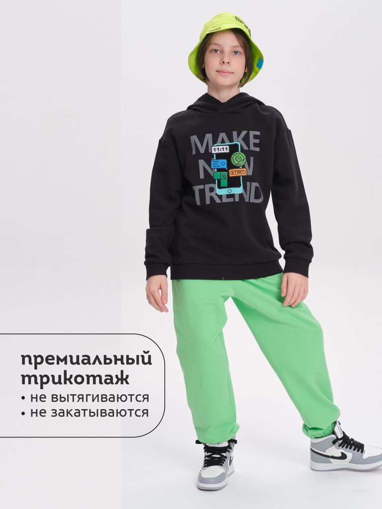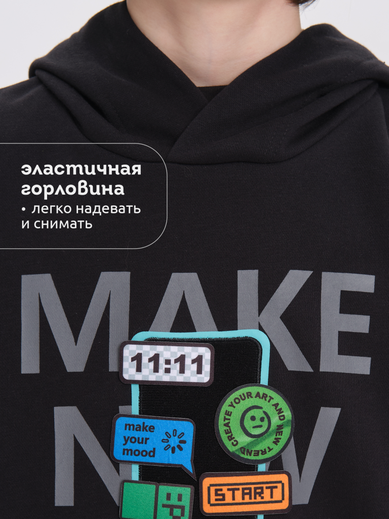 Худи для мальчика без начеса – актуальная вещь в любом сезоне, будь то весна, лето или осень. Кофта спортивная для мальчика выполнена из плотного футера-петля, который отлично согревает в прохладную погоду и при этом хорошо пропускает воздух – ребенок активно двигается, играет, не потеет. Толстовка свободного покроя оверсайз со спущенным плечом, углубленной проймой. Рукава а также низ изделия на манжете из рибаны. Кофта без карманов. Капюшон объемный, двухшовный без регулировки. Изделие выполнено в актуальном стиле Digital и понравится юным геймерам, а также любителям одежды в корейском стиле и в стиле аниме. Пайта в базовом цвете украшено нашивкой-липучкой со съемными стикерами. По переду текстовый принт. Перевод принта "make new trends" - делай новые тренды. Размерный ряд подходит как для малышей так и для подростков.