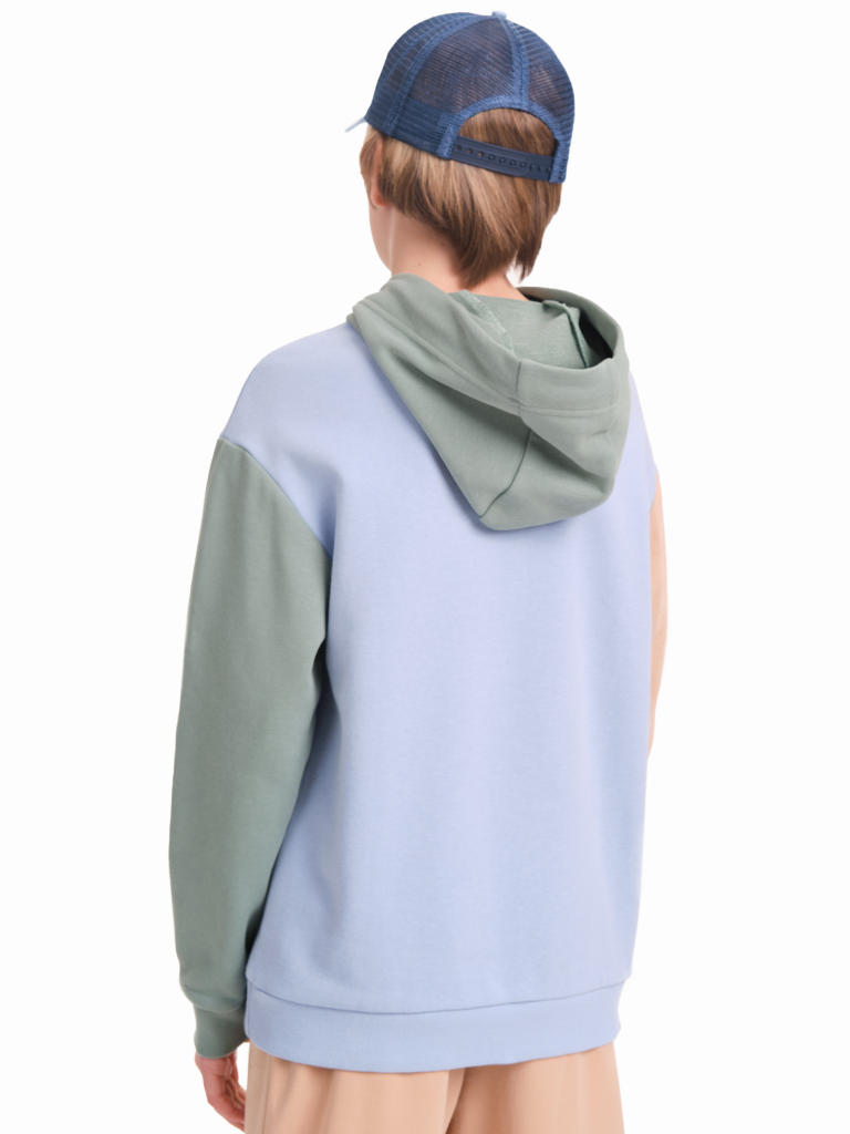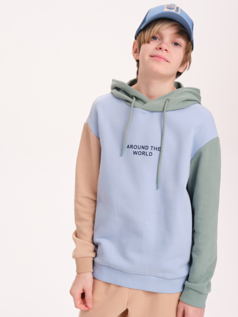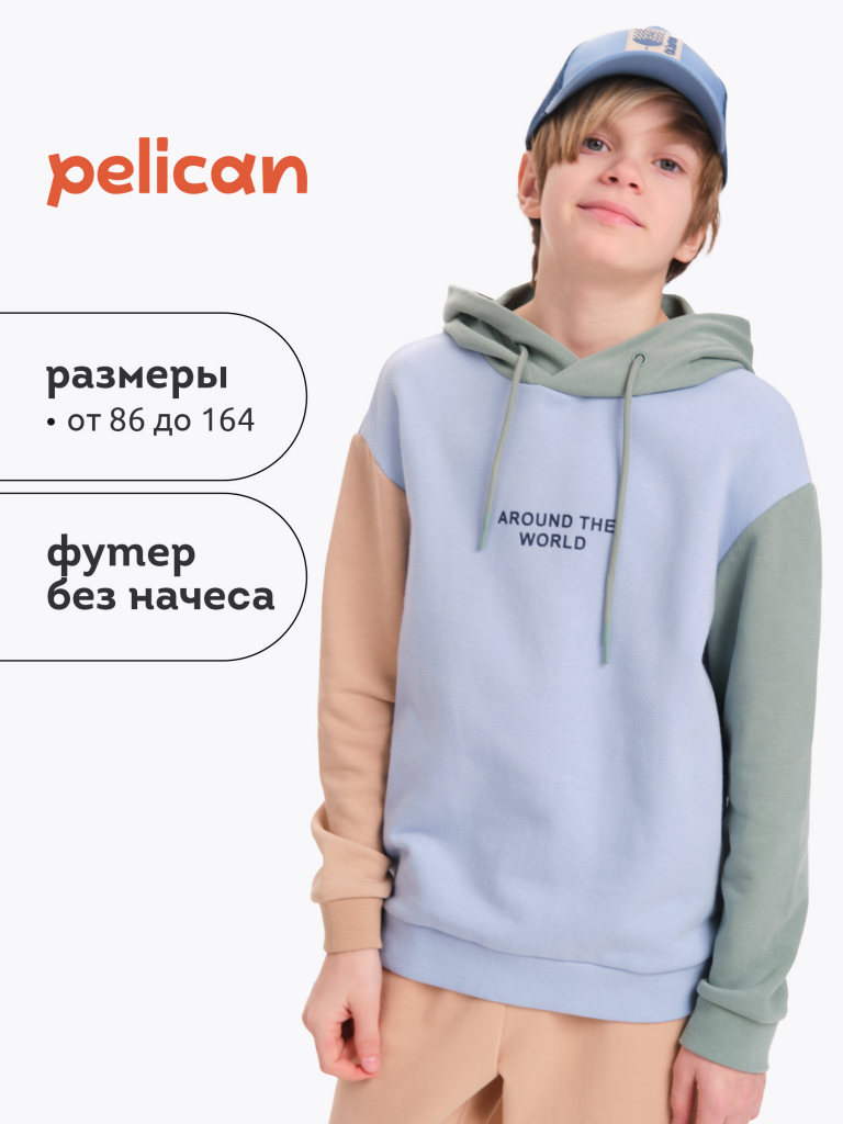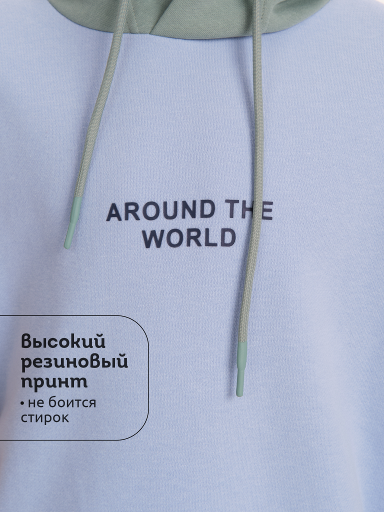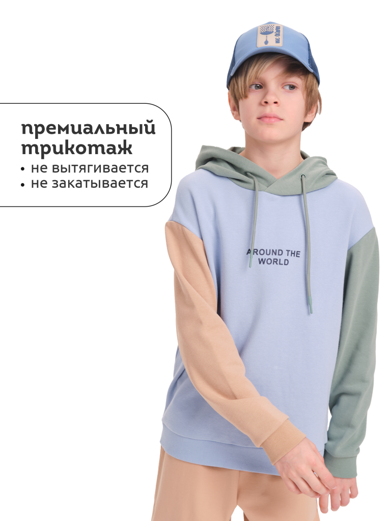 Худи для мальчика без начеса – актуальная вещь в любом сезоне, будь то весна, лето или осень. Кофта спортивная для мальчика выполнена из плотного футера-петля, который отлично согревает в прохладную погоду и при этом хорошо пропускает воздух – ребенок активно двигается, играет, не потеет. Толстовка свободного покроя оверсайз со спущенным плечом, углубленной проймой. Рукава а также низ изделия на манжете из рибаны. Кофта без карманов. Капюшон с регулировкой объема. Пайта для мальчика выполнена в трех цветах. По переду изделие украшено выпуклым резиновым принтом с надписью. Перевод надписи "around the world" - вокруг света. Размерный ряд подходит как для малышей так и для подростков.