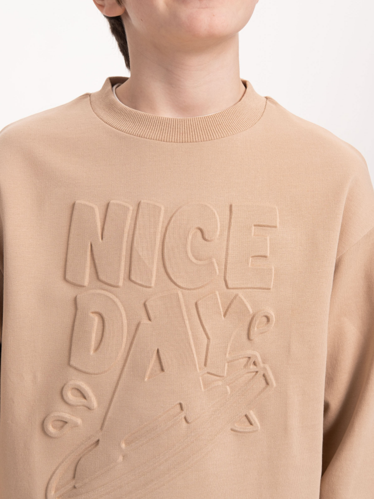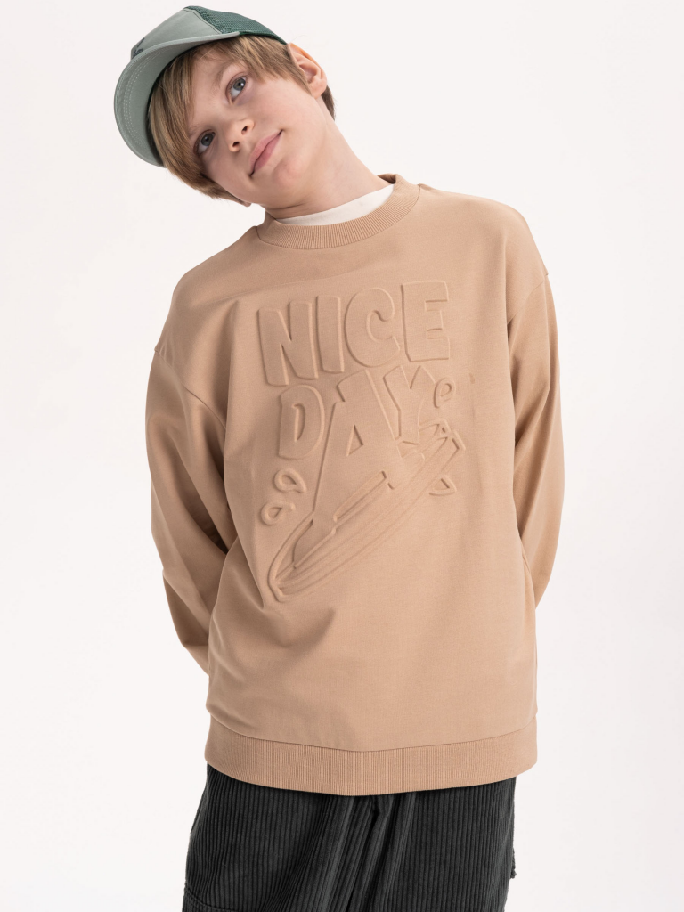 Свитшот без начеса из материала футер-петля. Манжеты и низ изделия из рибаны. Толстовка весенняя украшена выпуклым выдавленным принтом - надписью. Перевод надписи "nice day" - прекрасный день. В составе ткани преобладает высококачественый хлопок — спортивная кофта приятна на ощупь и прекрасно пропускает воздух. Тонкую кофту можно носить круглый год. Широкая размерная сетка подойдет как для малыша так и для подростка.
