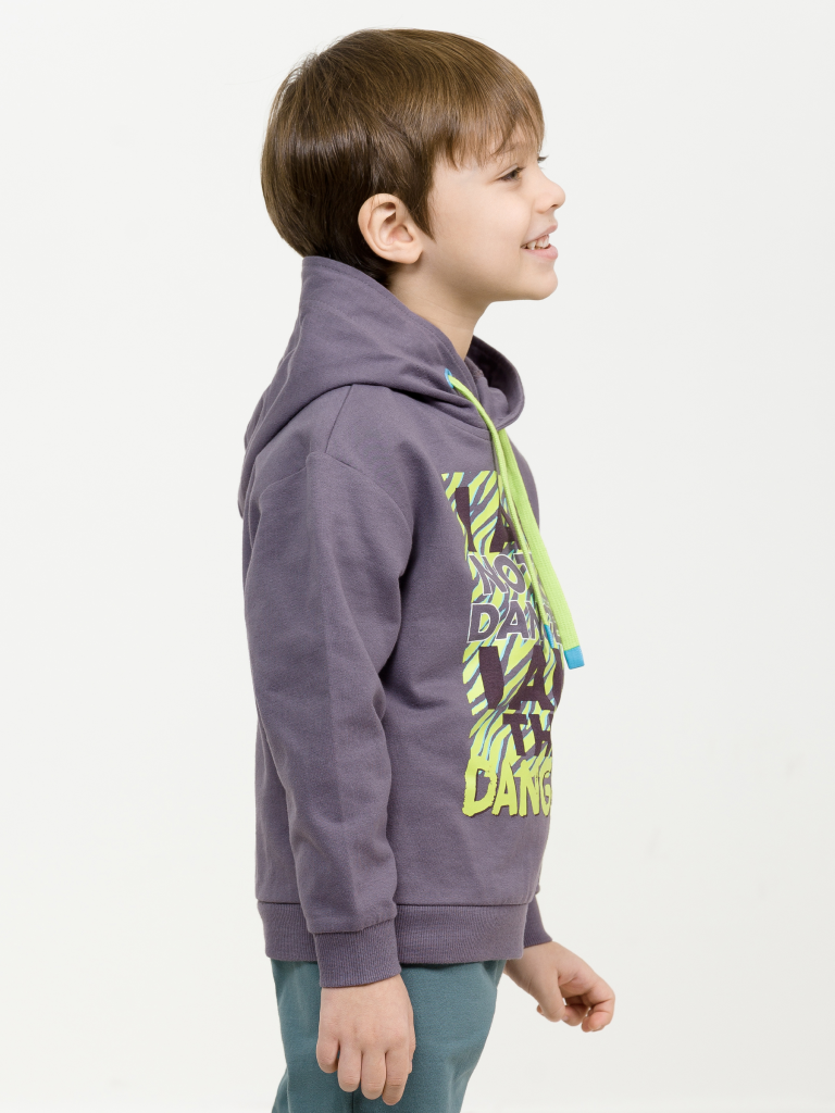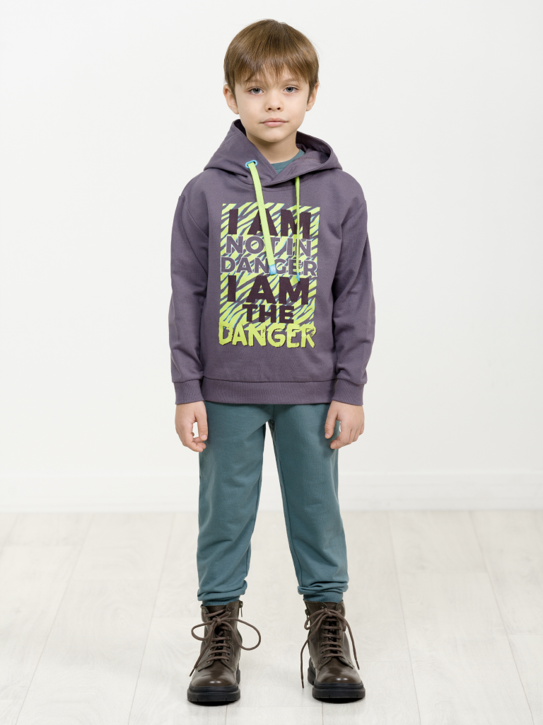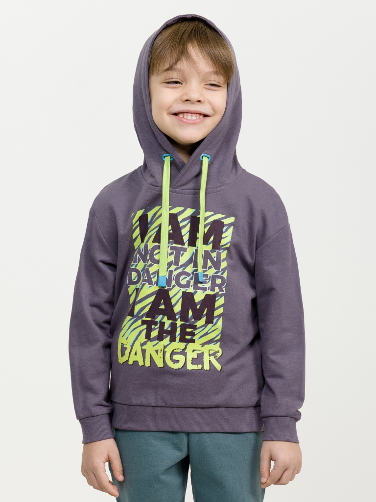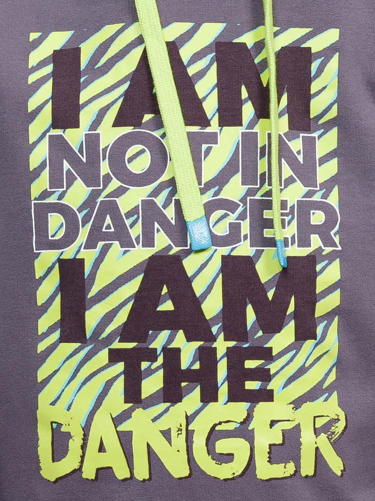 Худи из футера. Плечо мягкое спущенное, углубленная пройма, широкий рукав книзу заужен. Манжеты из рибаны. Капюшон однослойный, с запахом по центру переда. Объем капюшона регулируется неоновым шнуром, на концах которого резиновые уплотнители. Стойкий эластичный неоновый принт. Перевод Я не в опасности, я сам опасность.