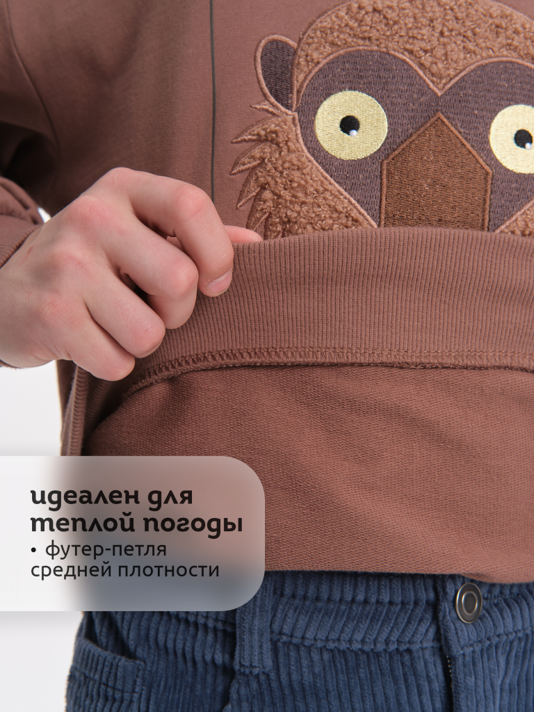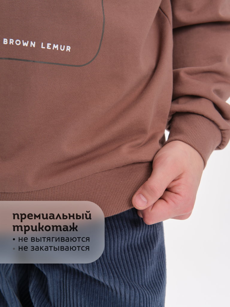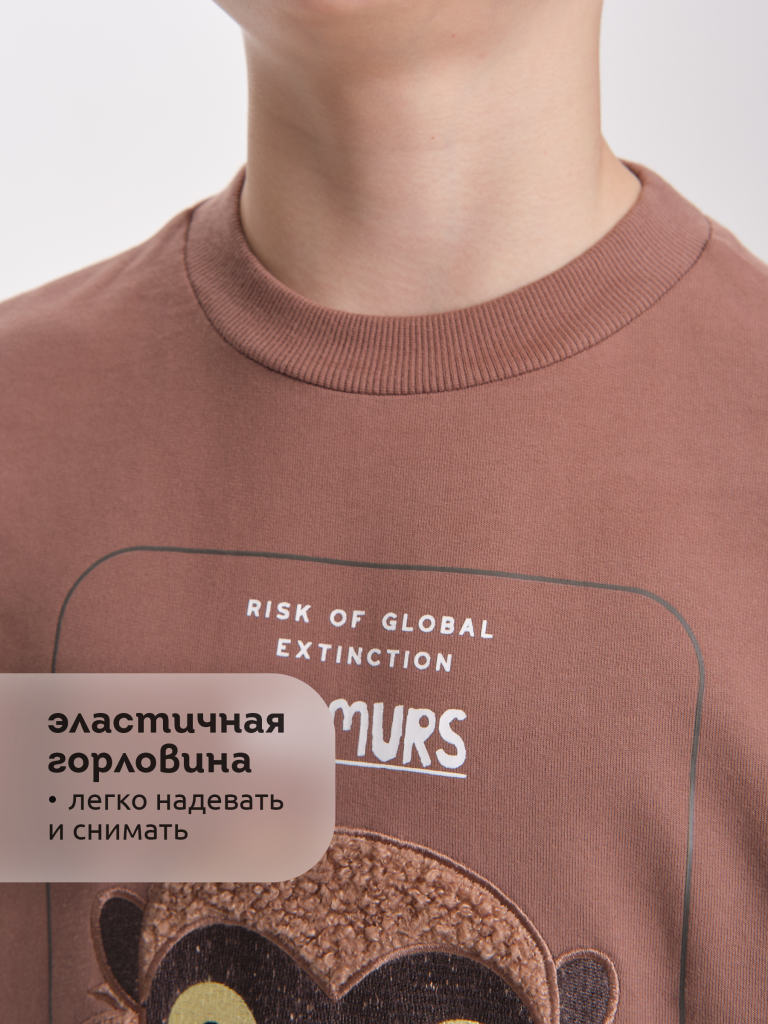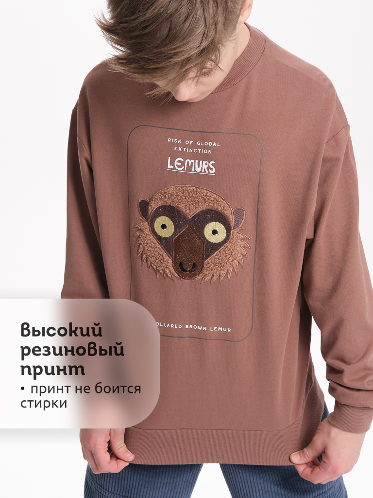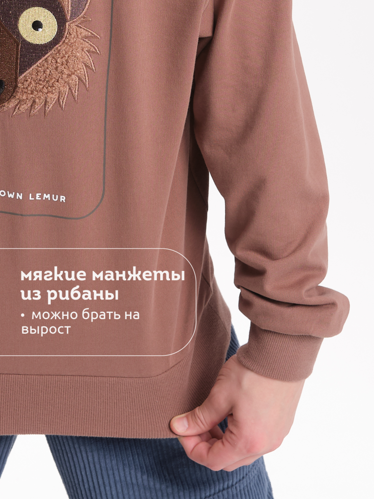 Свитшот без начеса из материала футер-петля. Манжеты и низ изделия из рибаны. Толстовка весенняя украшена аппликацией из бербер-флиса (он же тедди-флис, барашек, чебурашка), а также надписью. Перевод надписи: "risk of the global extinction lemurs" - риск глобального вымирания лемуры, "collared brown lemur" - ошейниковый коричневый лемур. В составе ткани преобладает высококачественый хлопок — спортивная кофта приятна на ощупь и прекрасно пропускает воздух. Тонкую кофту можно носить круглый год. Широкая размерная сетка подойдет как для малыша так и для подростка.