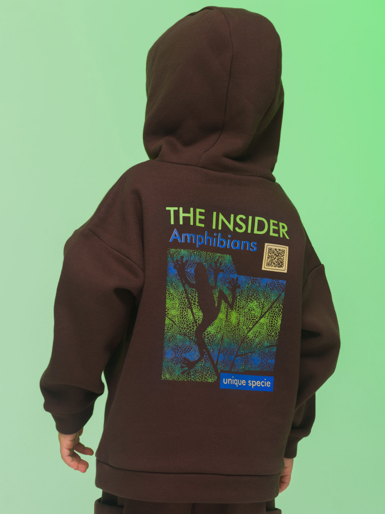 Детское худи с капюшоном для мальчика. Объёмная толстовка не будет стеснять движений ребёнка и подарит комфорт. Худи оверсайз актульно в этом сезоне. Манжеты выполнены из основного материала, по низу толстовки пояс из основной ткани, это немного сдерживает объём, изделие смотрится аккуратно. Капюшон с двумя швами, что обеспечивает анатомически правильную форму и комфортную посадку по голове. Капюшон двойной, швы закрыты. Шнуром можно регулировать высоту и объём. За изделием легко ухаживать. Худи с принтом на спине выполнено из ткани с высоким содержанием качественного хлопка (футер с начёсом) — оно тёплое, приятное на ощупь и прекрасно пропускает воздух. Полиэстер помогает изделию сохранять цвет и форму в течение длительного времени. Оригинальный принт в виде лягушки с надписями «инсайдер амфибия» и «уникальный вид» дополнен QR-кодом, при сканировании которого можно прочитать уникальные научные факты о лягушках. Принт мягкий и прочный, не боится частых стирок. Худи с капюшоном выполнено в актуальном шоколадном цвете. Размерный ряд: 1 (86): 2 (92): 3 (98): 4 (104): 5 (110): 6 (116): 7 (122): 8 (128): 9 (134): 10 (140): 11 (146). Коричневое худи подходит как маленьким мальчикам, так и подросткам. Худи с начёсом идеально для круглогодичной носки: осенью и весной (демисезон), зимой, в прохладную погоду летом. Толстовка идеальна для детского сада, прогулок, активного отдыха, а также для дома. Она станет замечательным подарком сыну, внуку, племяннику или брату на День рождения и любой другой праздник.