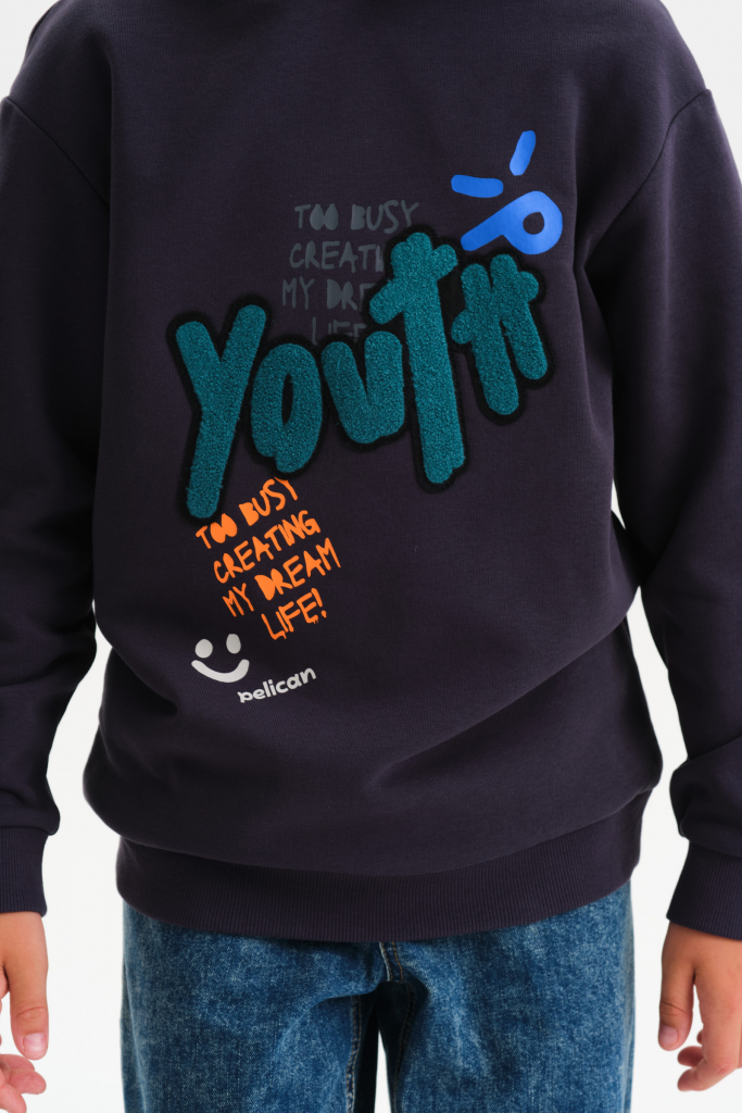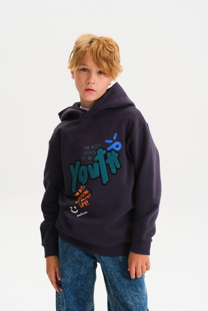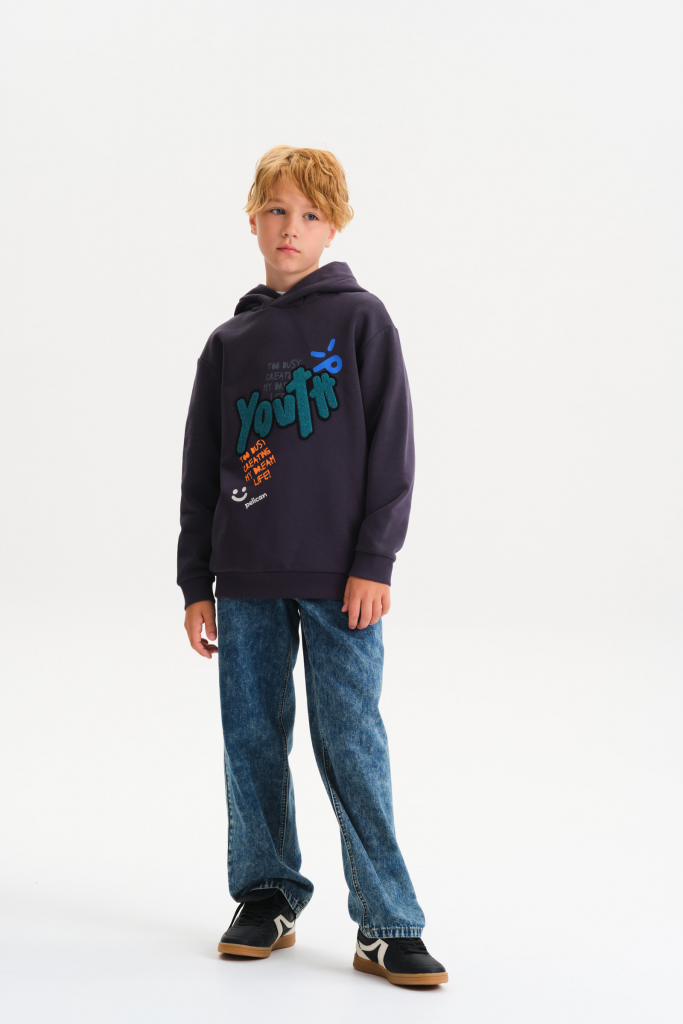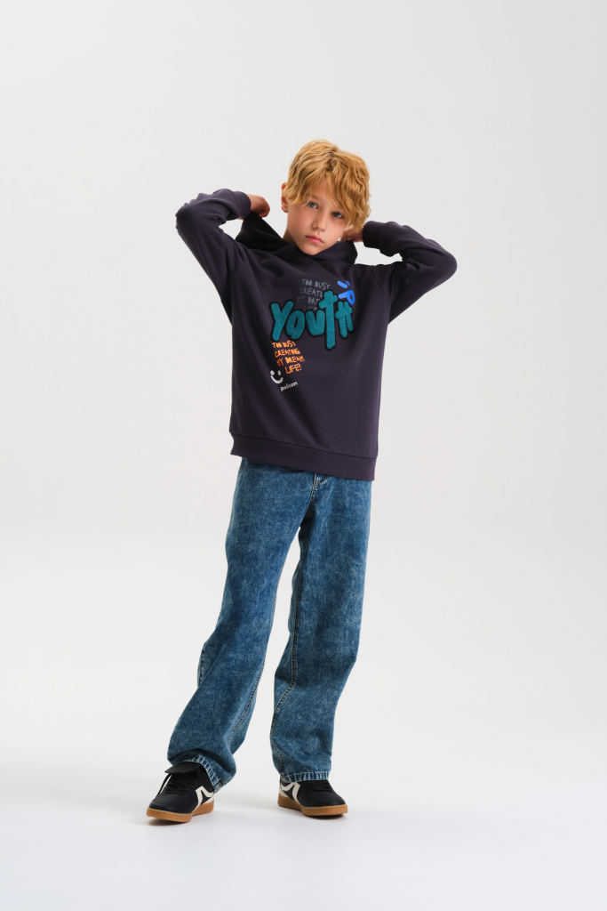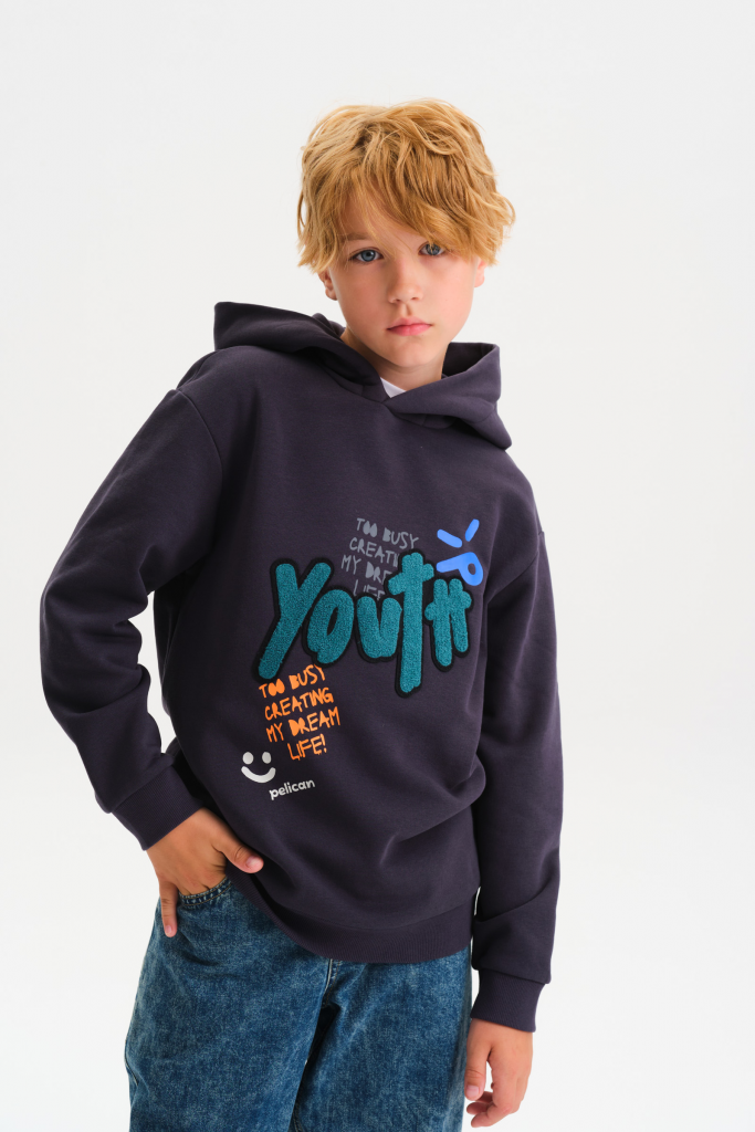 Толстовка детская из футера с начёсом для мальчика. Худи трендового умеренного объема со спущенным плечом подарит ребёнку комфорт и не будет стеснять его движений. Толстовка с капюшоном защитит от холода и ветра. Модель дополнена манжетами из эластичной рибаны по низу и рукавам. Рибана не растягивается и надолго сохраняет отличный внешний вид. Изделие неприхотливо в уходе. Толстовка на мальчика выполнена из ткани с высоким содержанием хлопка — модель приятная на ощупь, дышащая и гипоаллергенная. Благодаря полиэстеру худи износостойкое, сохраняет форму даже после множества стирок. Изделие выполнено в универсальной расцветке, легко комбинируется с любыми брюками, джинсами. Толстовка декорирована оригинальным принтом и нашивкой. Перевод: Молодость. Слишком занят созданием жизни своей мечты". Отличное худи для мальчиков дошкольного и младшего школьного возраста, а также подростков. Джемпер подходит для детского сада, прогулок, отдыха, дома. Худи с капюшоном для мальчика подходят для круглогодичной носки. Помните о правильном уходе за изделием: рекомендуется стирать при температуре не выше 30 °C, без предварительного замачивания, с изнанки. Это поможет сохранить качество и цвет толстовки на длительное время. Не забывайте о выборе правильного размера. Используйте таблицу размеров на фотографии, чтобы выбрать подходящий вариант для вашего мальчика. Обратите внимание, что цвет товара на экране вашего устройства может отличаться от реального.