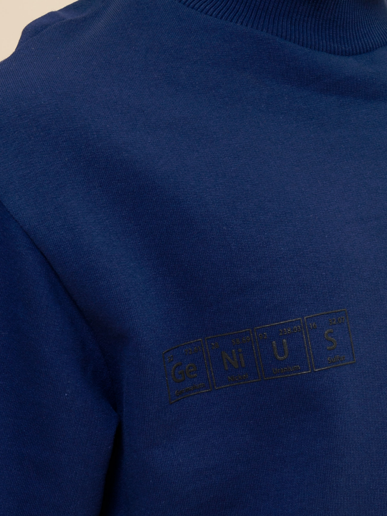 Толстовка из мягкого футера с высоким воротником-стойкой для мальчика. Модель выполнена из 100% хлопка — она дышащая, приятная на ощупь и очень комфортная. Воротник и манжеты выполнены из рибаны — не теряют форму, при этом толстовку удобно надевать и снимать. Изделие украшено мягким объёмным силиконовым принтом в виде слова «гений», написанного элементами таблицы Менделеева. Принт устойчив к многочисленным стиркам. Стильный и практичный вариант школьной одежды для мальчиков.