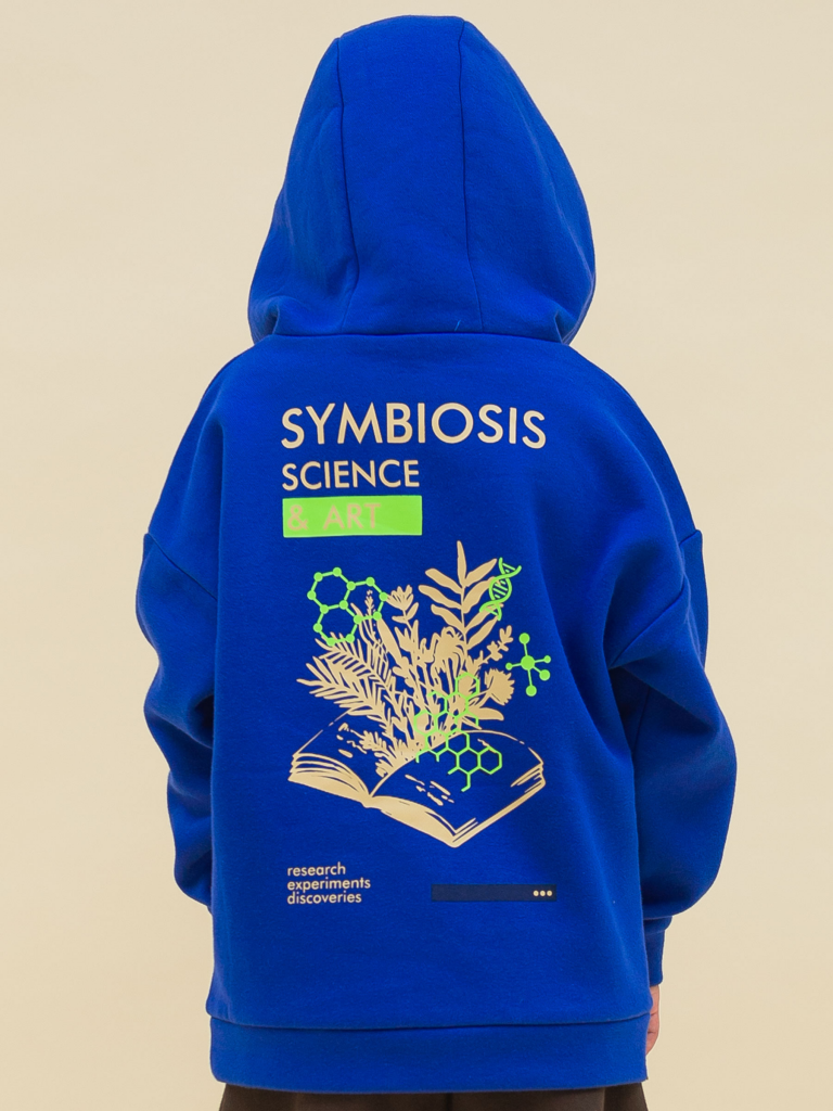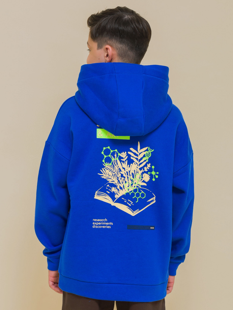 Детское худи с капюшоном для мальчика. Толстовка оверсайз-силуэта со спущенным плечом не будет стеснять движений ребёнка. Объёмное удлинённое худи — один из актуальных модных трендов. Манжеты рукавов выполнены из основного материала, по низу изделия пояс из основной ткани, это немного сдерживает объём, модель смотрится аккуратно. Капюшон с двумя швами, что обеспечивает анатомически правильную форму и комфортную посадку по голове. Капюшон двойной, швы закрыты. Шнуром можно регулировать высоту и объём. За изделием просто ухаживать. Худи с принтом на спине выполнено из ткани с высоким содержанием качественного хлопка (футер с начёсом), что обеспечивает мягкость и воздухопроницаемость. Благодаря полиэстеру толстовка сохраняет цвет и форму в течение долгого времени. Оригинальный принт изображает книгу с растениями и биологическими символами с надписями «симбиоз науки и искусства», «исследования, эксперименты, открытия». Принт эластичный и прочный, без проблем переносит многочисленные стирки. Худи синее, выполнено в модном оттенке «ультрамарин». В линейке представлены следующие размеры: 1 (86): 2 (92): 3 (98): 4 (104): 5 (110): 6 (116): 7 (122): 8 (128): 9 (134): 10 (140): 11 (146). Отличное худи оверсайз для мальчиков и подростков. Худи с начёсом можно носить круглый год: осенью и весной (демисезон), зимой, в прохладную погоду летом. Толстовка подходит для детского сада, прогулок, активного отдыха, а также для дома. Это замечательный подарок сыну, брату, внуку или племяннику на любой праздник.