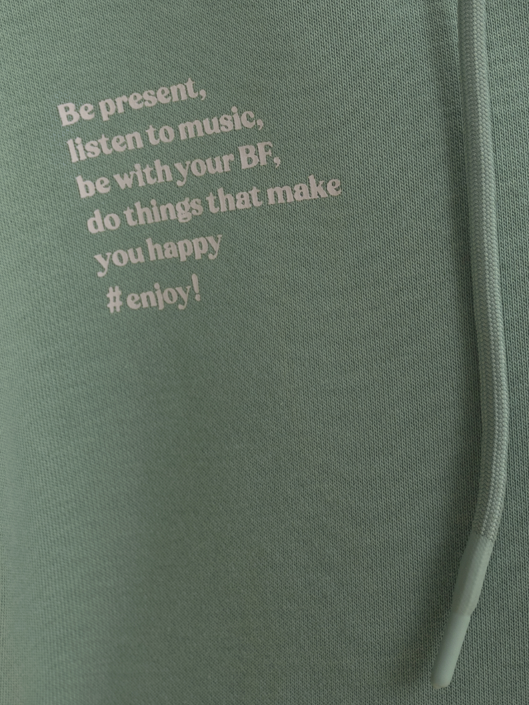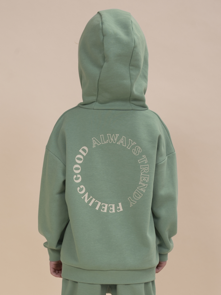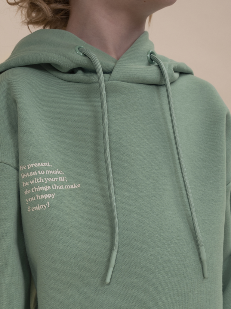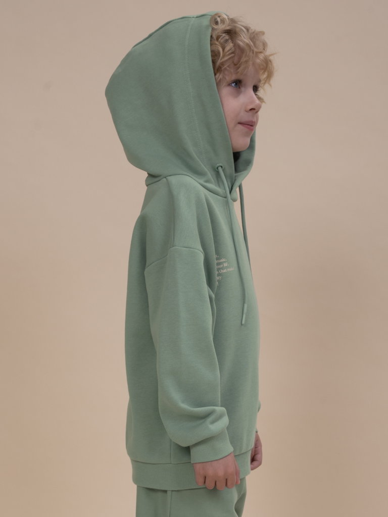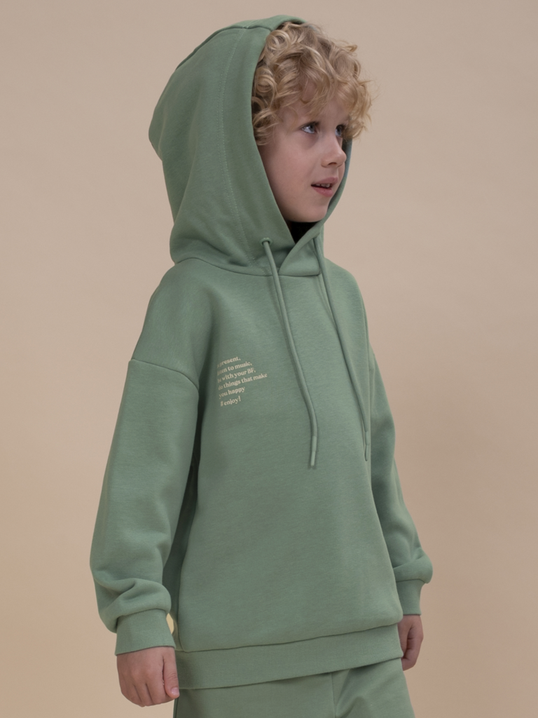 Толстовка для мальчика свободного фасона – актуальная вещь в любом сезоне. Уютное худи для мальчика с капюшоном незаменимо дома и на прогулке. Такая одежда поможет ребенку комфортно играть, гулять, ходить в садик, отдыхать на природе. Трикотажная толстовка для мальчика подростка с капюшоном выполнена с высоким содержанием хлопка и добавлением в состав эластана. Приятный к телу материал. Отлично носится, не дает усадки, не линяет в процессе стирки и сохраняет красивый внешний вид. Хлопок хорошо пропускает воздух, наделяет необходимой гигроскопичностью – ребенок активно двигается, играет, не потеет. Детское худи для мальчика из материала футер-петля. Изделие свободного кроя оверсайз со спущенным плечом, углубленной проймой. Рукава на манжете из рибаны. Низ выполнен в подгибку и прошит плоским швом. Капюшон на запахе, с люверсами и шнурками для регулировки. Изделие выполнено в однотонном зеленом цвете. Худи для мальчика подростка оверсайз спереди декорировано принтом: "Be present, listen to music, be with you BF, do things that make you happy #enjoy!" - перевод "Живи в моменте, слушай музыку, встречайся со своим лучшим другом, делай то, что делает тебя счастливым #наслаждайся!". На спинке надпись: "Feeling good always trendy" - перевод "Хорошее настроение всегда в тренде (модно)". Толстовка оверсайз рассчитана на возраст садика и школы. Понравится малышам, школьникам и подросткам. Размерная линейка: 1 (86): 2 (92): 3 (98): 4 (104): 5 (110): 6 (116): 7 (122): 8 (128): 9 (134): 10 (140): 11 (146). Худи для мальчика - отличный подарок для сына, внука, братика, племянника, крестника! Выбирайте нужный размер по таблице размеров на фото. Цвет товара на экране вашего устройства может отличаться от цвета изделия вживую.
