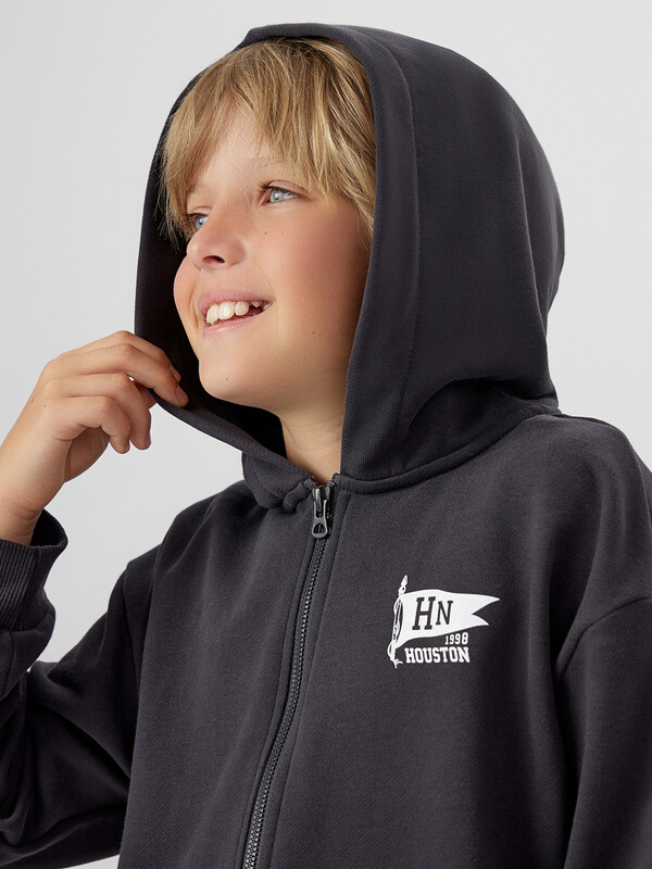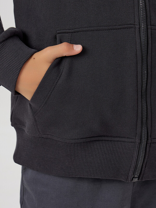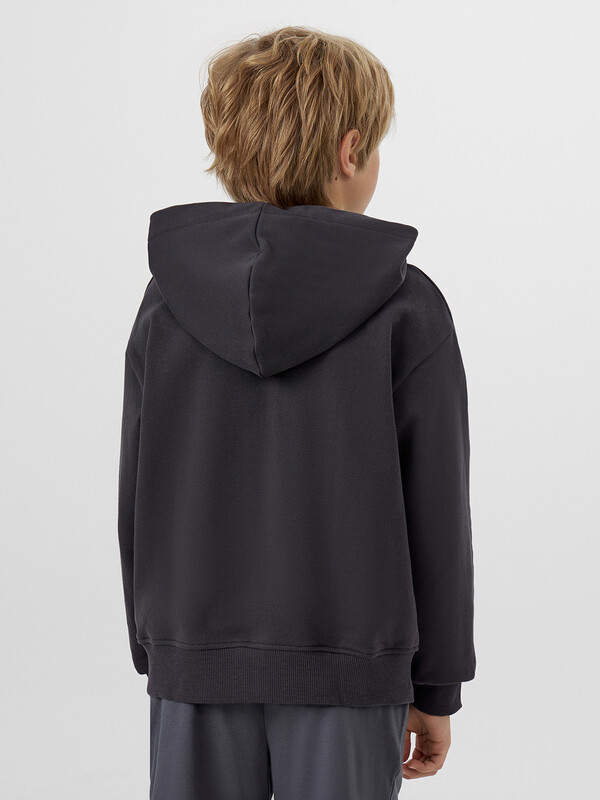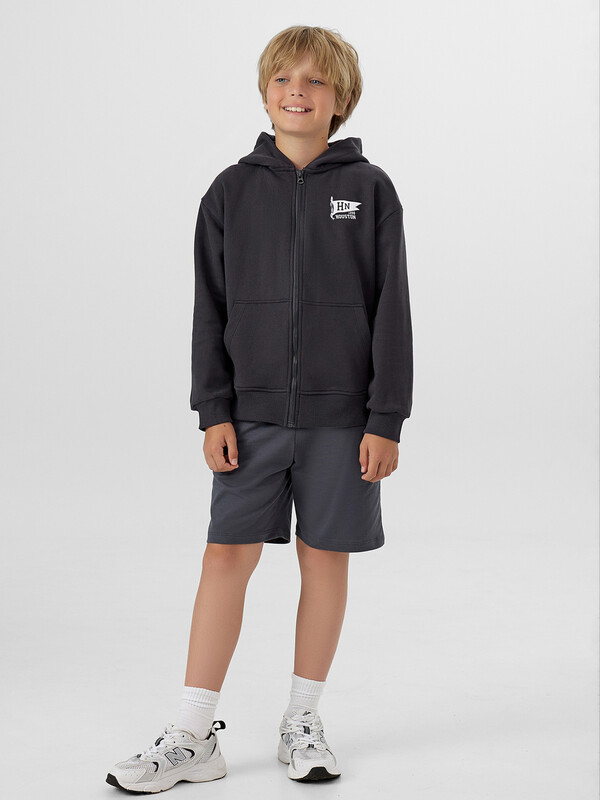 Жакет для мальчиков прямого силуэта с капюшоном. Капюшон на подкладке из основного полотна. Шов втачивания капюшона закрыт х/б тесьмой. Рукава втачные, линия плеча спущена. Притачные манжеты по низу рукавов и притачной пояс из рибаны. По переду застежка молния, карман кенгуру.