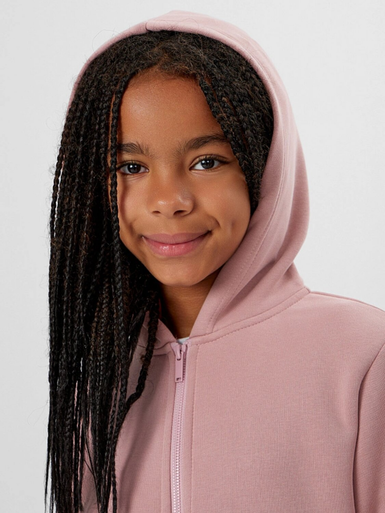 Жакет из трикотажного футера с теплым подчесом. Спущенная линия плеча гарантирует свободу движений. Прямой свободный силуэт, уютный капюшон, длинные рукава на манжетах, удобный карман-кенгуру, центральная застежка на молнию – эта модель наверняка понравится вашей девочке.