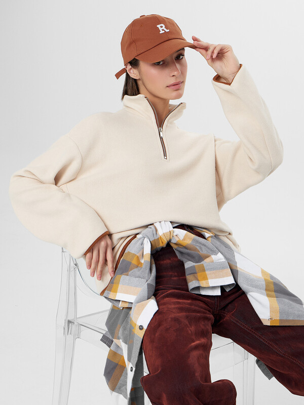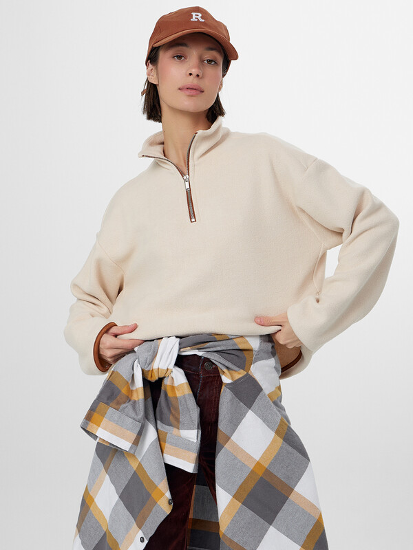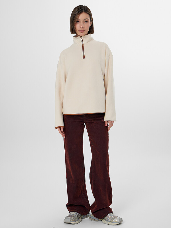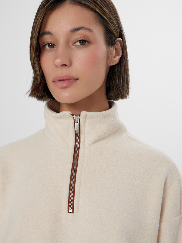 Бежевая женская толстовка из мягкого флиса станет уютным дополнением вашего гардероба. Свободный крой с круглой горловиной и стойкой обеспечивает комфорт в течение всего дня. Застежка-молния по центру и мягкие спущенные плечи создают расслабленный силуэт, не сковывающий движений.