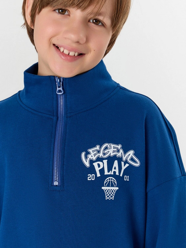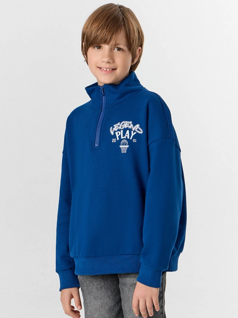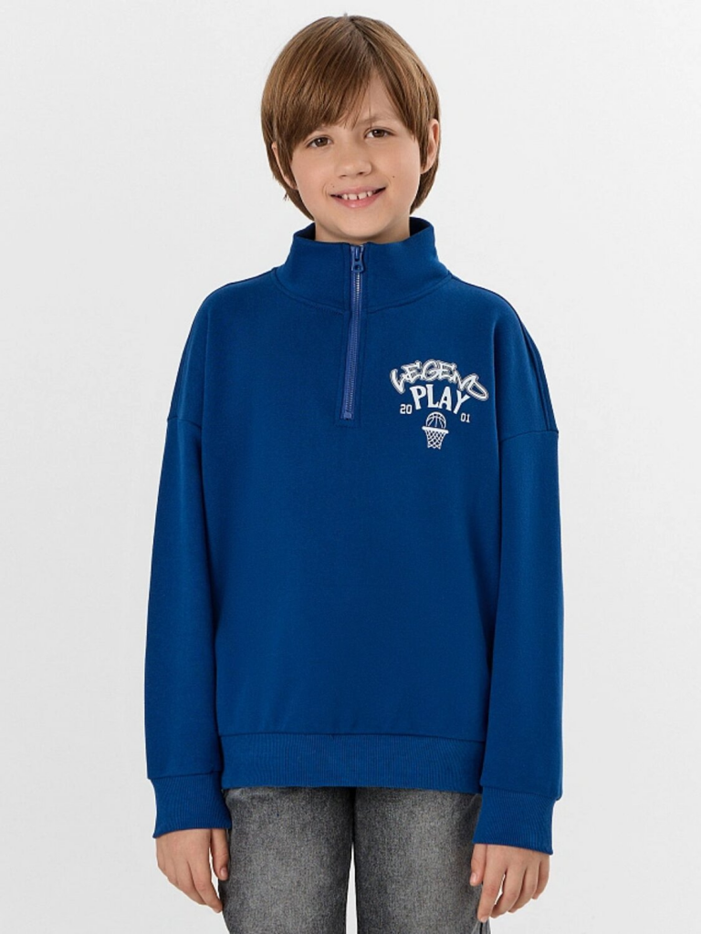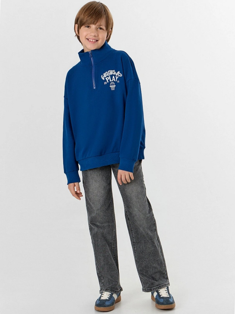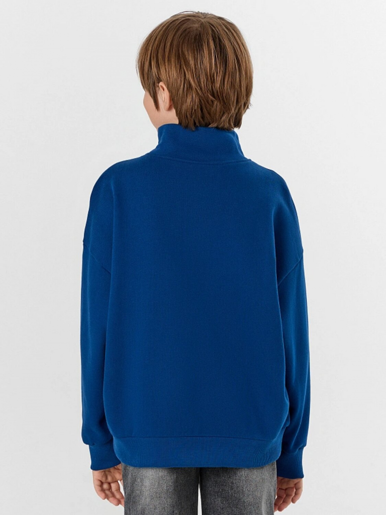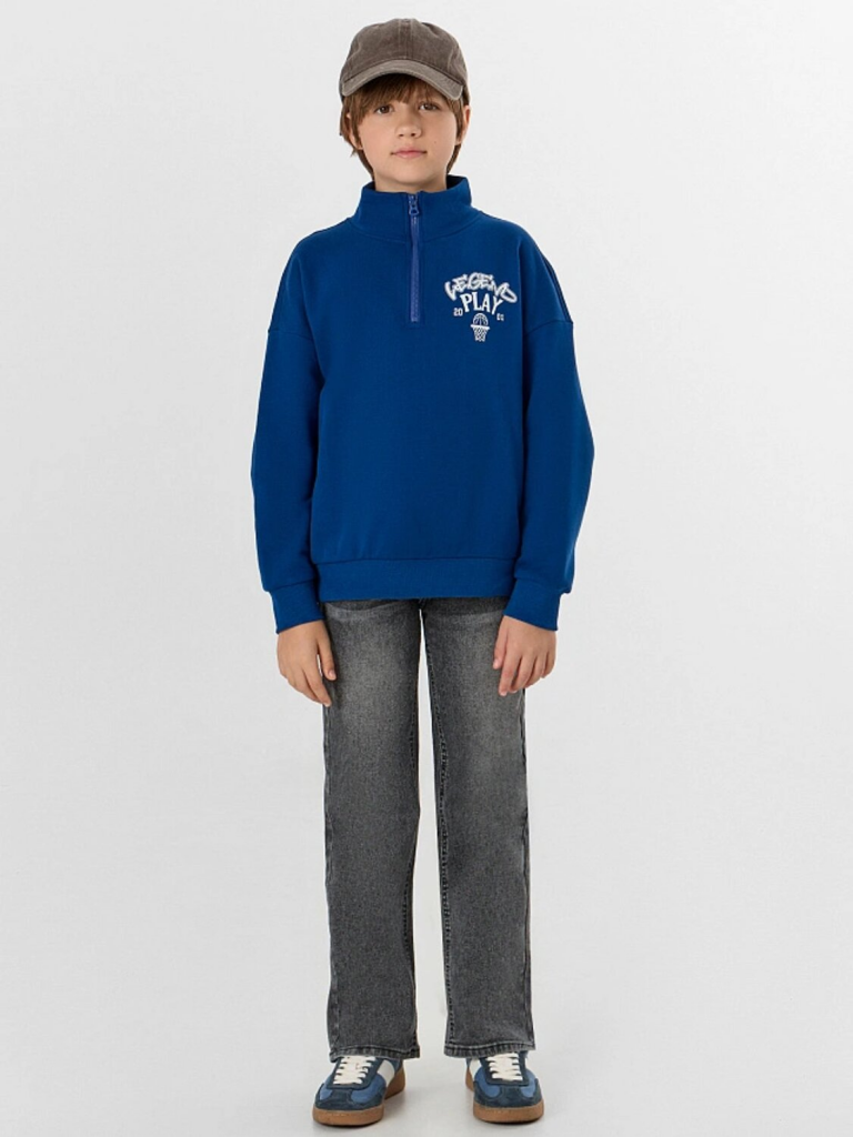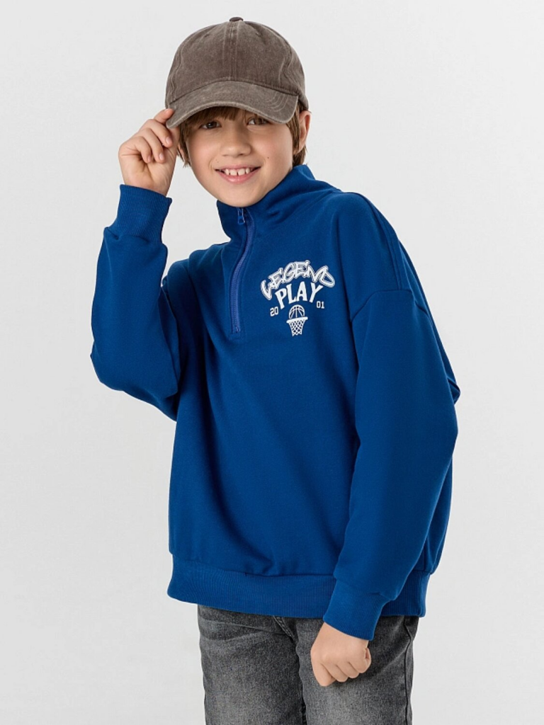 Свитшот свободного силуэта. Рукава длинные, втачные. Линия плеча спущена. Перед и спинка цельнокроенные. Горловина круглой формы с втачным воротником. По переду изделия застежка-молния. По низу рукавов и свитшота притаченые манжеты и пояс из рибаны.
