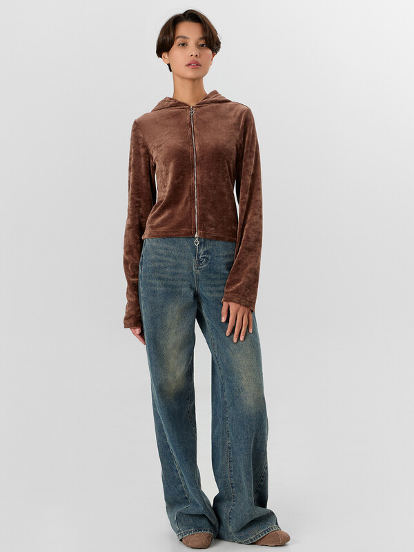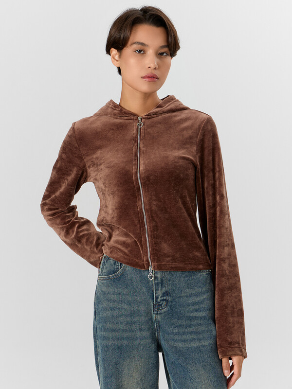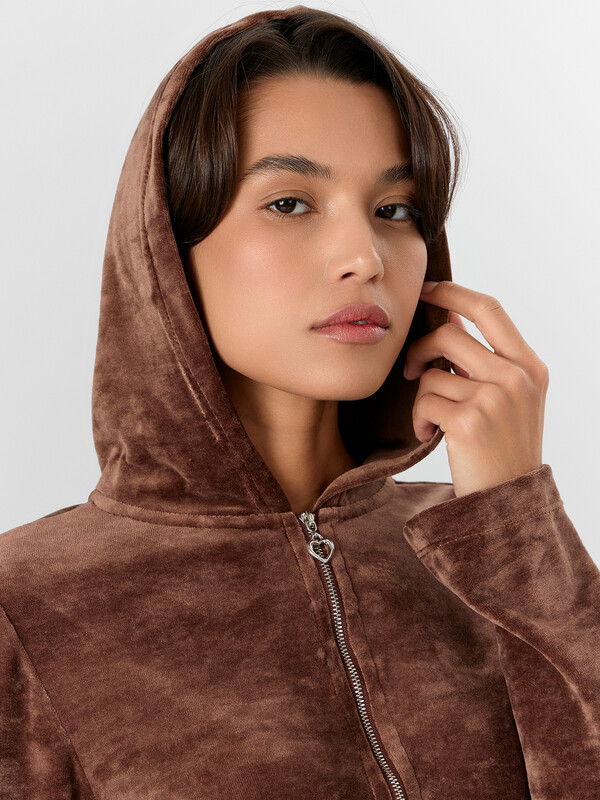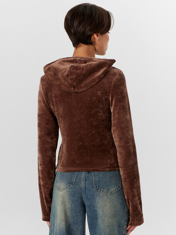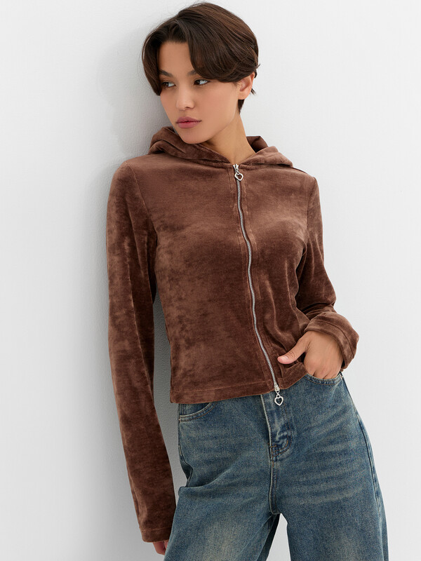 Женская велюровая толстовка полуприлегающего силуэта — это стильная и уютная модель, созданная для комфортных образов в прохладное время года. Укороченная длина подчеркивает актуальность дизайна и делает изделие идеальным для сочетания с брюками или джинсами с высокой посадкой. Круглая горловина переходит в капюшон, который дополнен подкладкой из мягкой кулирки — это не только эстетично, но и практично, особенно в ветреную погоду. Центральная застежка на тесьму-молнию обеспечивает удобство в носке и позволяет легко регулировать степень открытости. Длинные рукава и нижние срезы изделия обработаны швом вподгибку, что подчеркивает аккуратность исполнения и сохраняет форму после стирок. Велюровая ткань дарит приятные тактильные ощущения, обладает легким блеском и хорошо сохраняет тепло, делая толстовку идеальной для домашних образов, прогулок или расслабленного городского стиля.