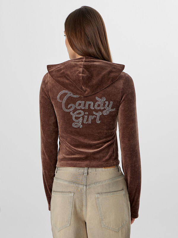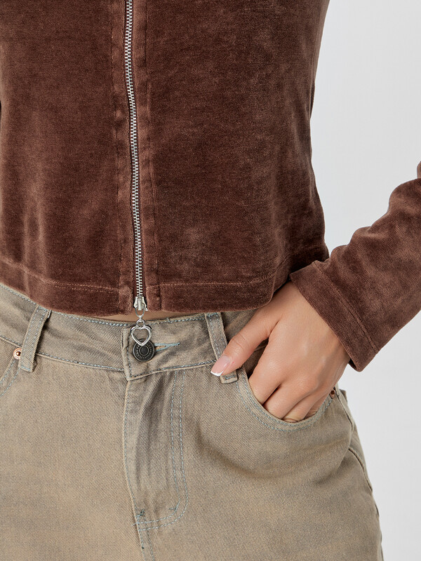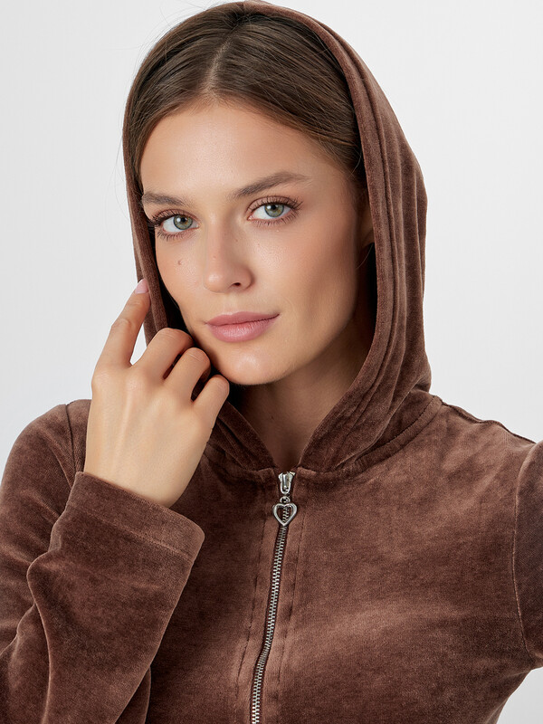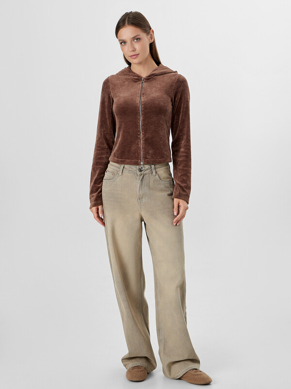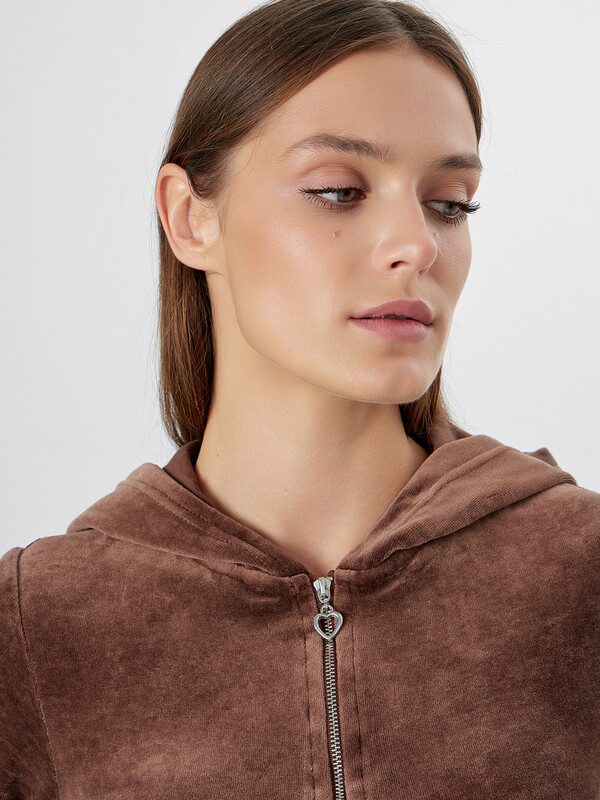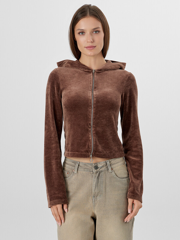 Женская велюровая толстовка полуприлегающего силуэта — это стильная и уютная модель, созданная для комфортных образов в прохладное время года. Укороченная длина подчеркивает актуальность дизайна и делает изделие идеальным для сочетания с брюками или джинсами с высокой посадкой. Круглая горловина переходит в капюшон, который дополнен подкладкой из мягкой кулирки — это не только эстетично, но и практично, особенно в ветреную погоду. Центральная застежка на тесьму-молнию обеспечивает удобство в носке и позволяет легко регулировать степень открытости. Длинные рукава и нижние срезы изделия обработаны швом вподгибку, что подчеркивает аккуратность исполнения и сохраняет форму после стирок. Велюровая ткань дарит приятные тактильные ощущения, обладает легким блеском и хорошо сохраняет тепло, делая толстовку идеальной для домашних образов, прогулок или расслабленного городского стиля.