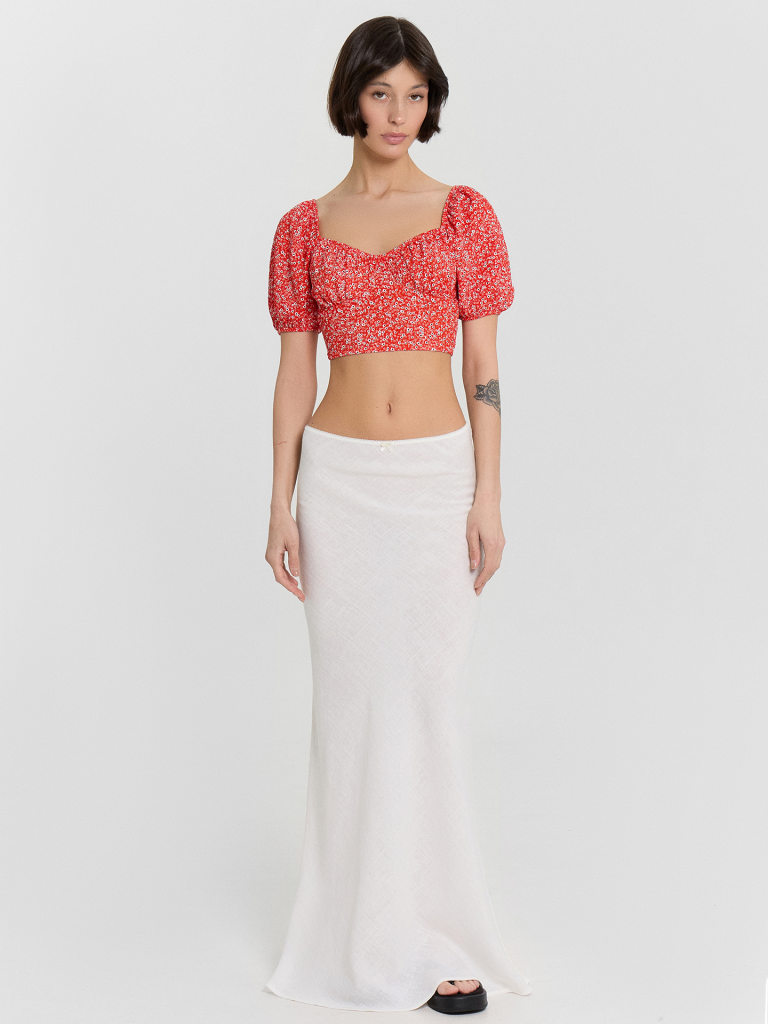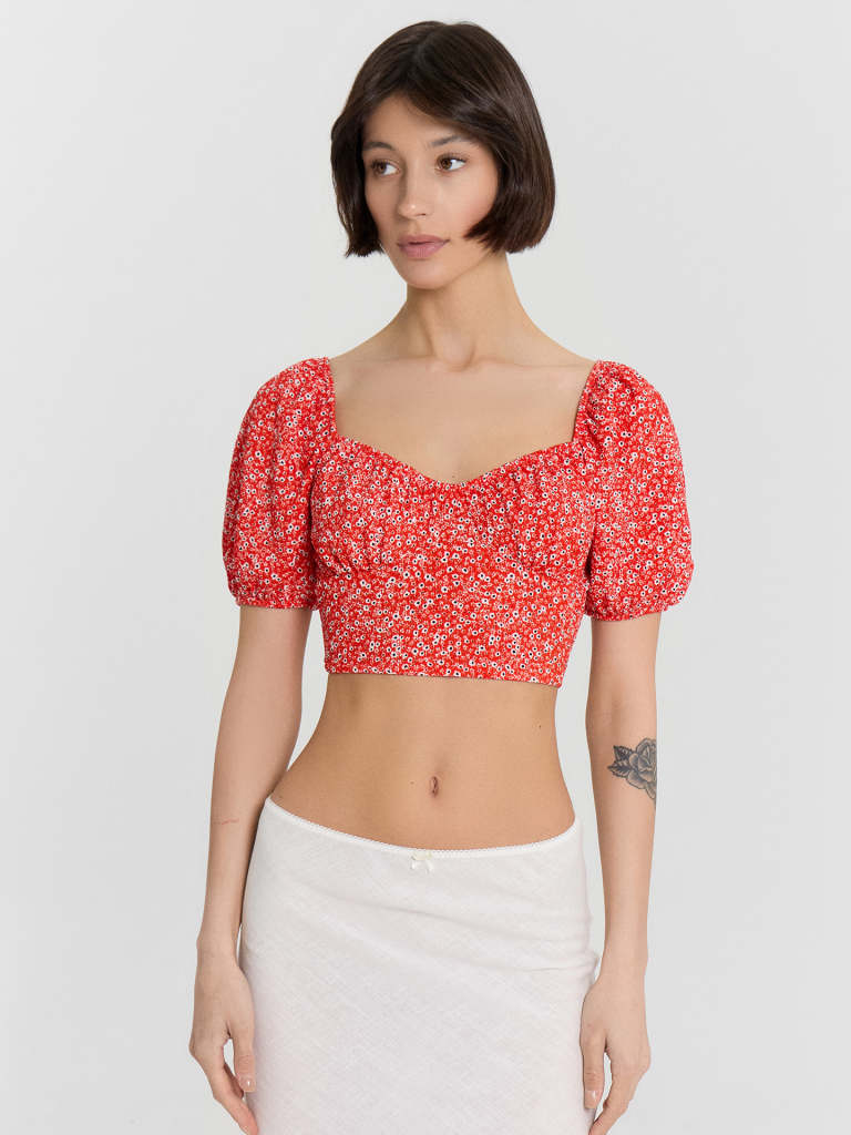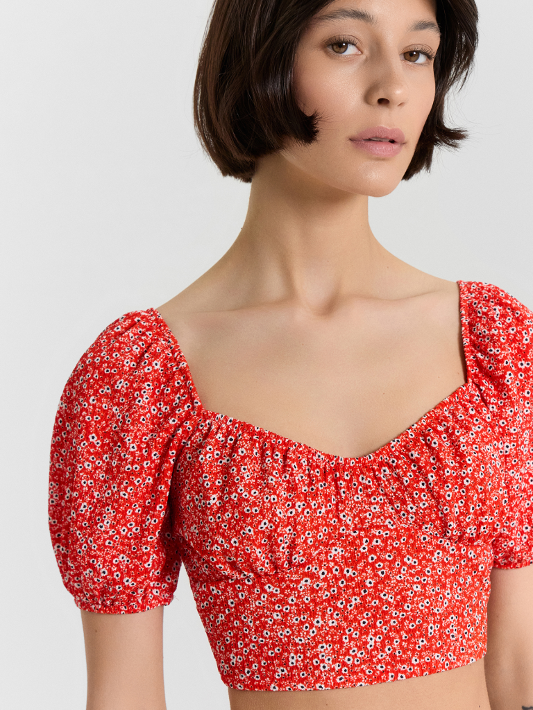 Этот женский укороченный топ — воплощение изящности и нежности, созданный для стильных и легких образов. Короткие объемные рукава, обработанные эластичной тесьмой, добавляют романтичности и воздушности, а глубокий вырез горловины с изящной сборкой подчеркивает женственность. Отрезной лиф и сборка под грудью создают красивый силуэт, который гармонично дополняется глубоким вырезом на спинке. Нижний край обработан швом вподгибку с эластичной тесьмой, что обеспечивает идеальную посадку. Изделие выполнено из ткани рашель — материала, отличающегося легкостью, мягкостью и элегантной текстурой. Этот топ идеально подойдет для стильных летних образов, вечерних выходов или романтичных встреч, даря комфорт и красоту в каждом движении.