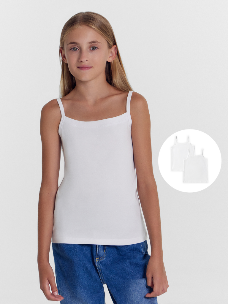 Лаконичная майка на бретелях для девочек мультипак (2 шт.) в базовом цвете. Изготовлена из натурального хлопкового полотна. Силуэт прилегающий, длина до середины бедер. Универсальная и очень практичная майка, которую можно носить как самостоятельную вещь или использовать как нательное белье. Комфортная модель топа, который должен быть в гардеробе каждой девочки!