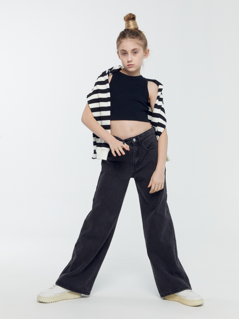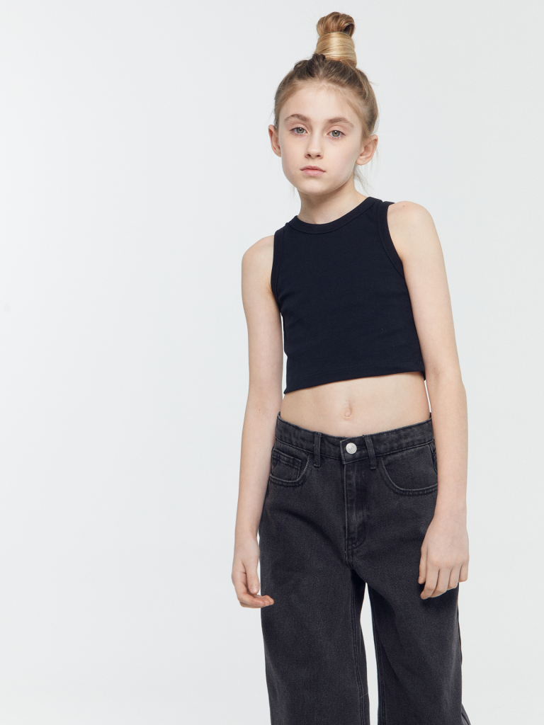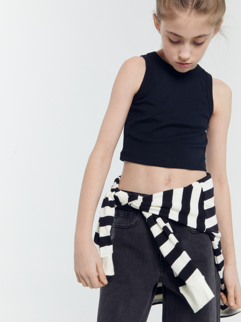 Топ прилегающего силуэта из высококачественного хлопка с добавлением эластана. Горловина круглой формы, без рукавов. По низу изделия проходит эластичная тесьма. Стильная модель, которая отлично подходит для каждодневной носки, на спорт, танцы, прогулку с друзьями. Материал изделия натуральный, мягкий, отлично тянется и дарит свободу движений. Дополнить такой топ можно любым низом на ваш вкус из линейки детской базовой одежды. Рекомендуем для создания лаконичных образов для девочек!