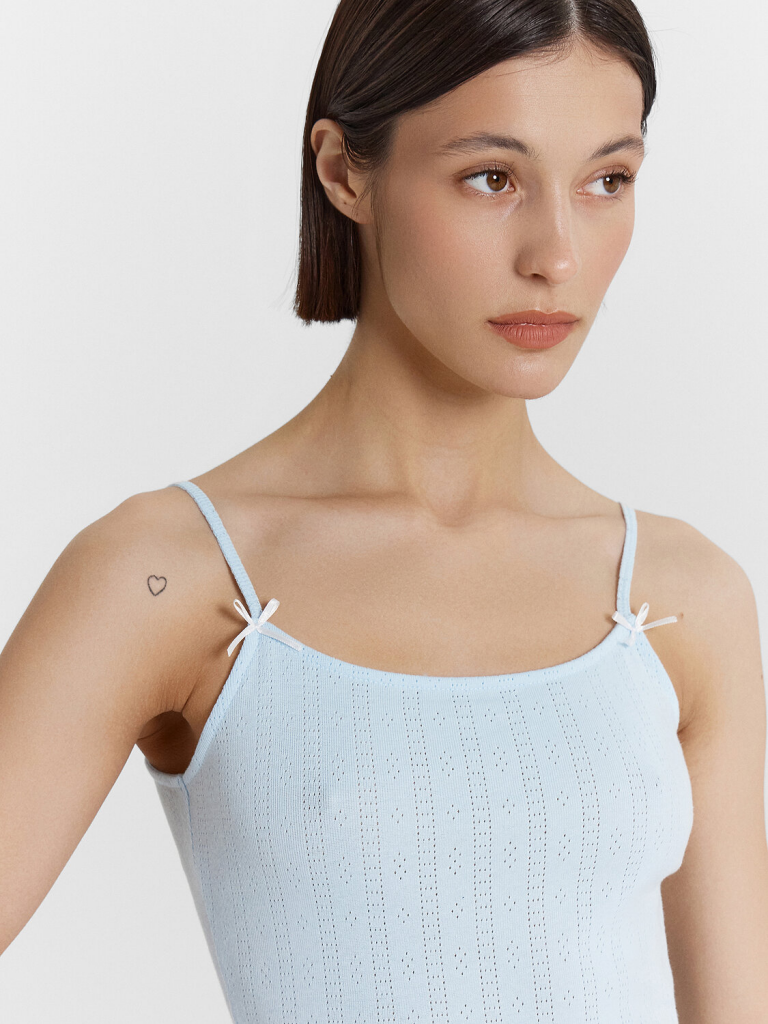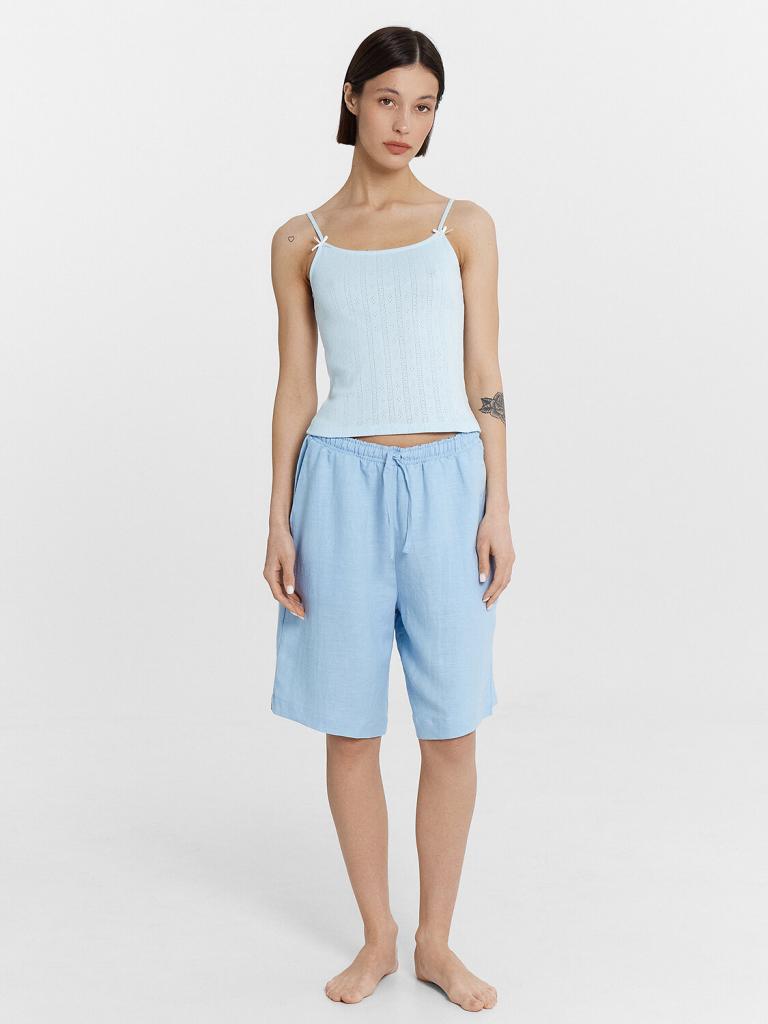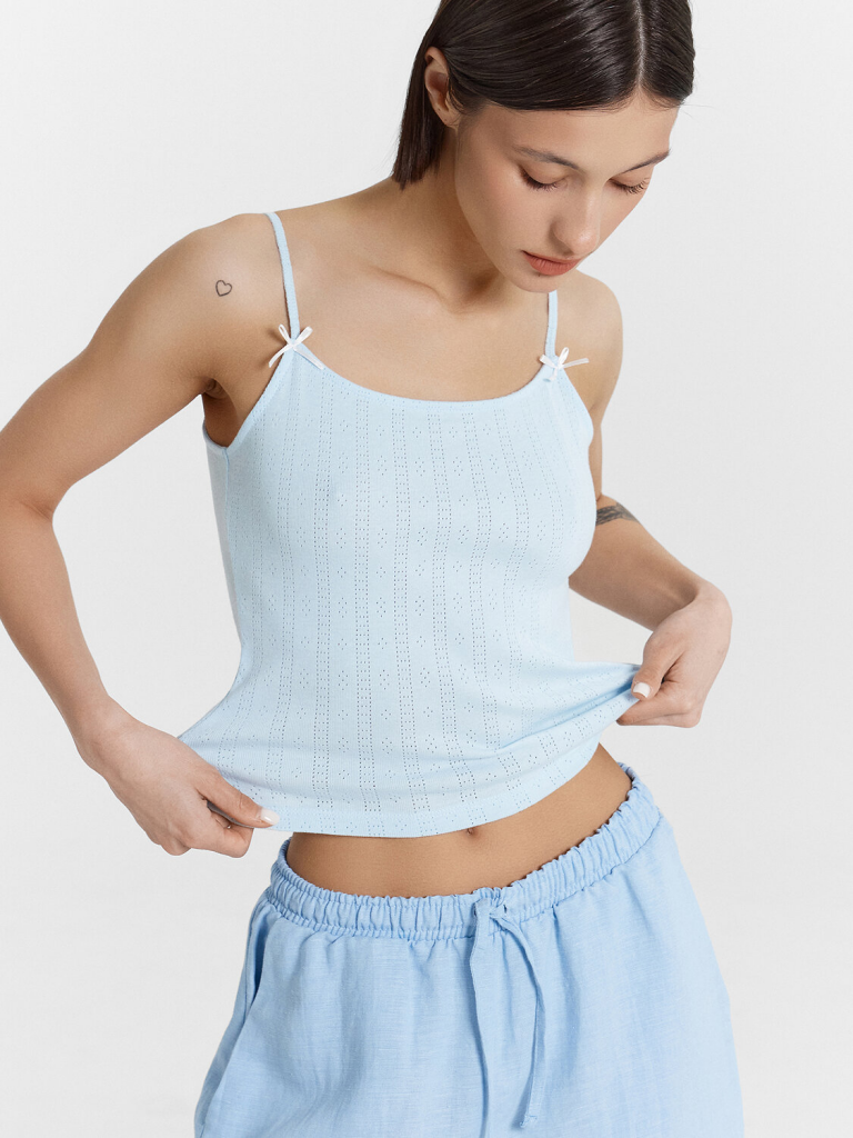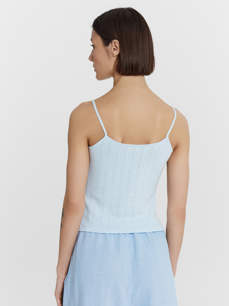 Топ прилегающего силуэта. Верхний край изделия обработан бейкой, переходящей в бретели. Низ изделия обработан в подгибку.