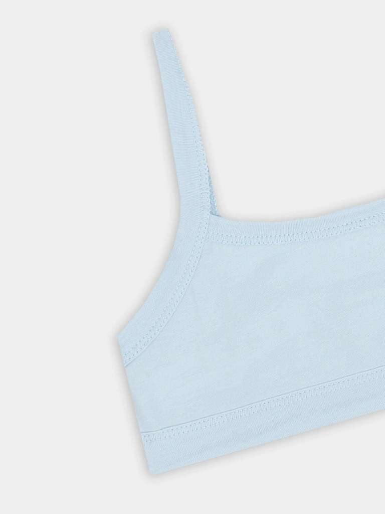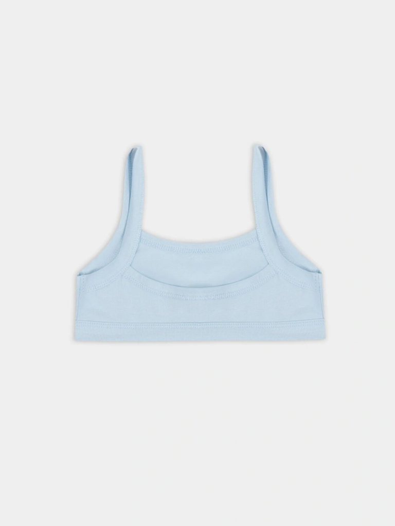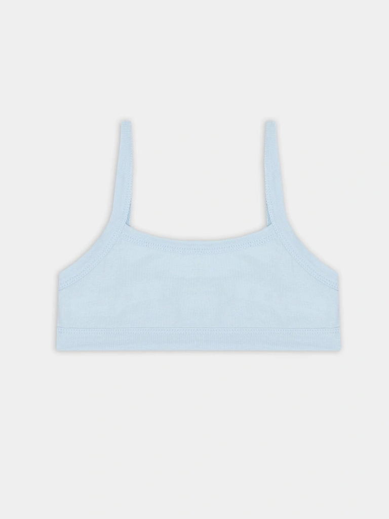 Голубой топ для девочек — это нежный и удобный вариант для повседневной носки. Модель прилегающего силуэта на бретелях мягко облегает фигуру, обеспечивая комфорт и свободу движений. Передняя и задняя части изделия цельнокроеные, что создает гладкую поверхность без раздражающих швов.