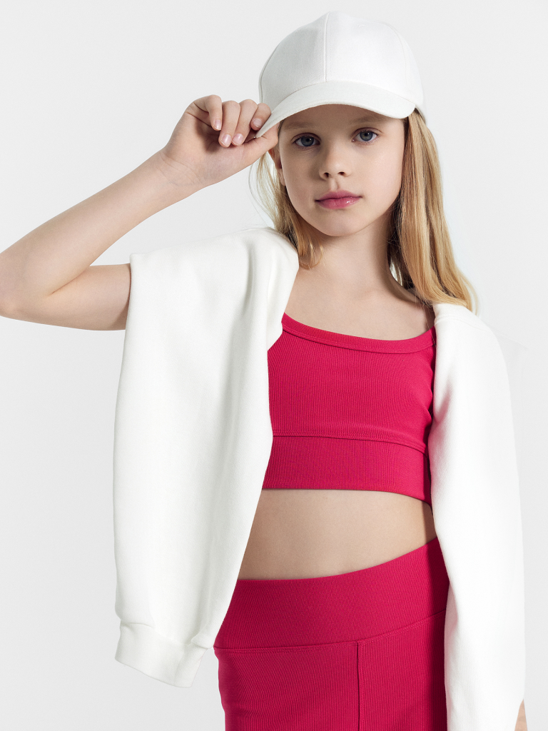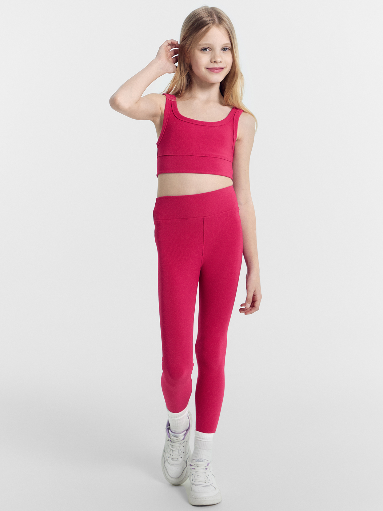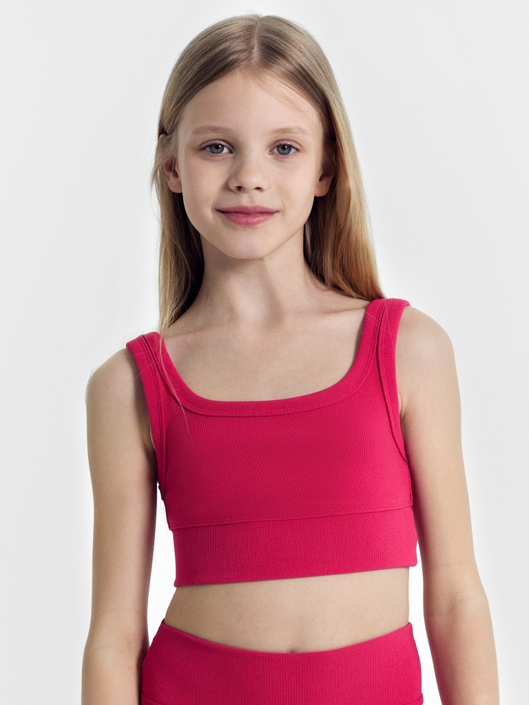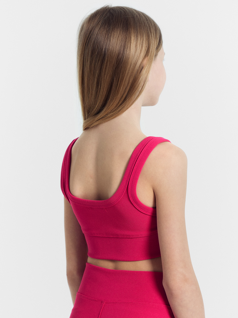 Стильный топ для девочек для занятий спортом. Модель облегающего силуэта, укороченая. Горловина формы каре. Детский топ выполнен из высококачественного хлопка. По нижнему срезу - отрезной пояс из основного полотна. На детали спинки настрочена фирменная вешалка. Его можно носить не только на спорт, но и применить в повседневных образах. Он легко сочетается со спортивными штанами, легинсами и джинсами, позволяя маленькой спортсменке выглядеть модно в любой ситуации. Рекомендуем!