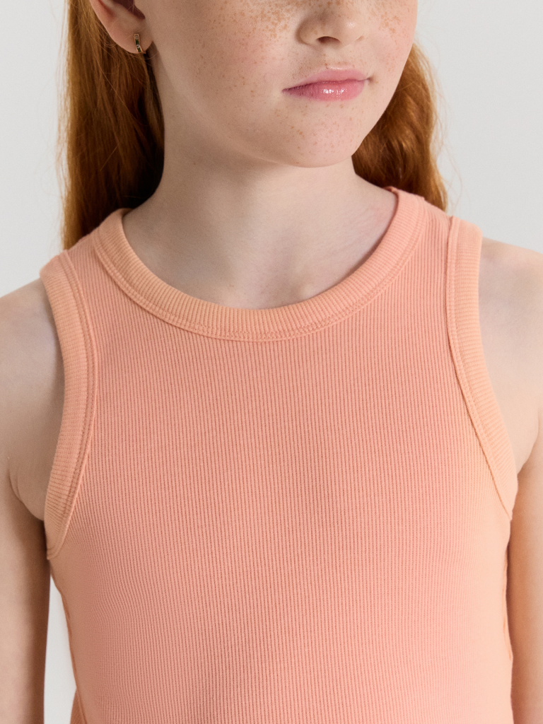 Топ для девочек прилегающего силуэта. Горловина круглая. Проймы и горловина окантованы бейкой из основного полотна. Низ изделия обработан швом в подгибку.