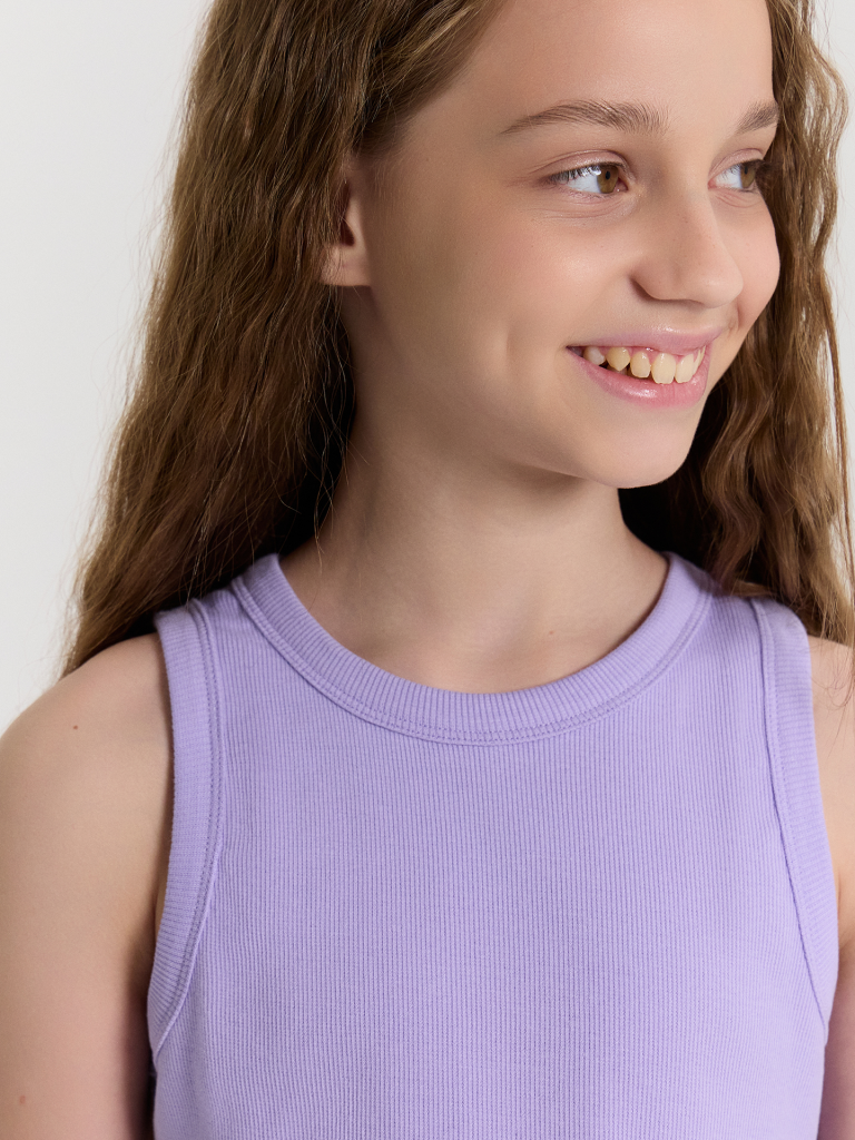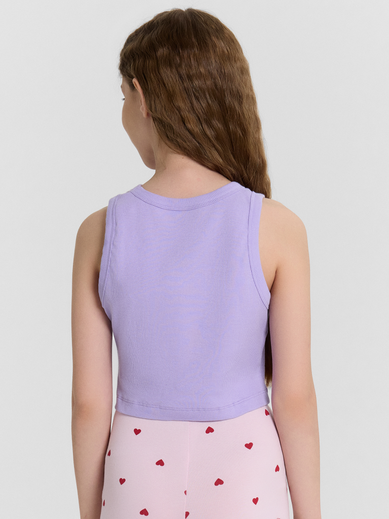 Топ для девочек прилегающего силуэта. Горловина круглая. Проймы и горловина окантованы бейкой из основного полотна. Низ изделия обработан швом в подгибку.