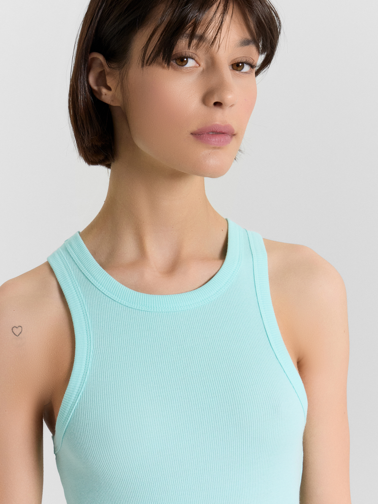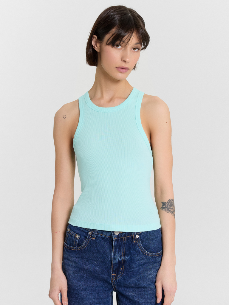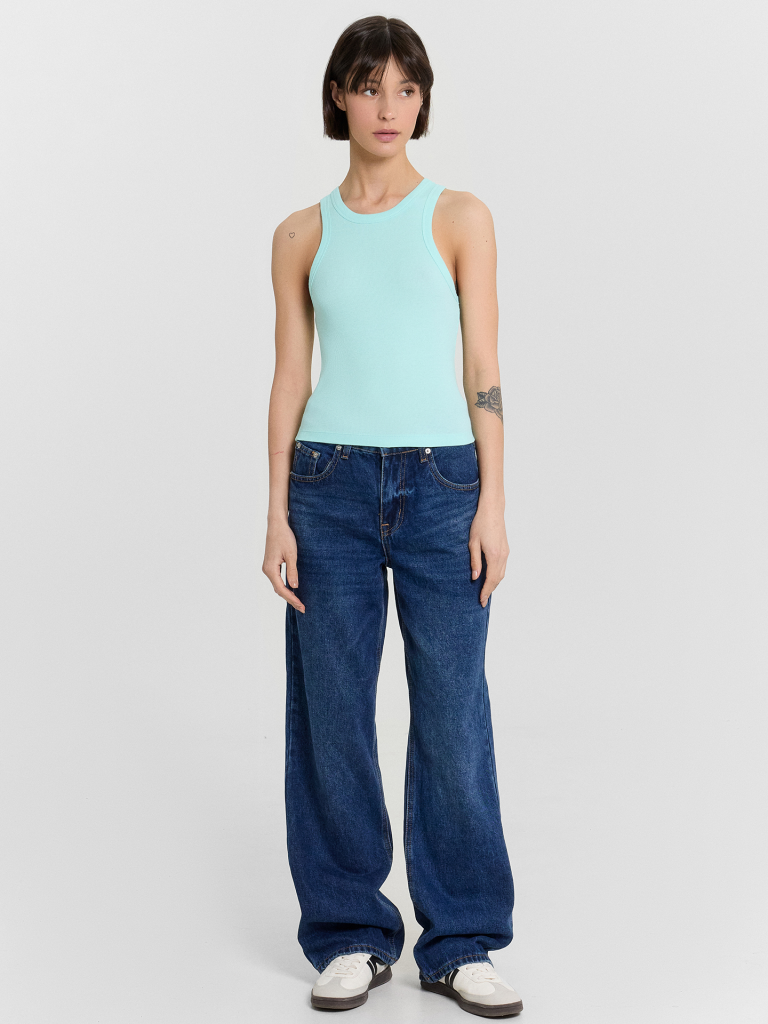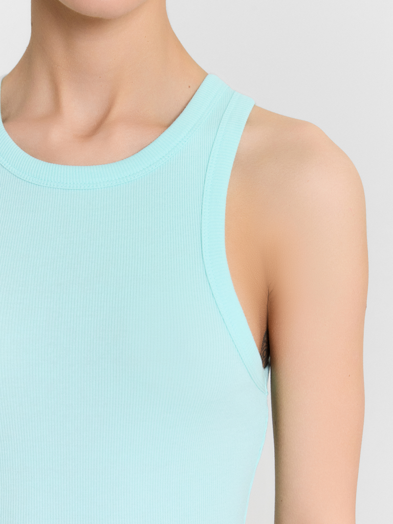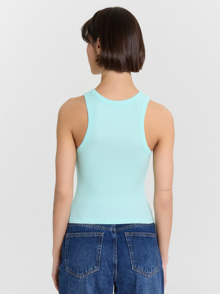 Нижний срез топа обработан швом вподгибку на 2х иглольной плоскошовной машине.