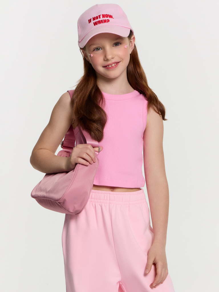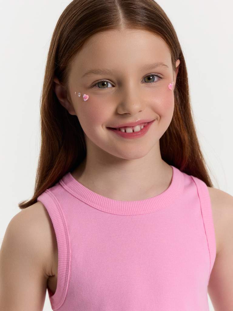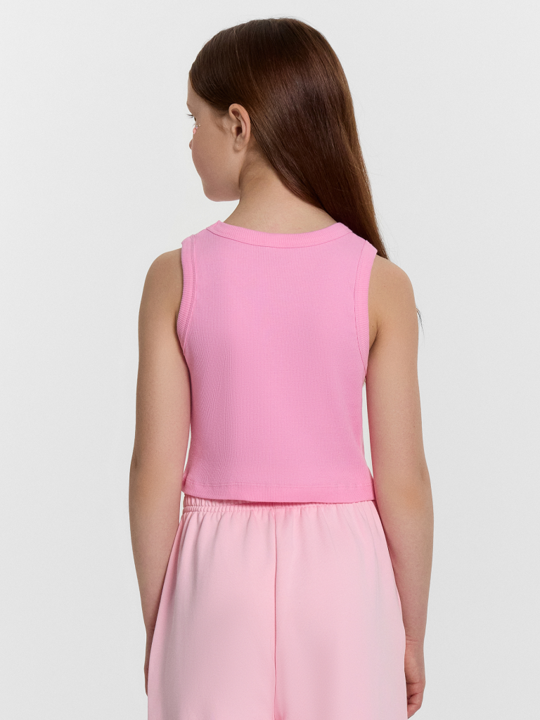 Топ для девочек прилегающего силуэта. Горловина круглая. Проймы и горловина окантованы бейкой из основного полотна. Низ изделия обработан швом в подгибку.