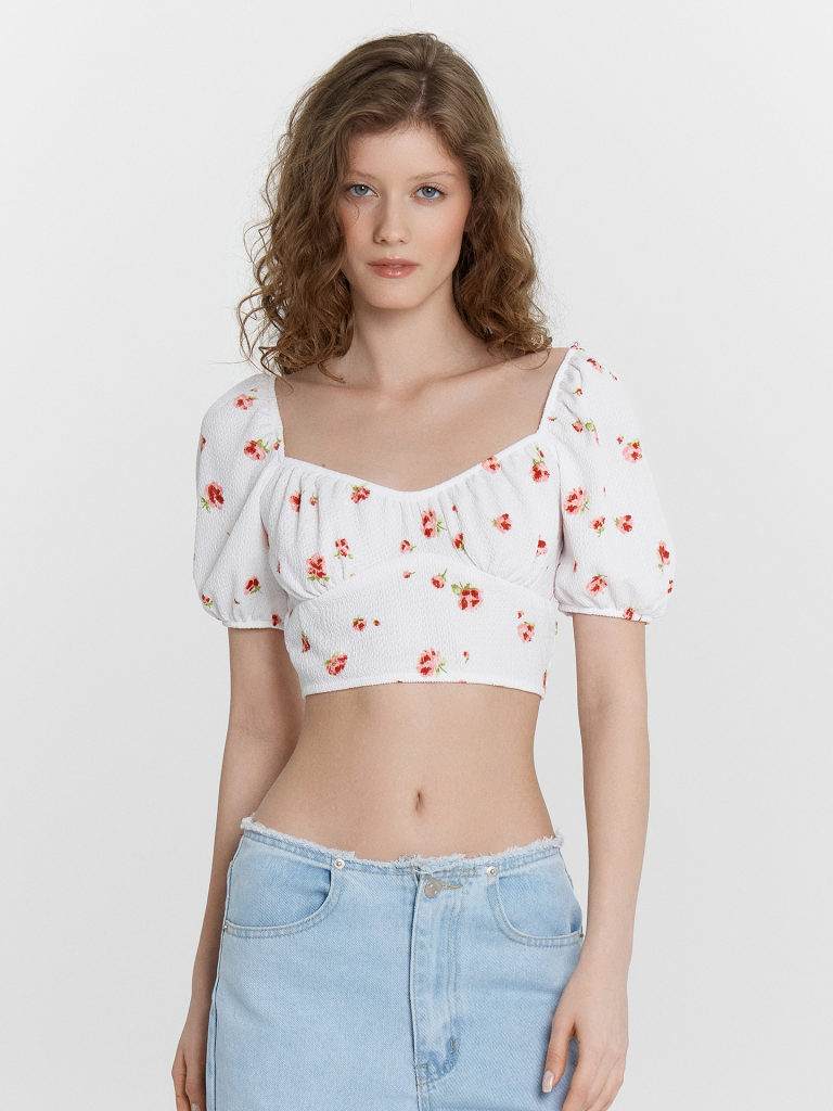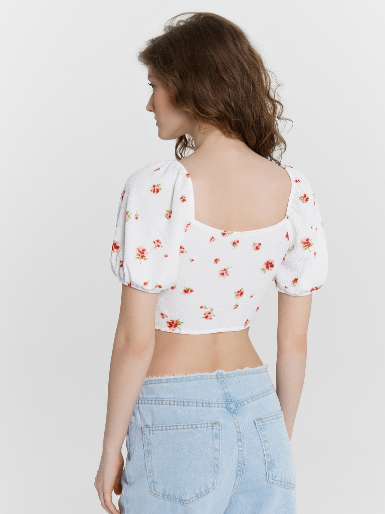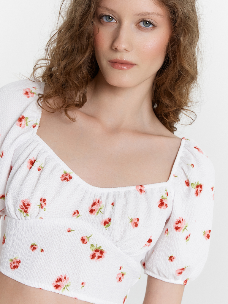 Этот женский укороченный топ — воплощение изящности и нежности, созданный для стильных и легких образов. Короткие объемные рукава, обработанные эластичной тесьмой, добавляют романтичности и воздушности, а глубокий вырез горловины с изящной сборкой подчеркивает женственность. Отрезной лиф и сборка под грудью создают красивый силуэт, который гармонично дополняется глубоким вырезом на спинке. Нижний край обработан швом вподгибку с эластичной тесьмой, что обеспечивает идеальную посадку. Изделие выполнено из ткани рашель — материала, отличающегося легкостью, мягкостью и элегантной текстурой. Этот топ идеально подойдет для стильных летних образов, вечерних выходов или романтичных встреч, даря комфорт и красоту в каждом движении.