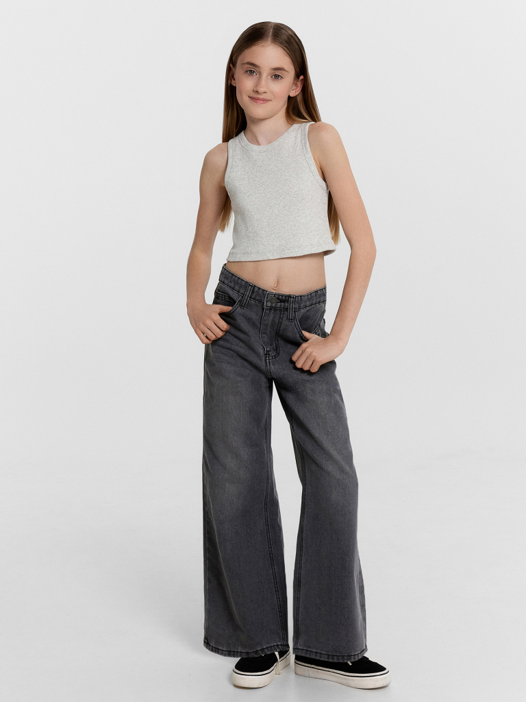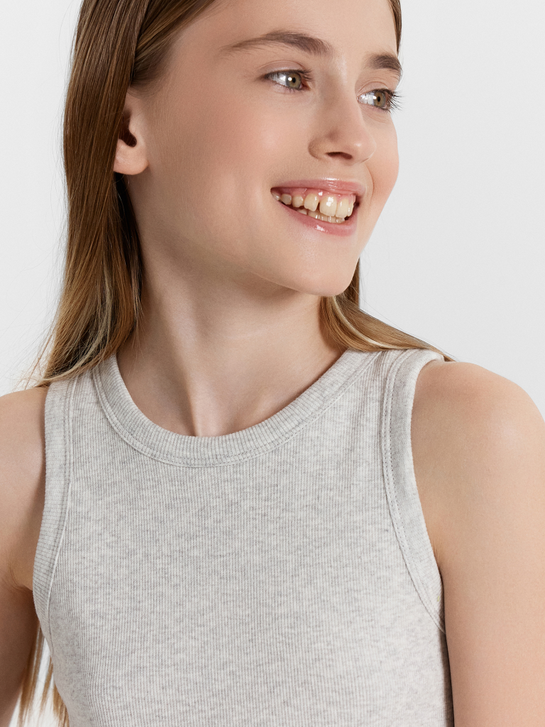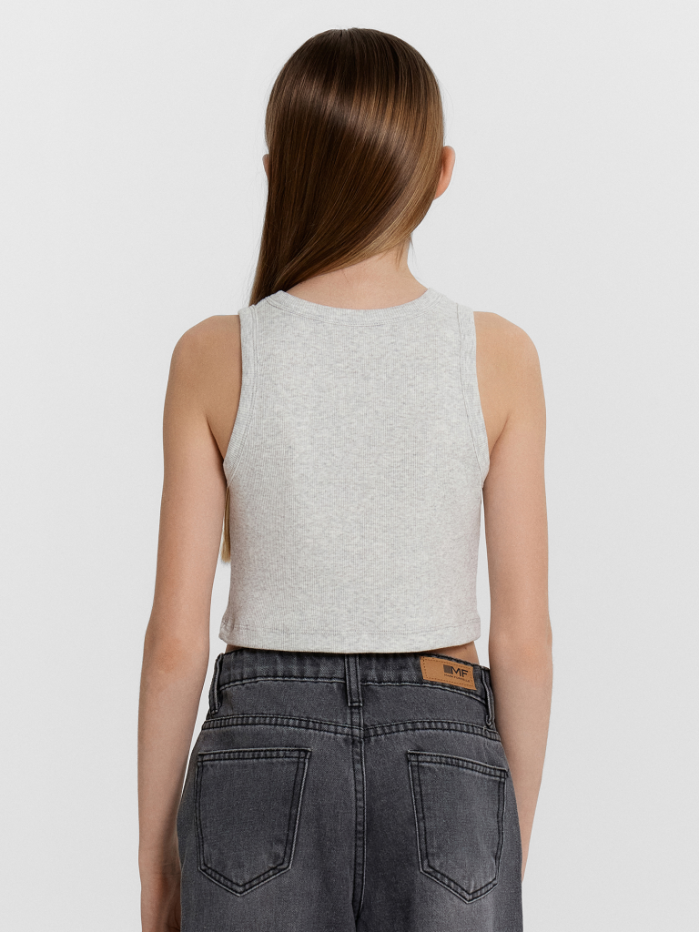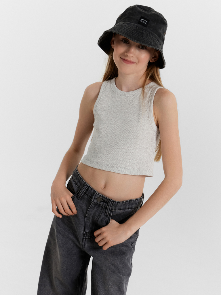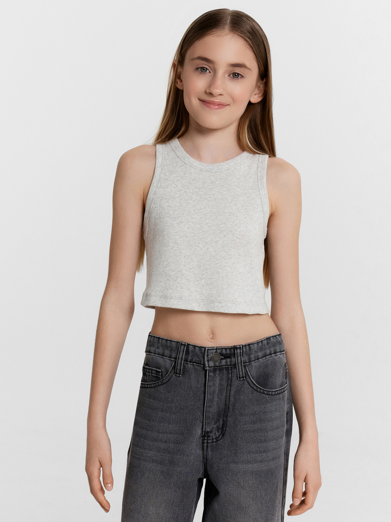 Топ для девочек прилегающего силуэта. Горловина круглая. Проймы и горловина окантованы бейкой из основного полотна. Низ изделия обработан швом в подгибку.