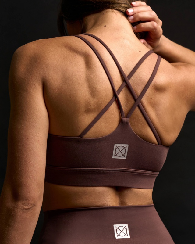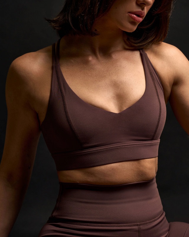 Топ спортивный с рельефными швами по груди, v-образным вырезом и двойными завязками -спагетти переплетенные на спине. Топ с мягкими съемными чашками.