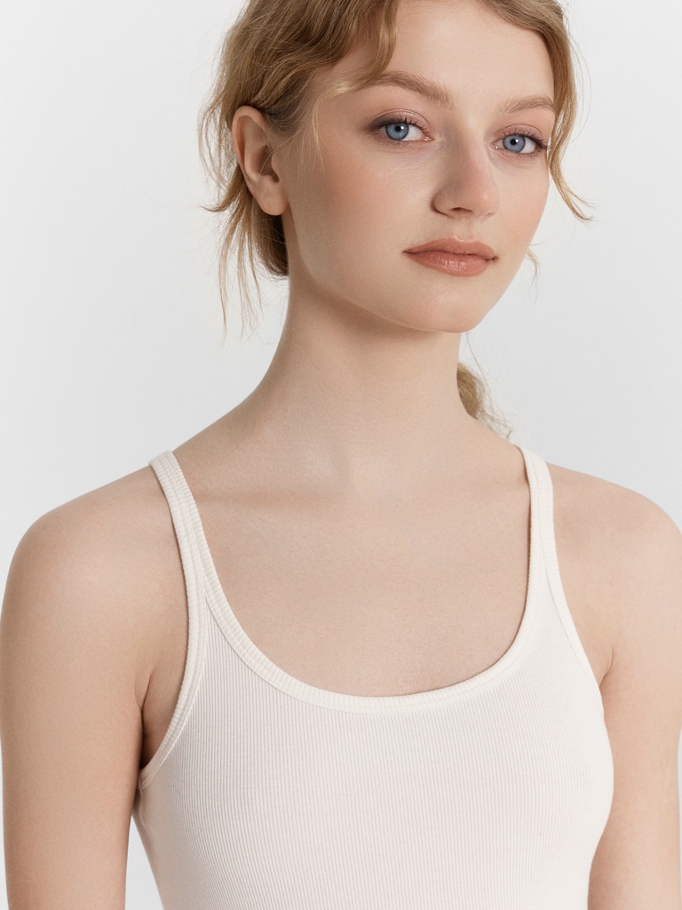 Горловина округлой формы, бретели тонкие. Срезы горловины и проймы окантованы бейками из основного полотна.